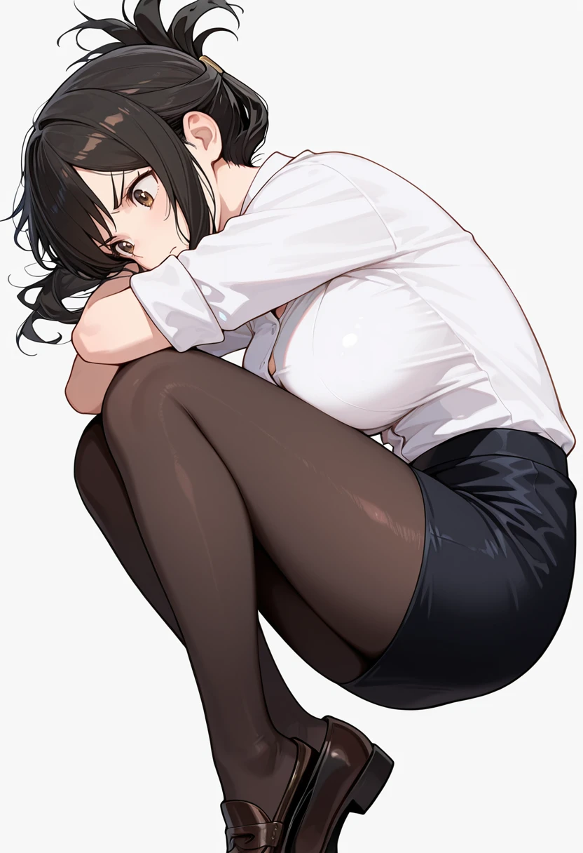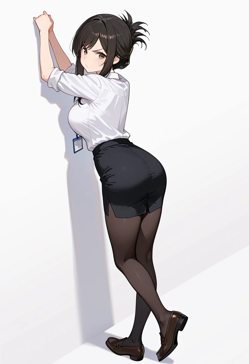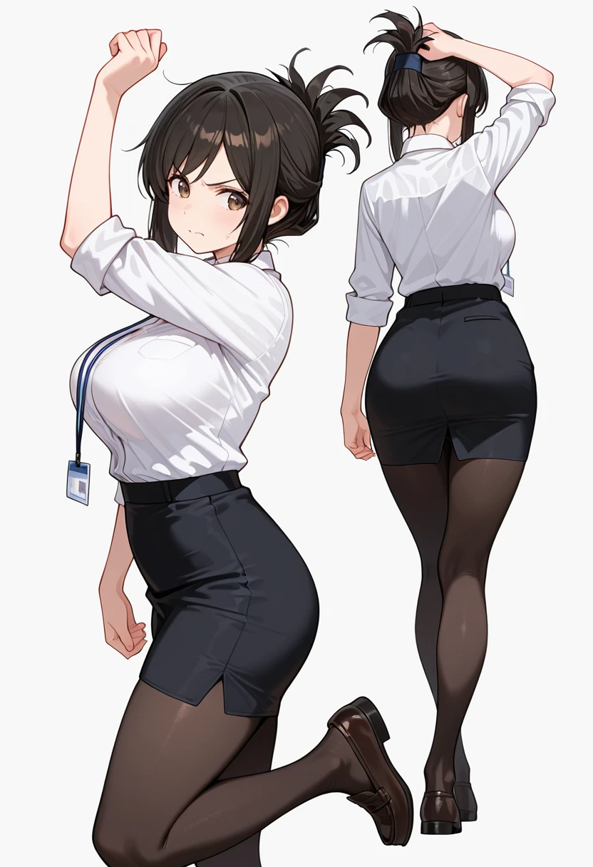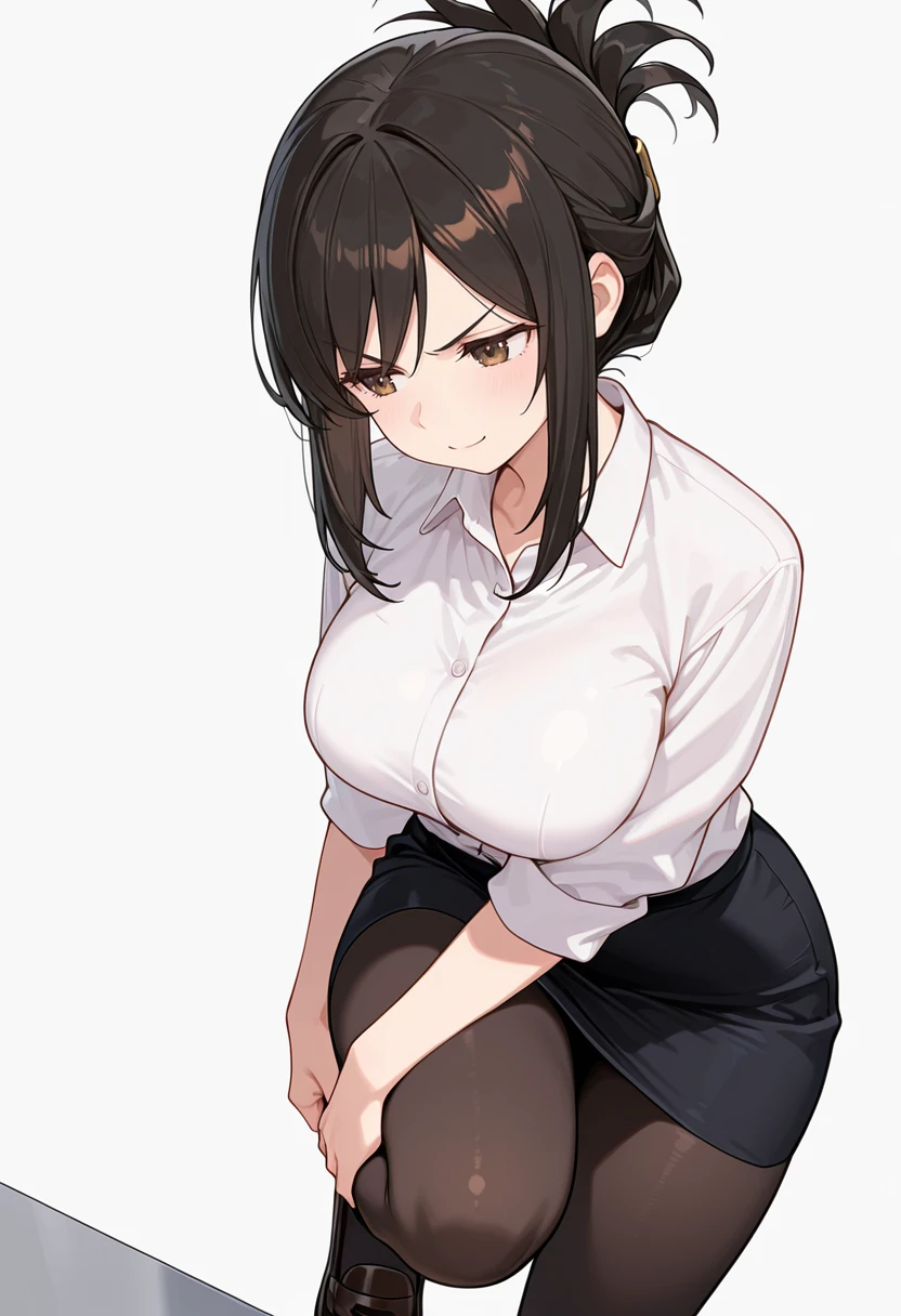white collared shirt, dress shirt,sleeves rolled up,pencil skirt,black pantyhose, office lady, Explanation and notes below👇