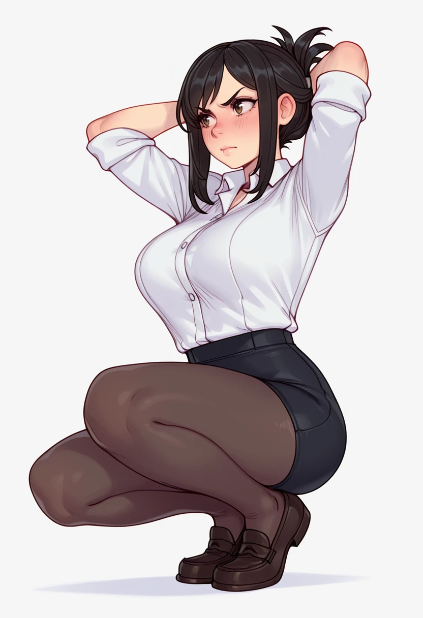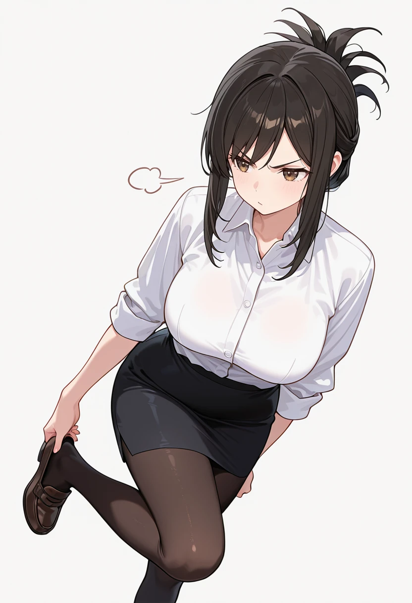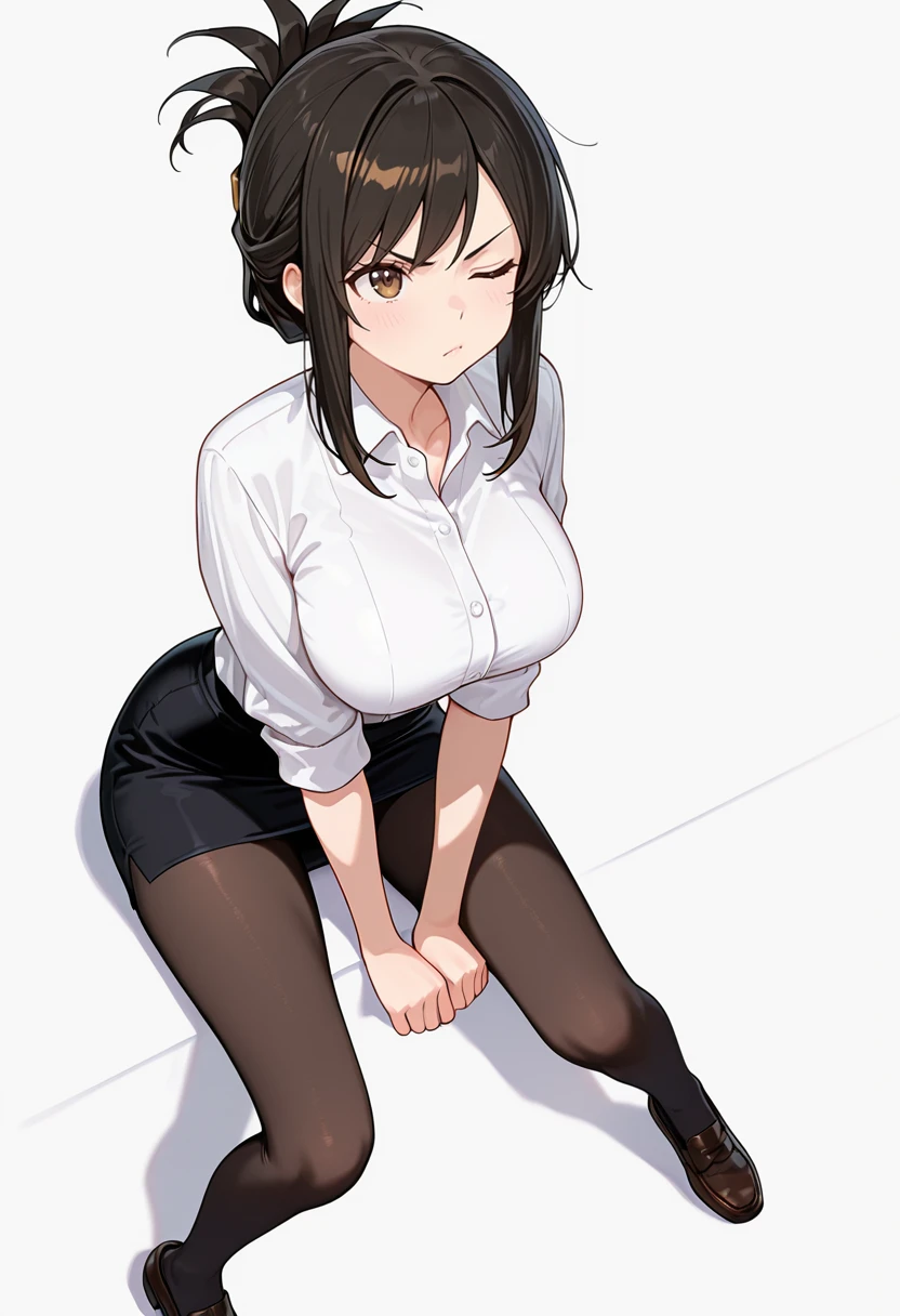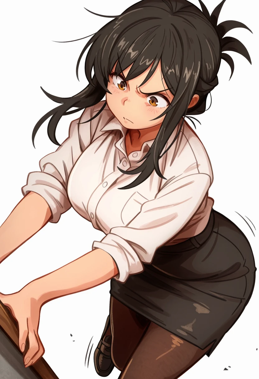 white collared shirt, dress shirt,sleeves rolled up,pencil skirt,black pantyhose, office lady, Explanation and notes below👇