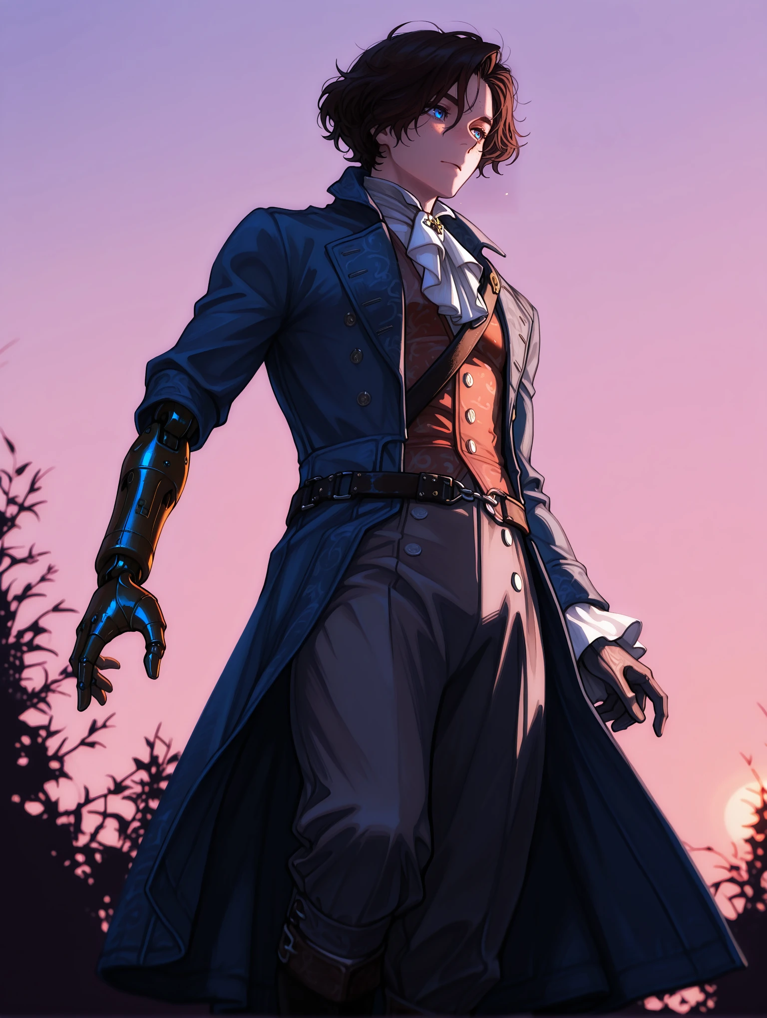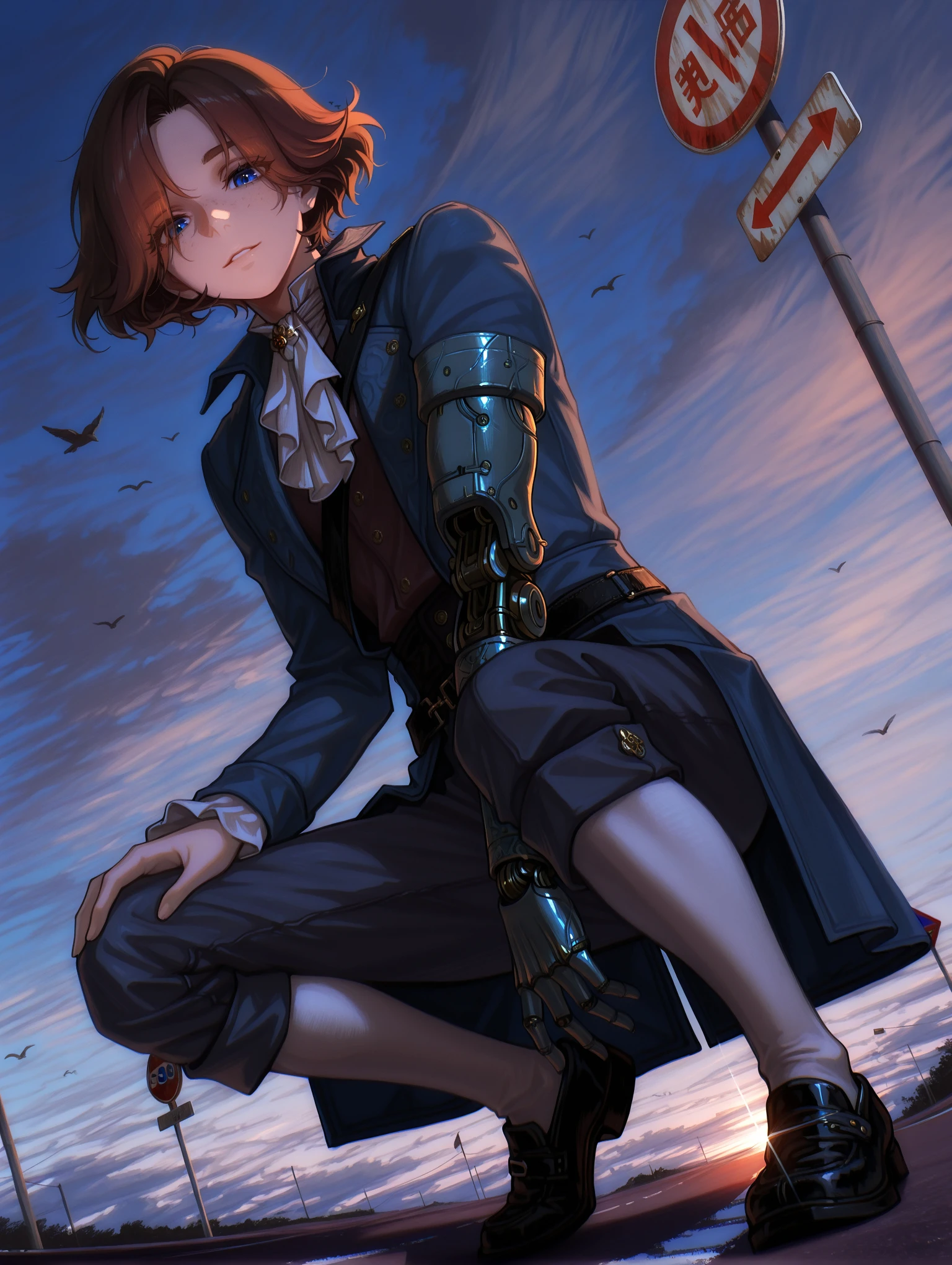 Pinocchio Prompts : 1boy, male, manly, blue eyes, black hair, short hair, freckles, prosthesis, single mechanical arm