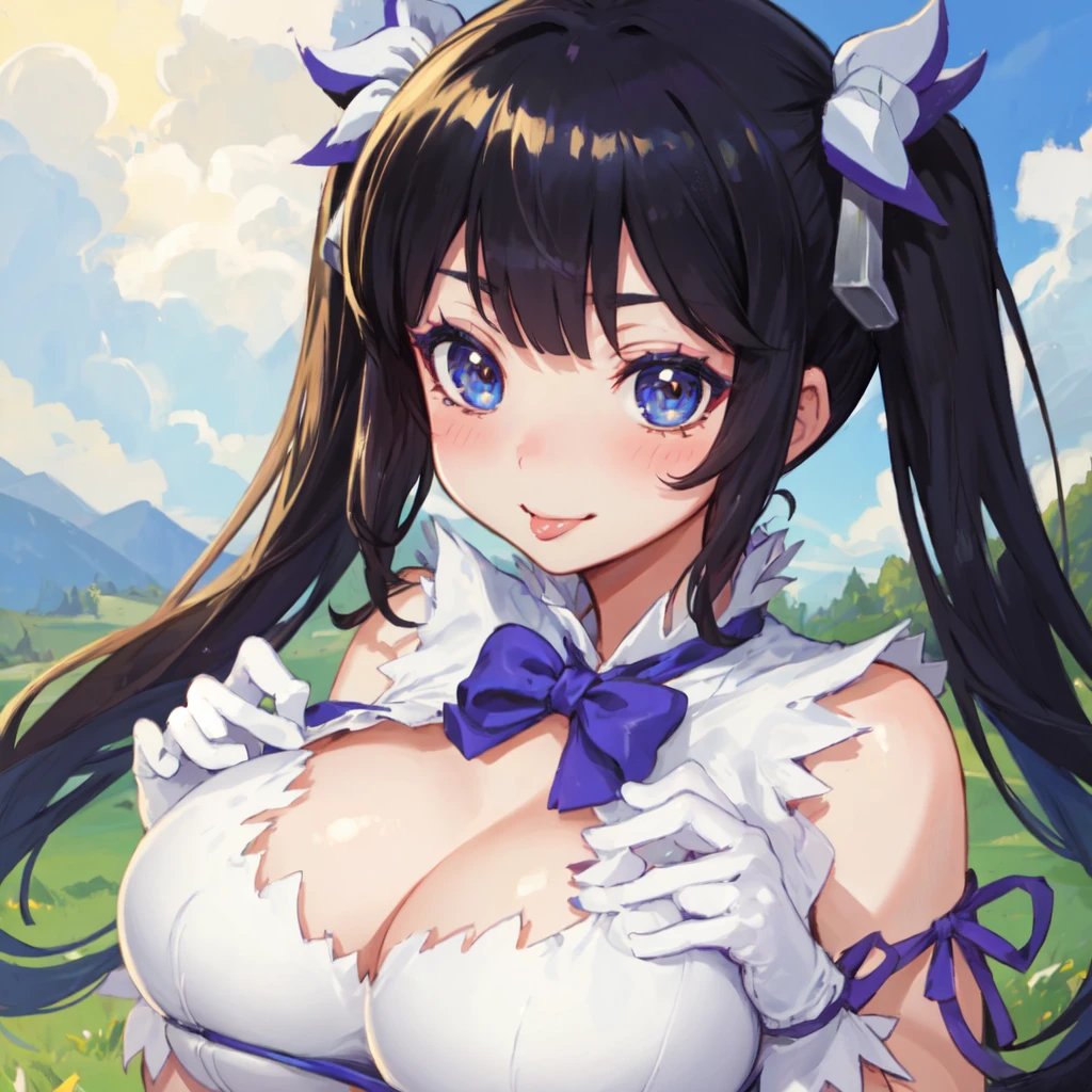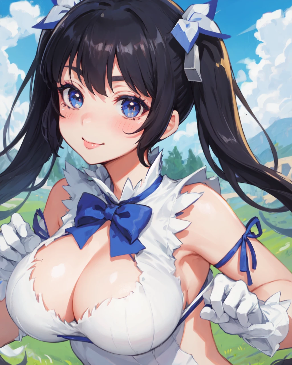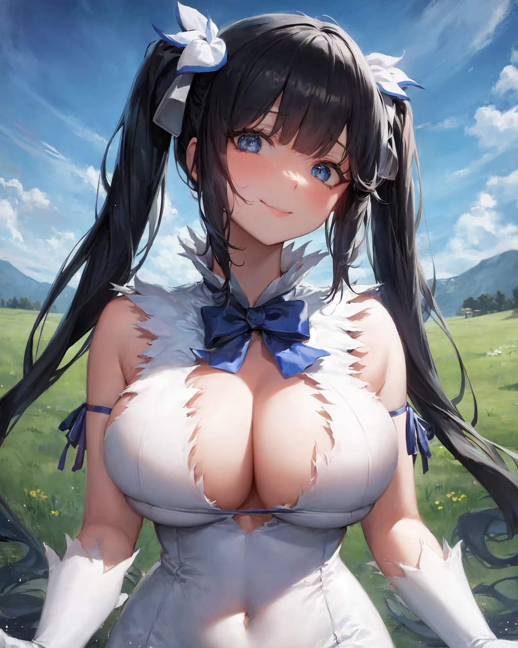 hestia (danmachi), breasts, long hair, blue ribbon, twintails, gloves, ribbon, dress, rei no himo, large breasts, blue eyes, black hair, white gloves, cleavage, white dress, hair ribbon, bow, sleeveless, sleeveless dress, bangs, cleavage cutout, hair ornament, bowtie, clothing cutout, very long hair, covered navel, arm ribbon
