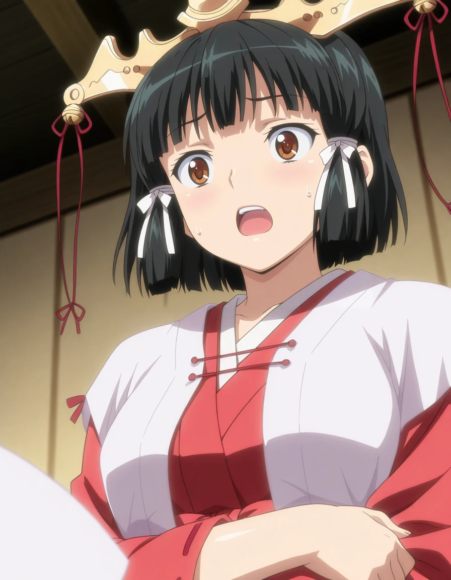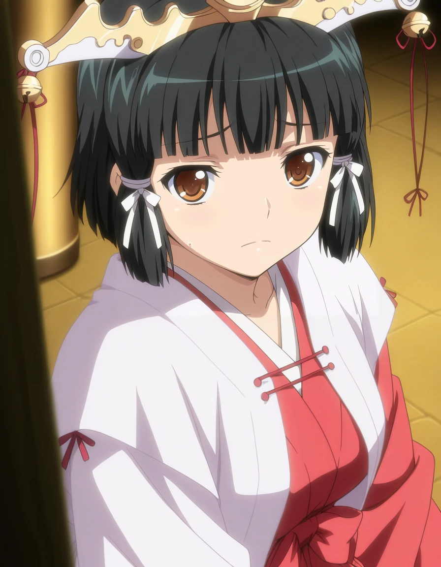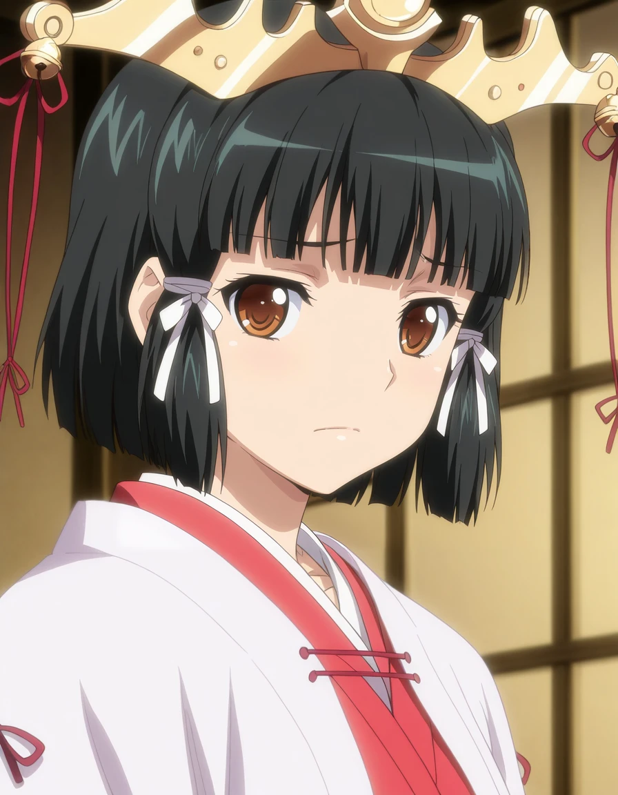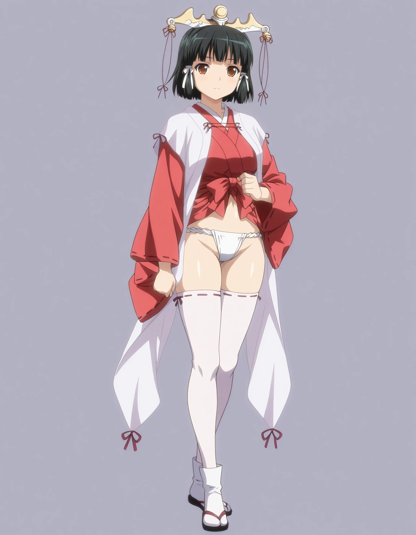 mai_kaguyak,short_hair,black_hair,brown_eyes,hair_ornament,miko,japanese_clothes,ribbon,jingle_bell,ribbon-trimmed_legwear,ribbon-trimmed_sleeves,,fundoshi,white_thighhighsRecommend preferred Strength: 0.7~1.