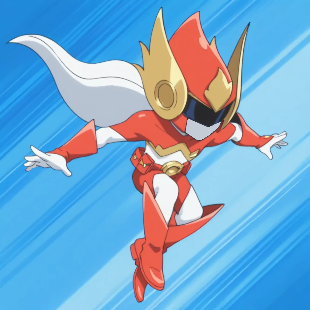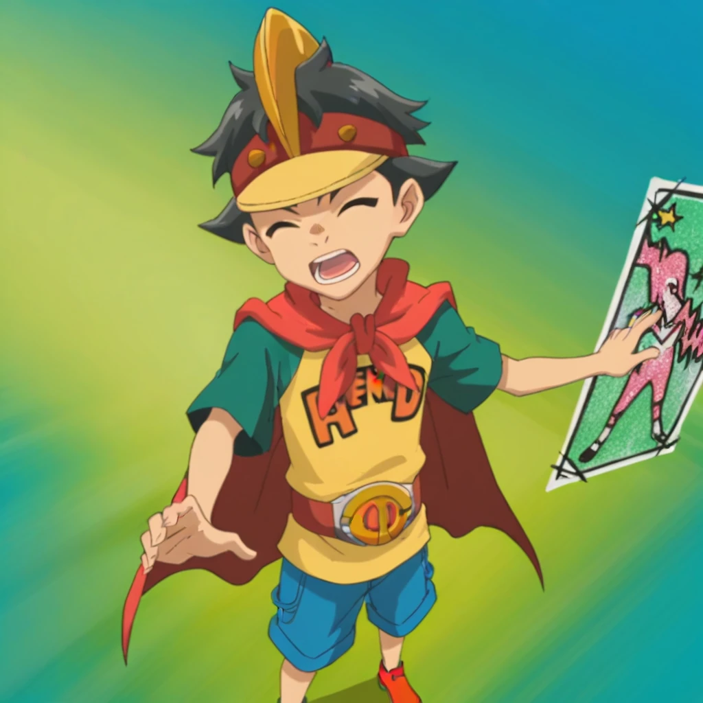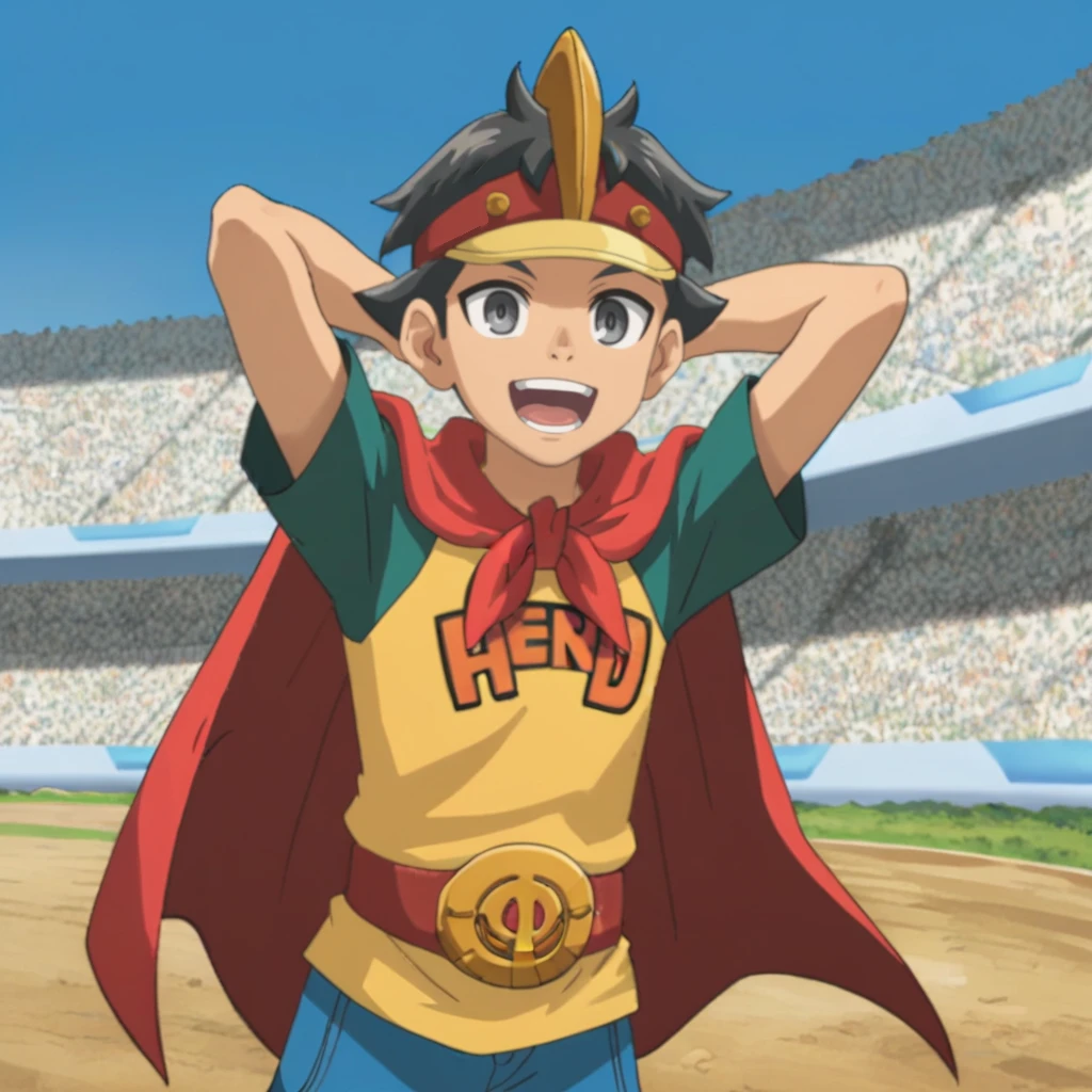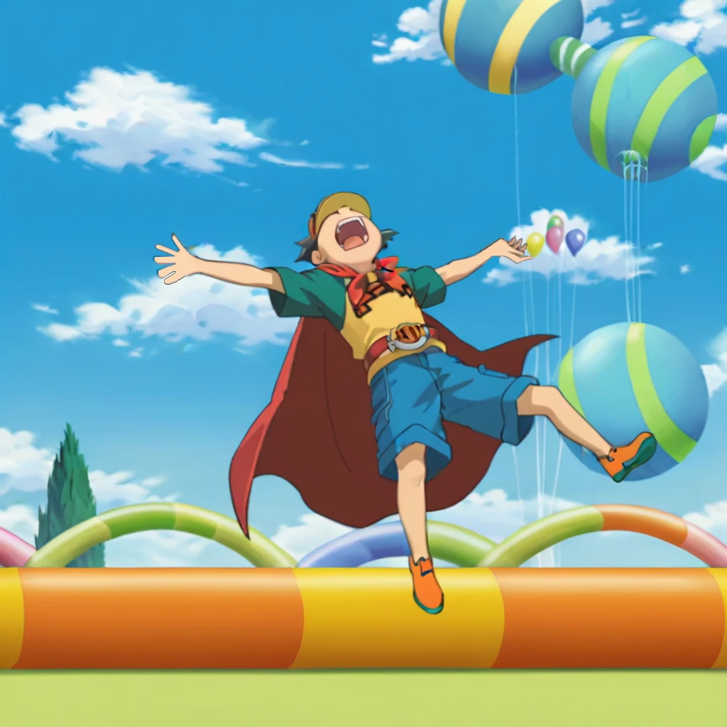 Prompts: male, grey hair, visor cap, grey eyes, shirt, print shirt, HERO, short sleeves, red cape, belt, blue shorts, orange footwear, indoors (arena/racetrack/sand/pillar/forest/audience), outdoors (amusement park/sky/cloud/grass/bush/tree/balloons/colored domes/railing), blue background