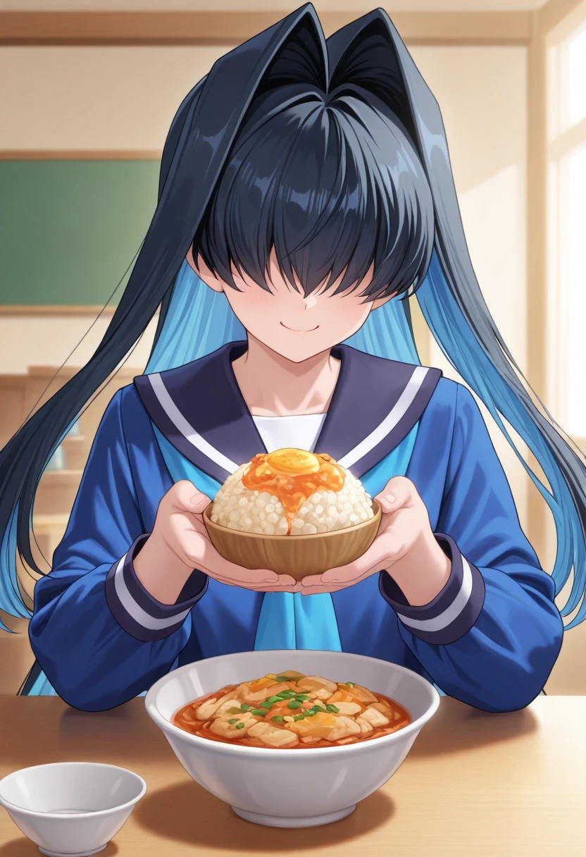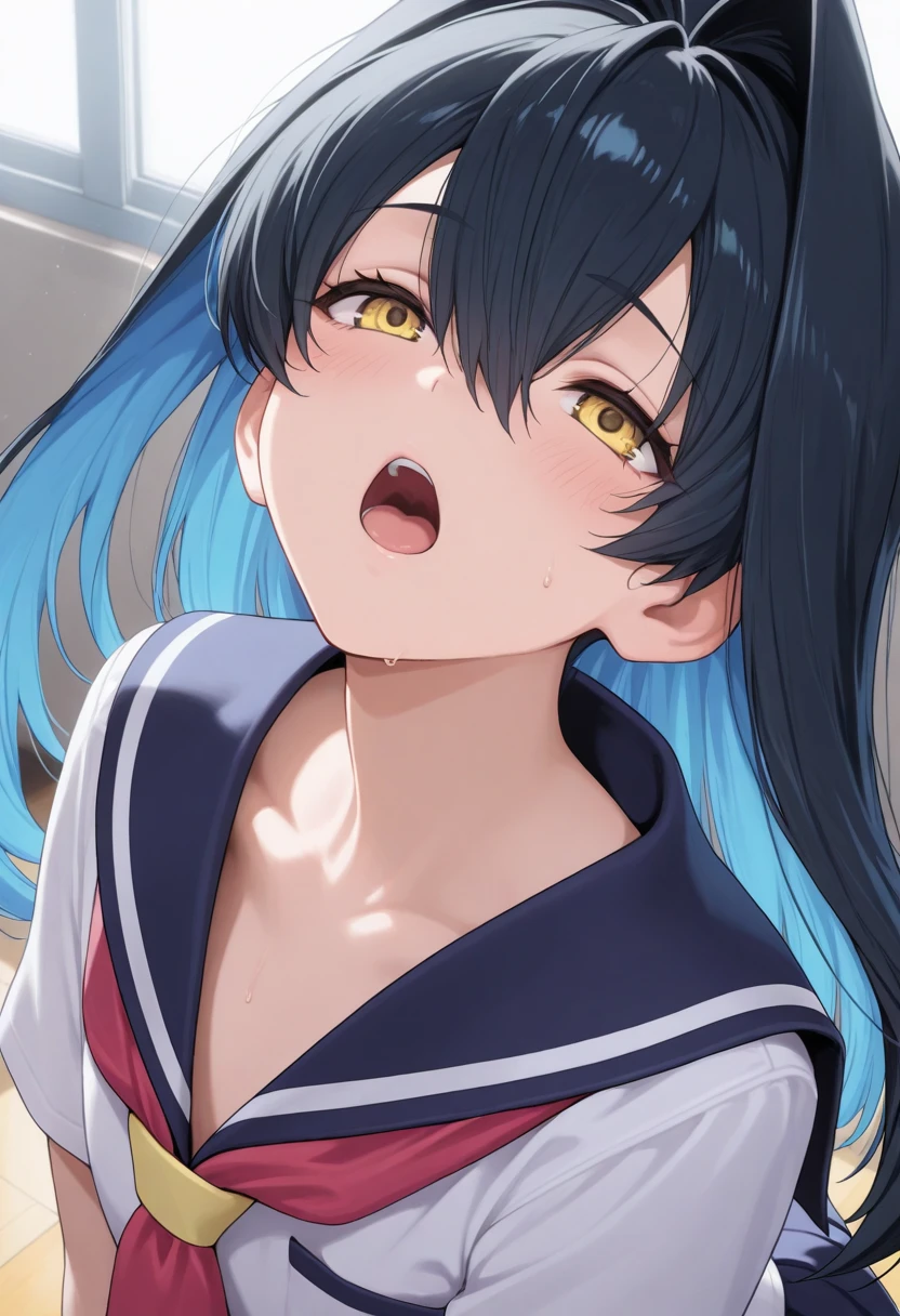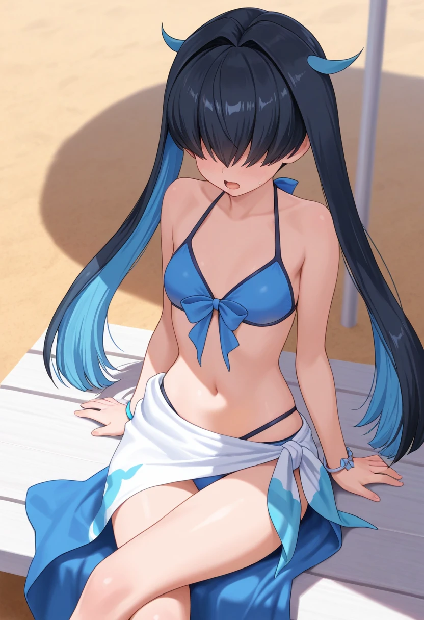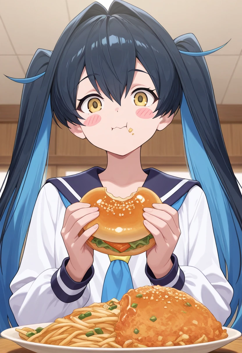 Trigger Words: miki shinobu (shadowverse flame), black hair, long hair, blue hair, colored inner hair, yellow eyes
