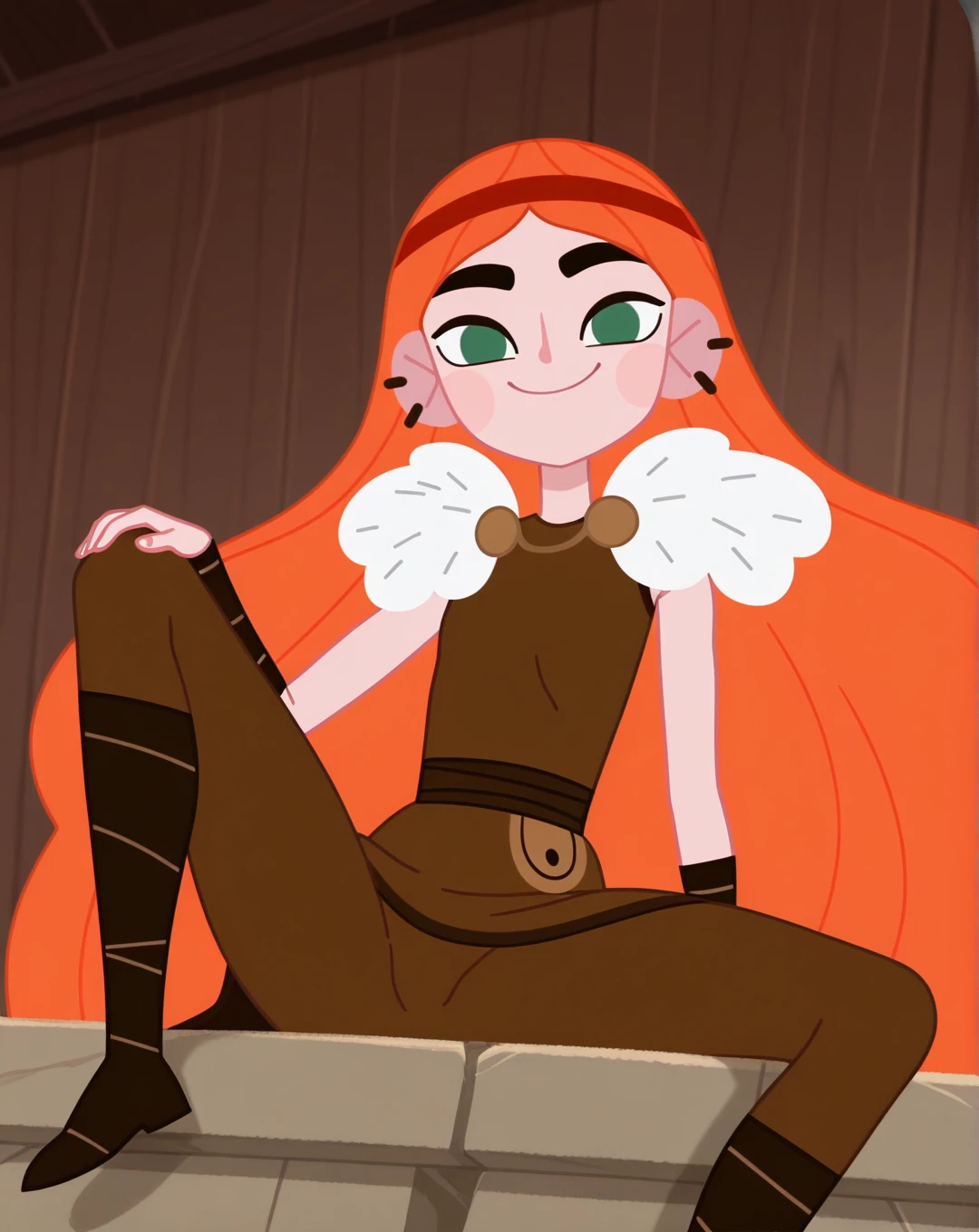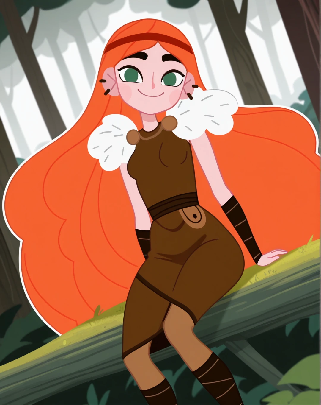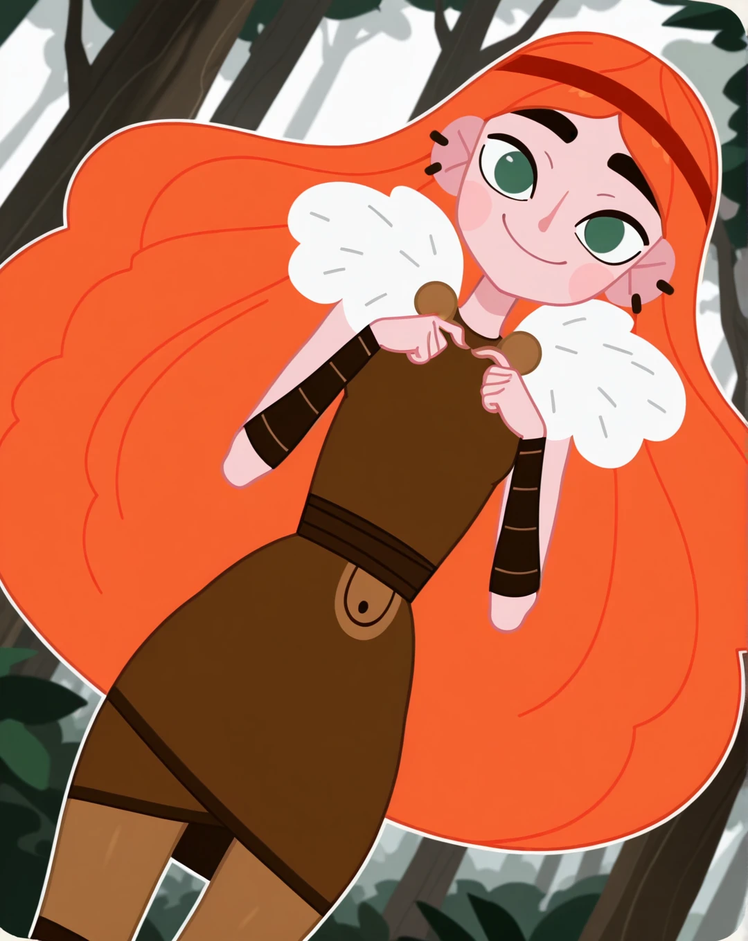 dark brown sash, black wrapping, white fur coat, brown dress, black boots