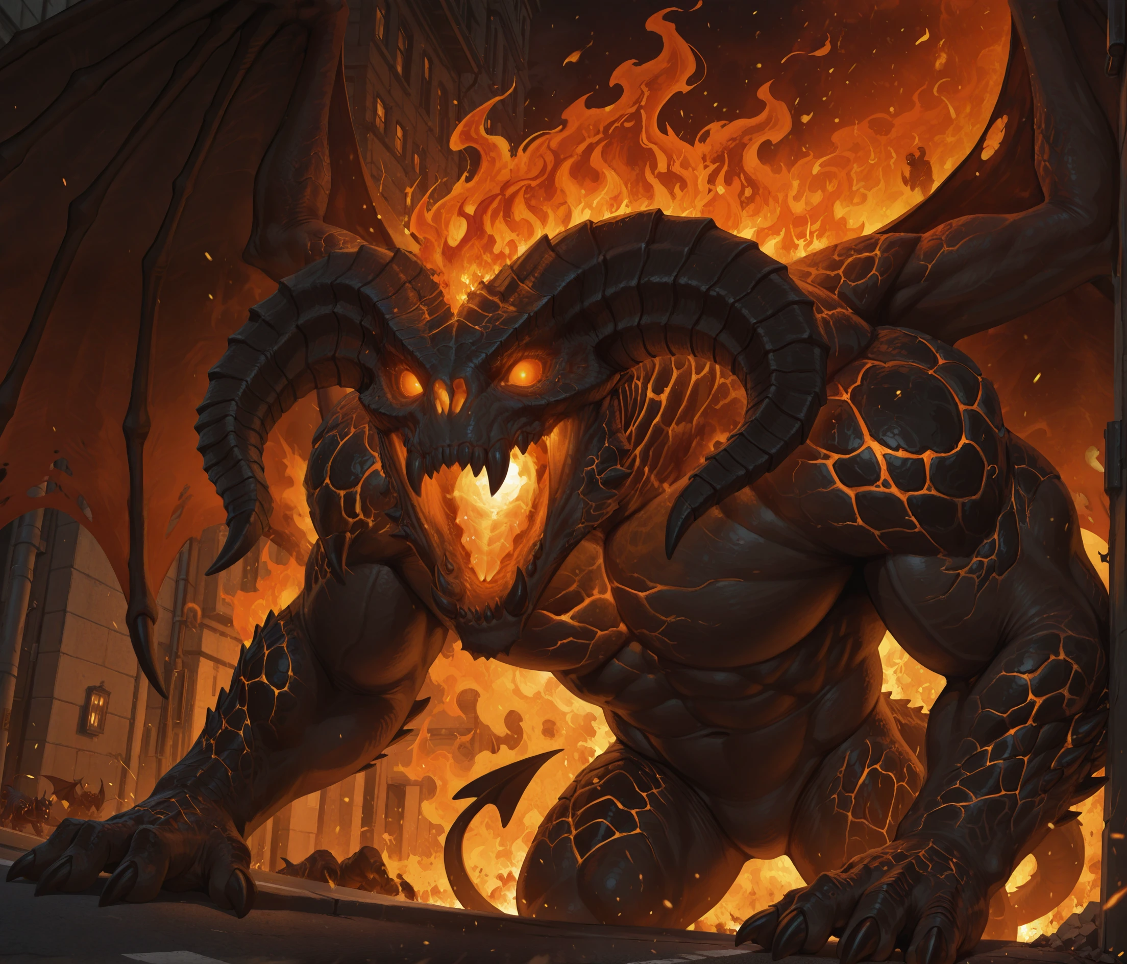 Tags: balr0g, demon, monster, creature, fire, brimstone, scales, cracked skin, muscular, pectorals, abs, glowing eyes, orange eyes, no pupils, horns, demon wings, wings, claws, tail, digitigrade, four fingers, two toes, glowing nostrils, glowing mouth, glowing tongue, sharp teeth, glowing