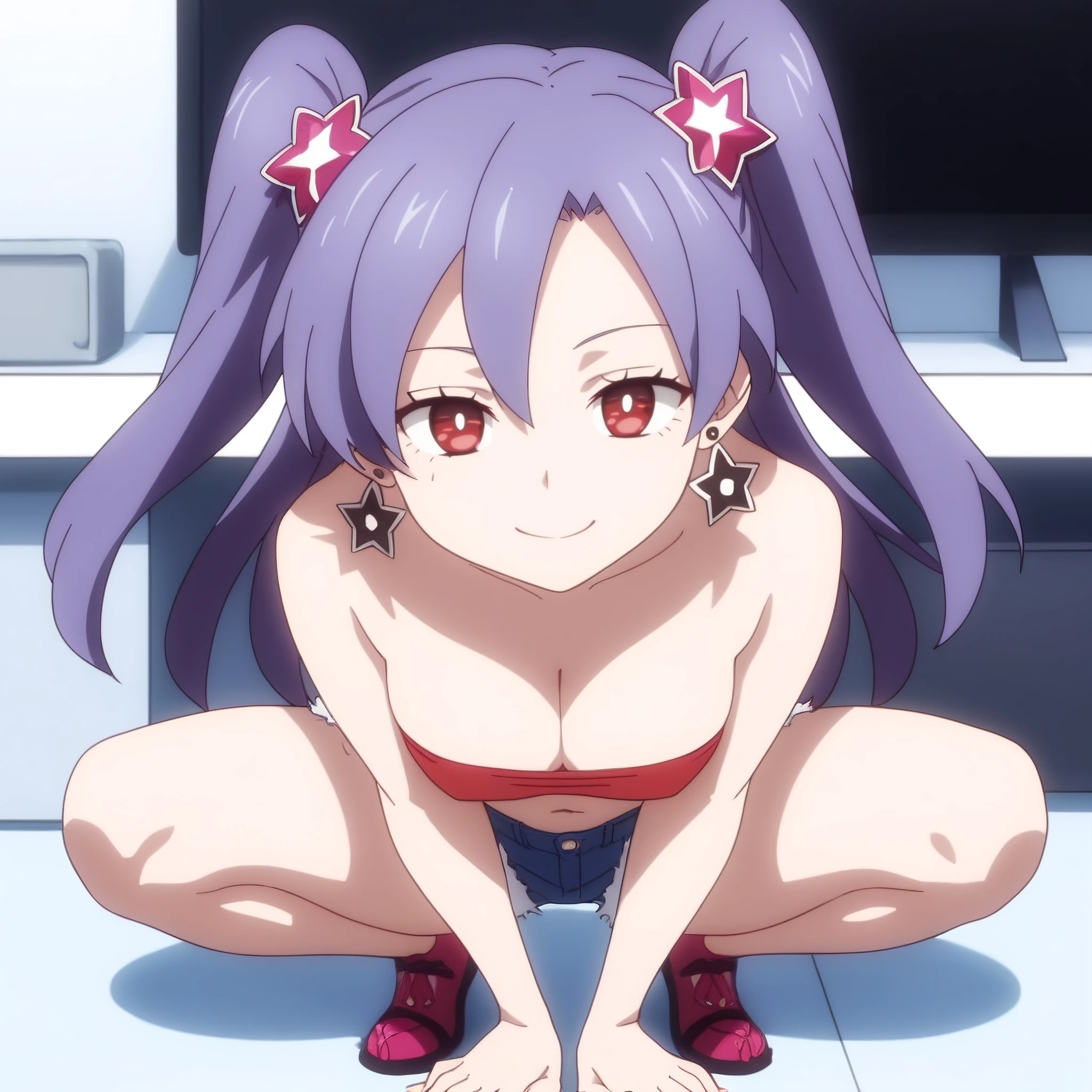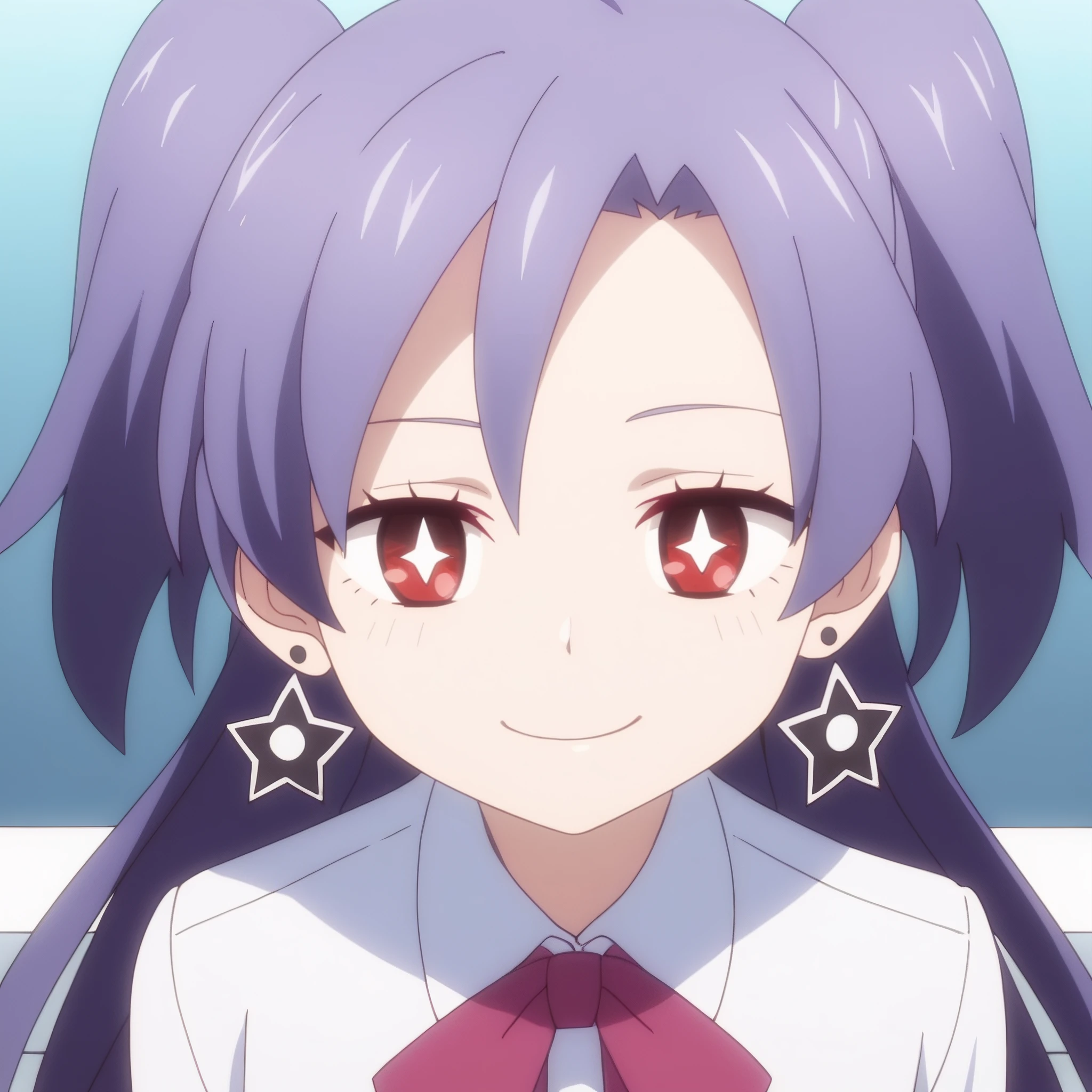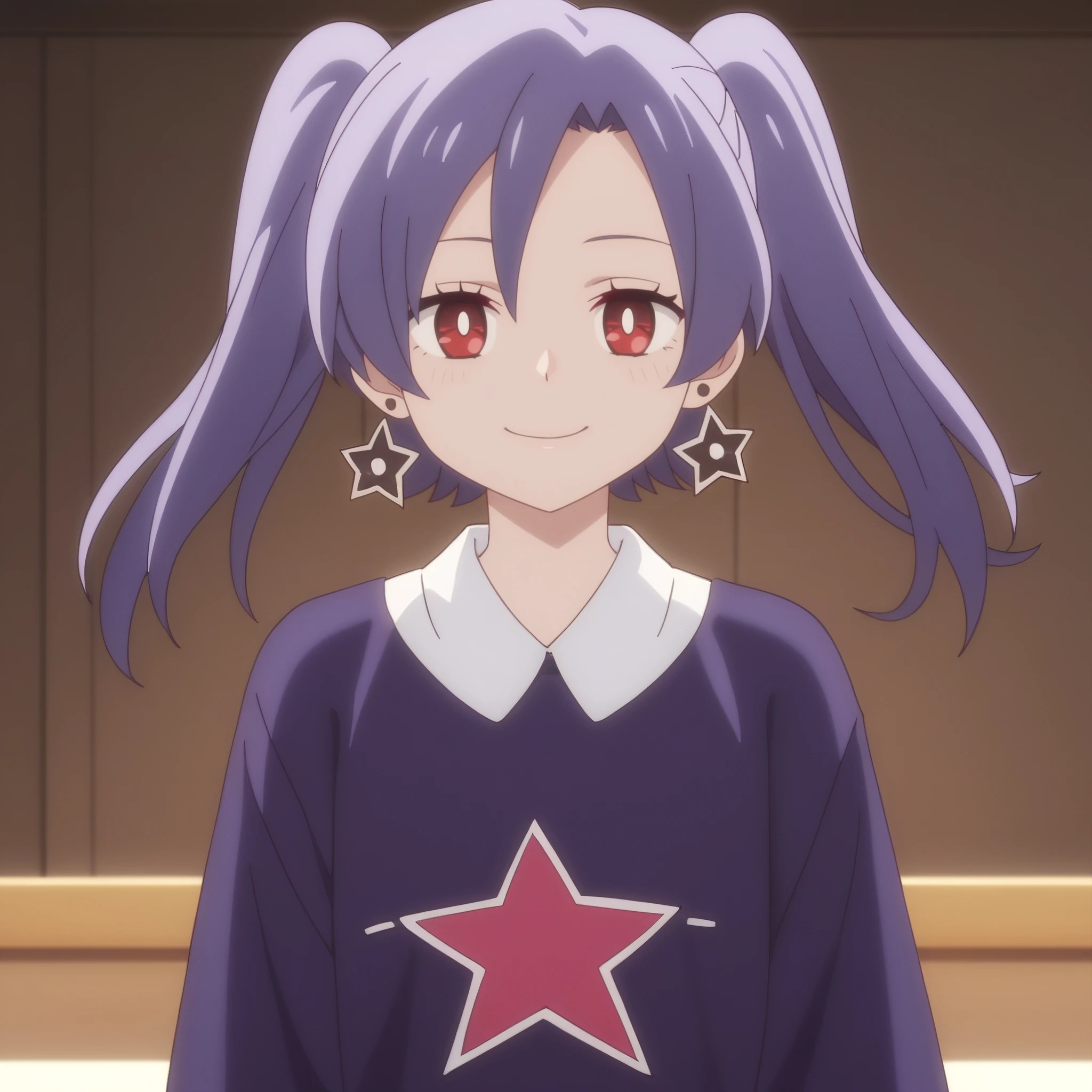 ANAAsuka, long hair, purple hair, red eyes, earrings, bangs, star earrings, twintails,