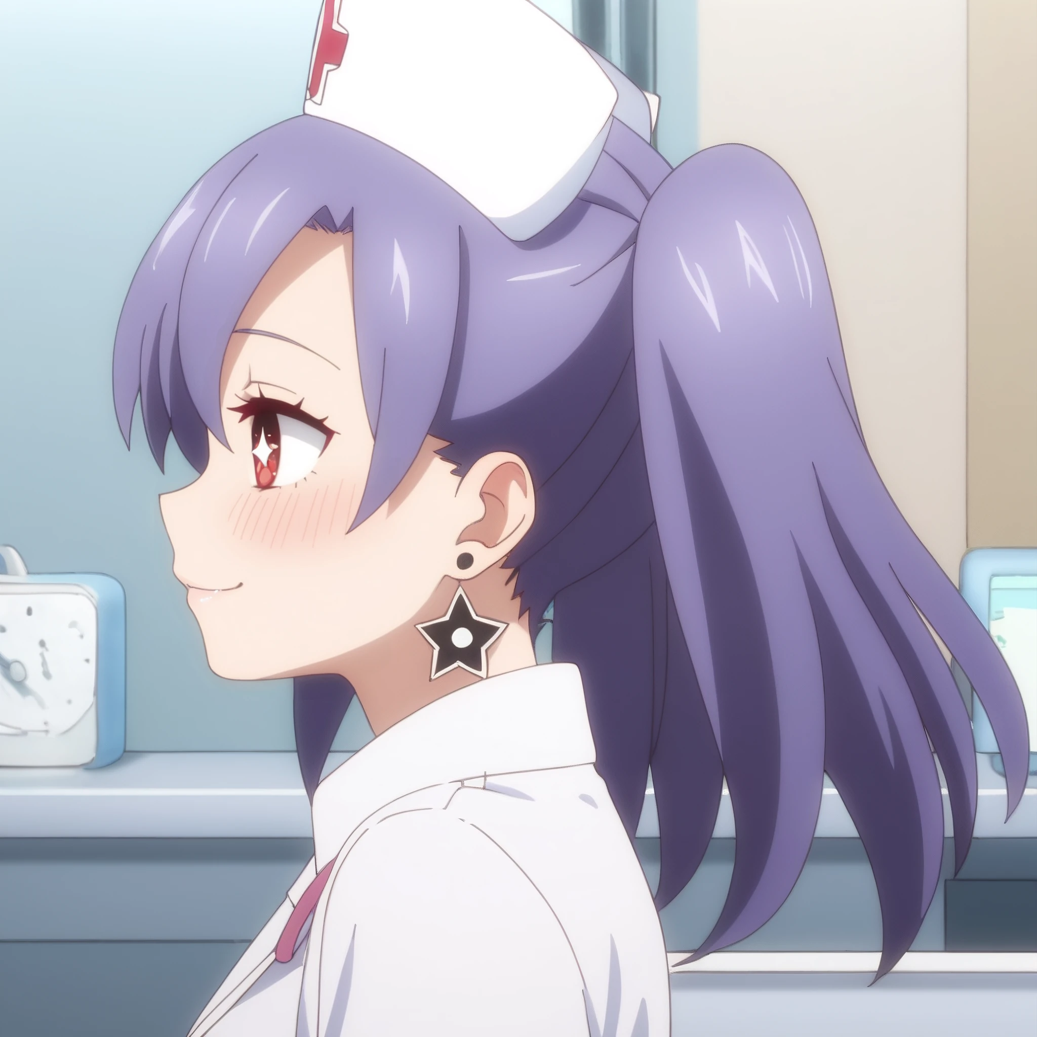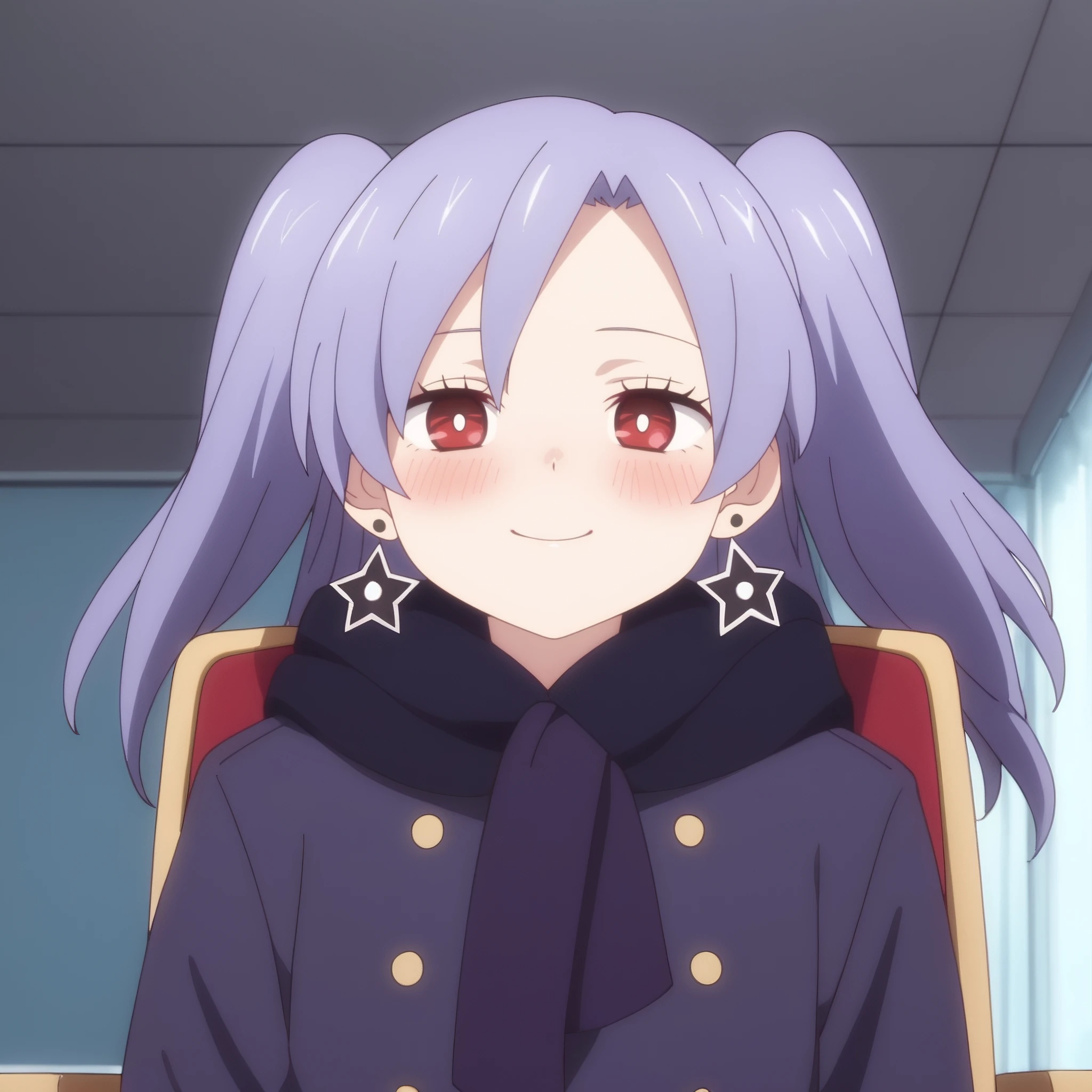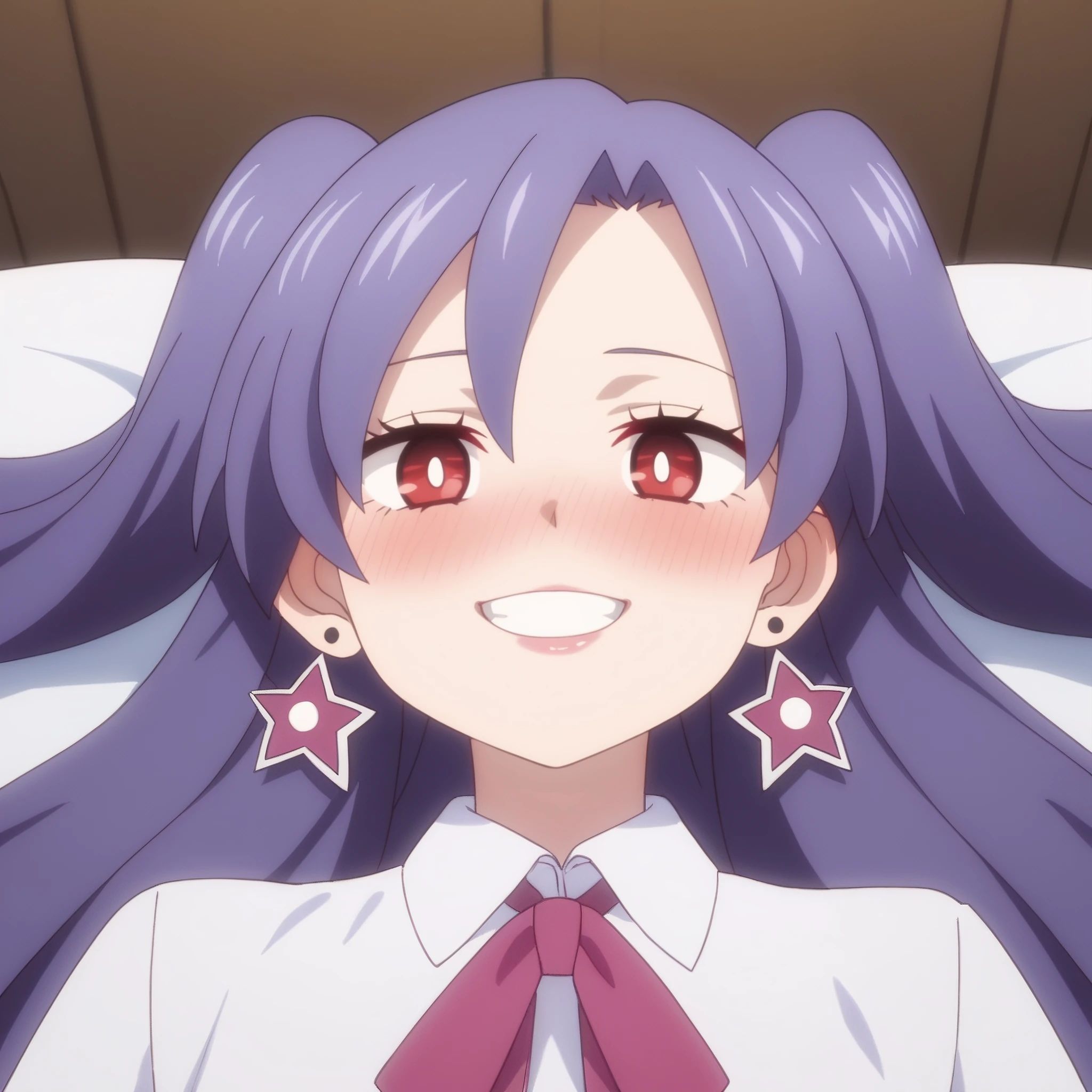 ANAAsuka, long hair, purple hair, red eyes, earrings, bangs, star earrings, twintails,