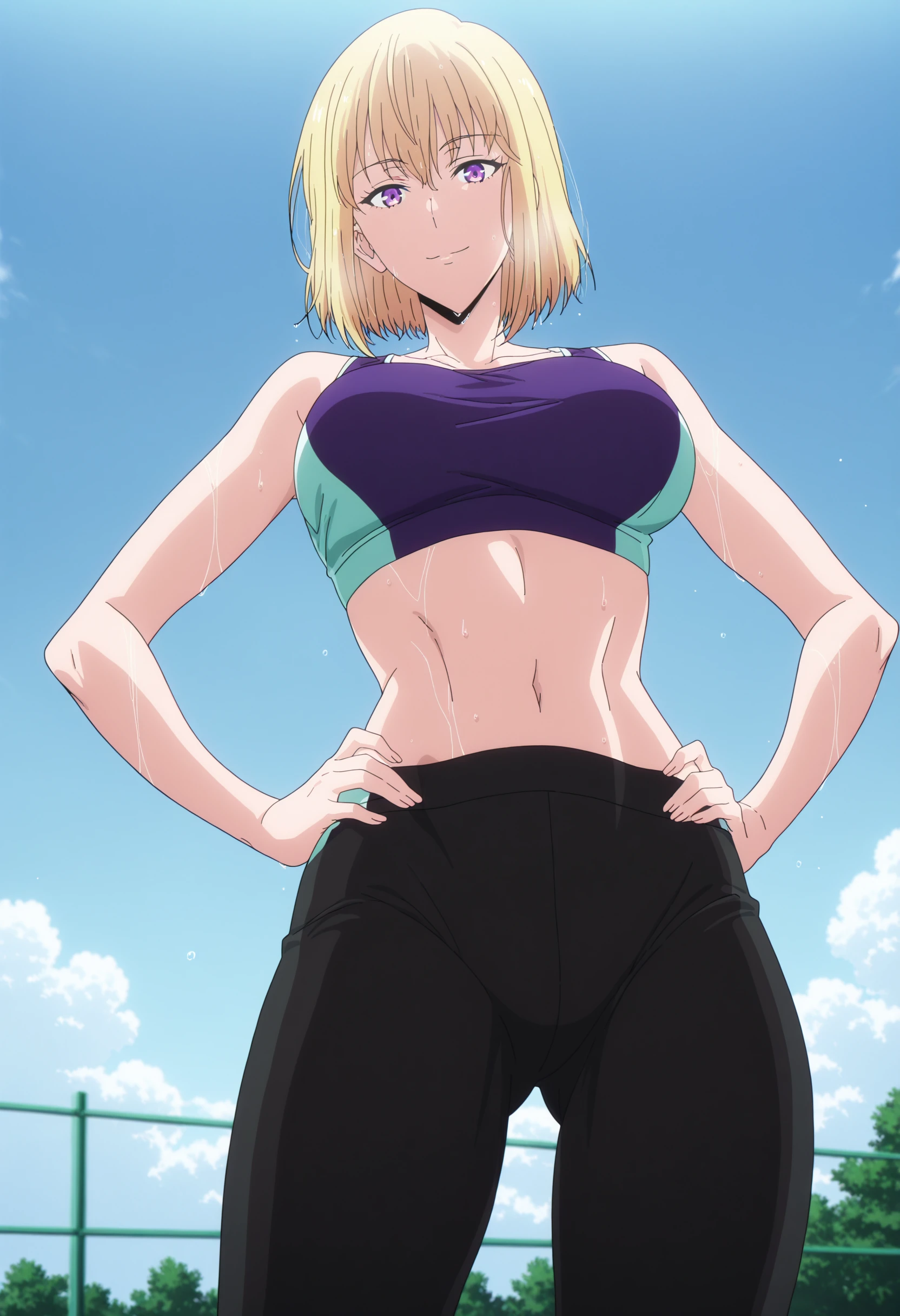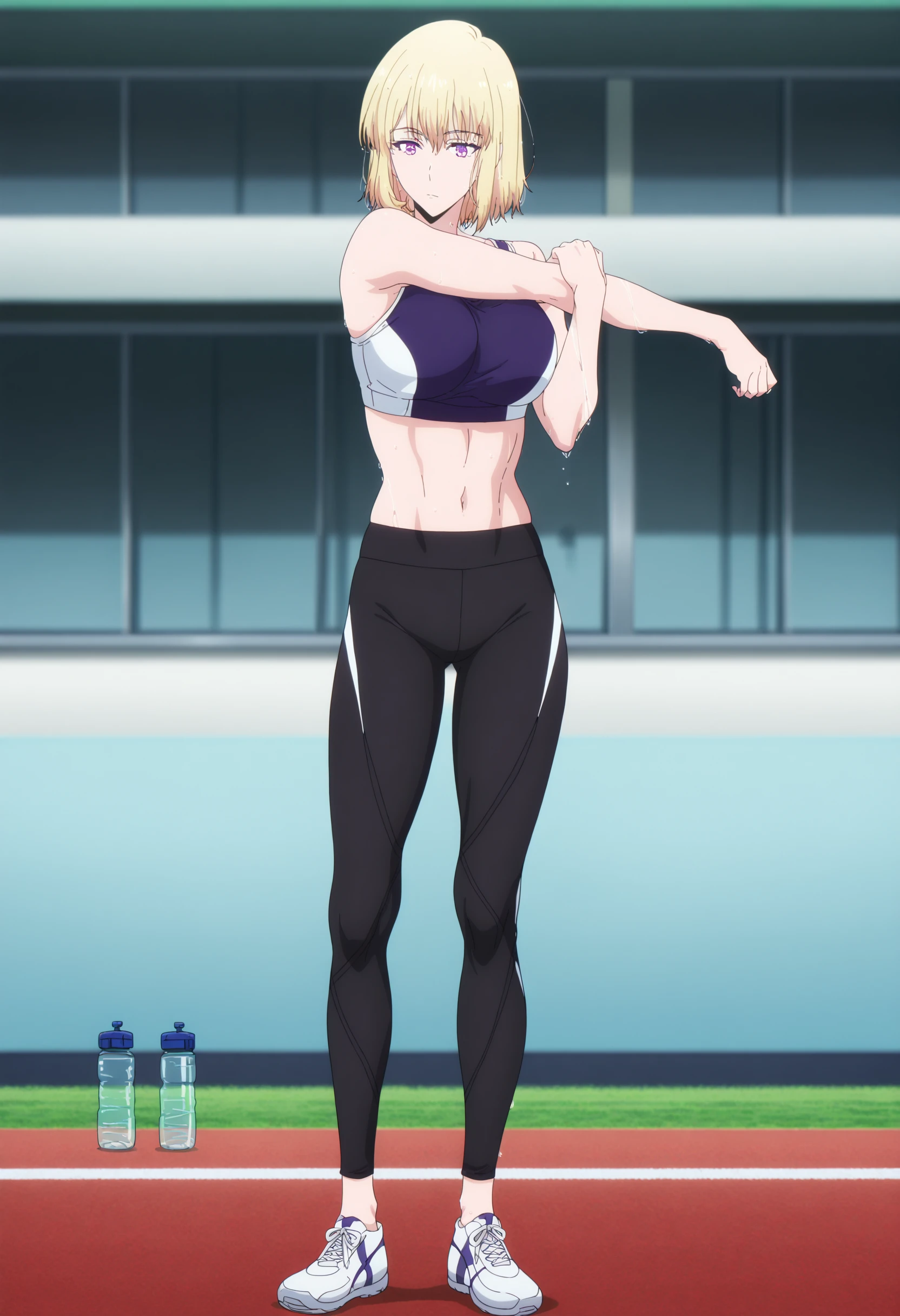 Body: 1girl, purple eyes, blonde hair, short hair, bangs,
