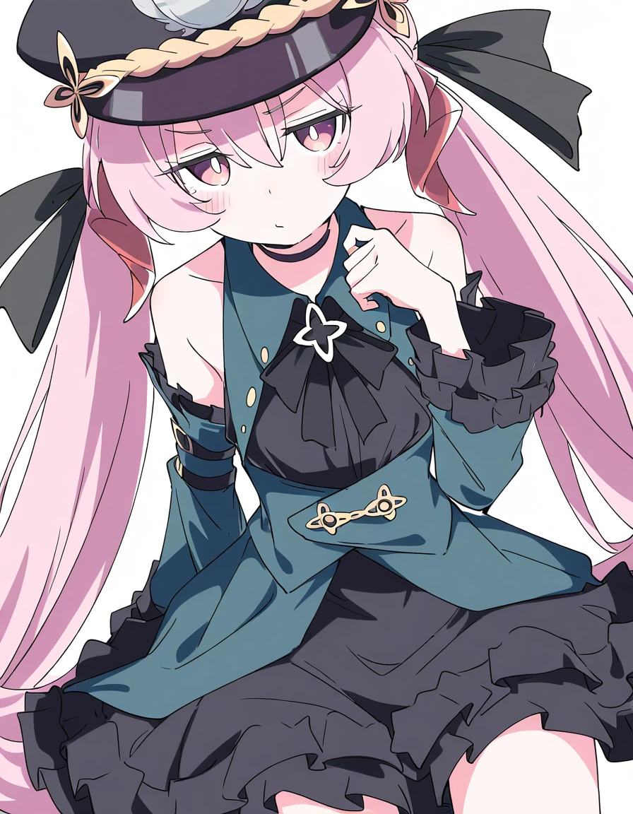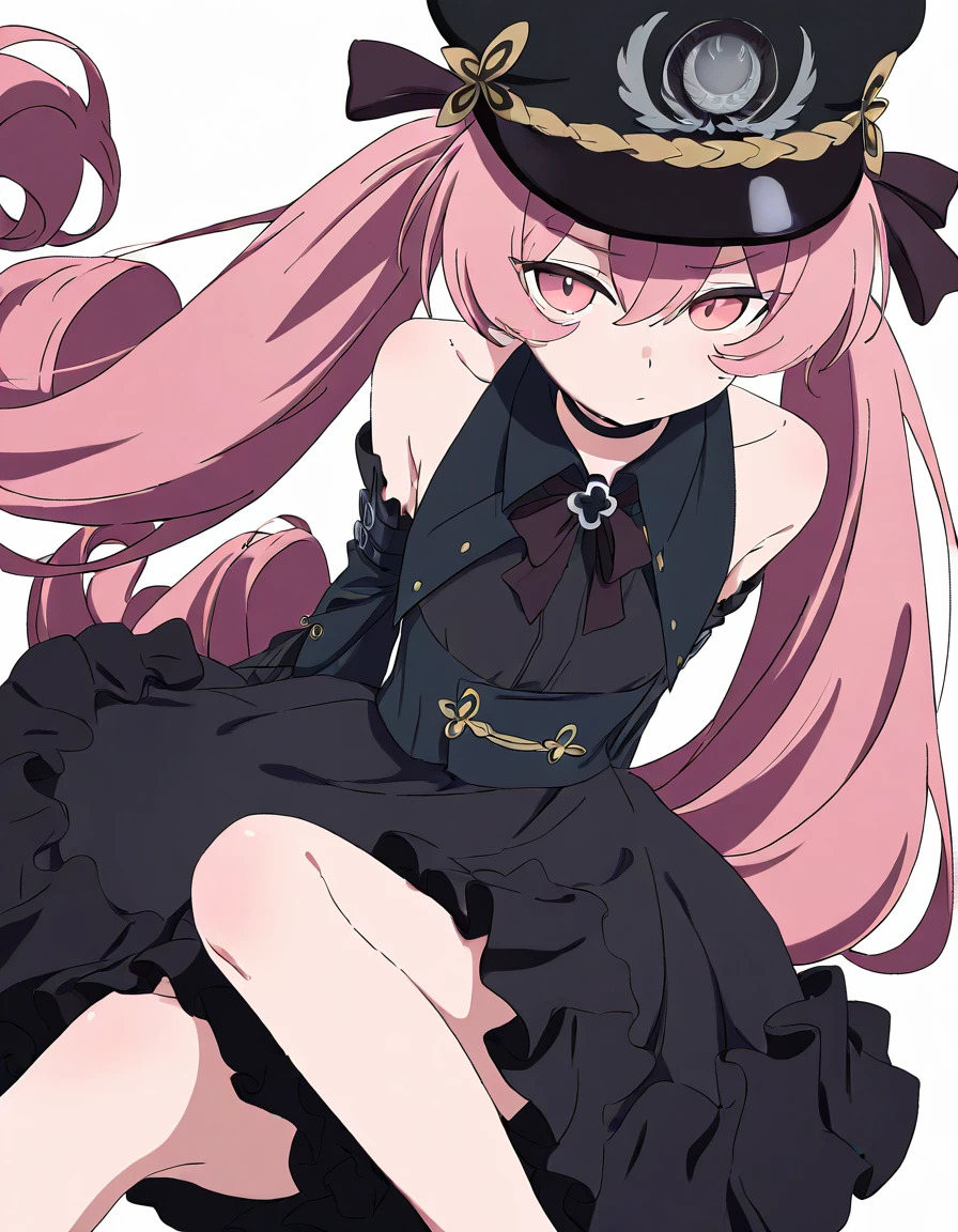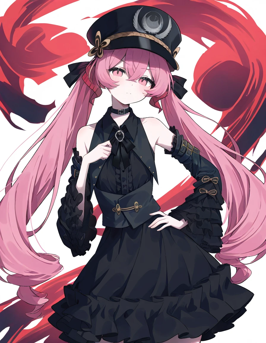 black headwear,bare shoulders,long sleeves,black choker,peaked cap,hair ribbon,frills,detached sleeves,black dress,twintails,