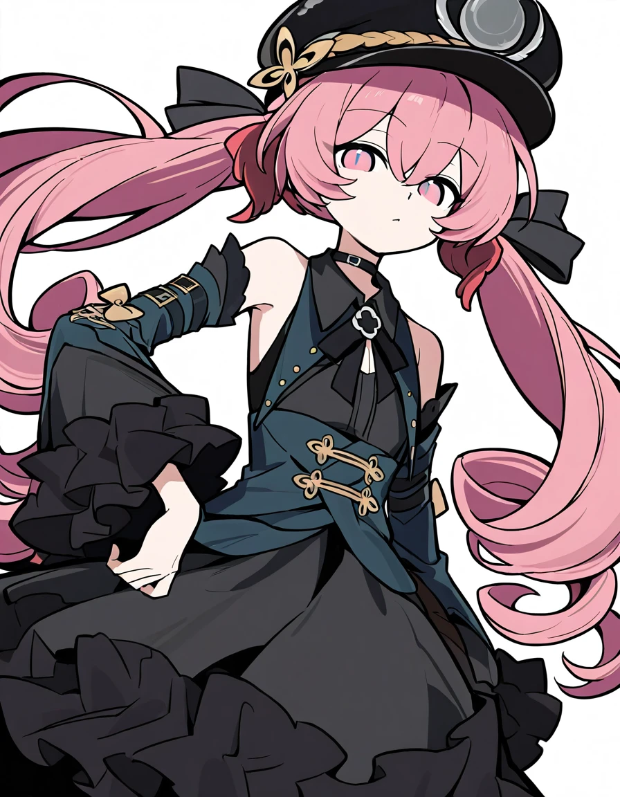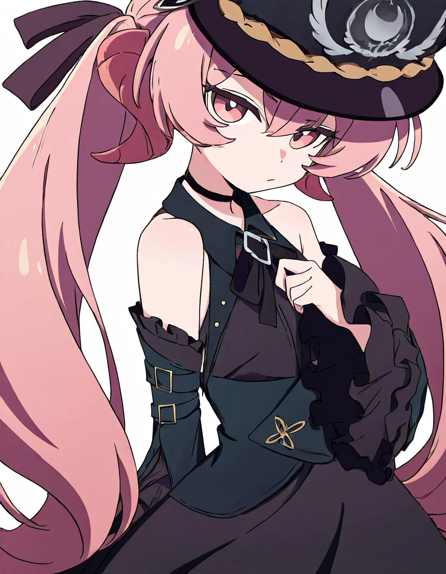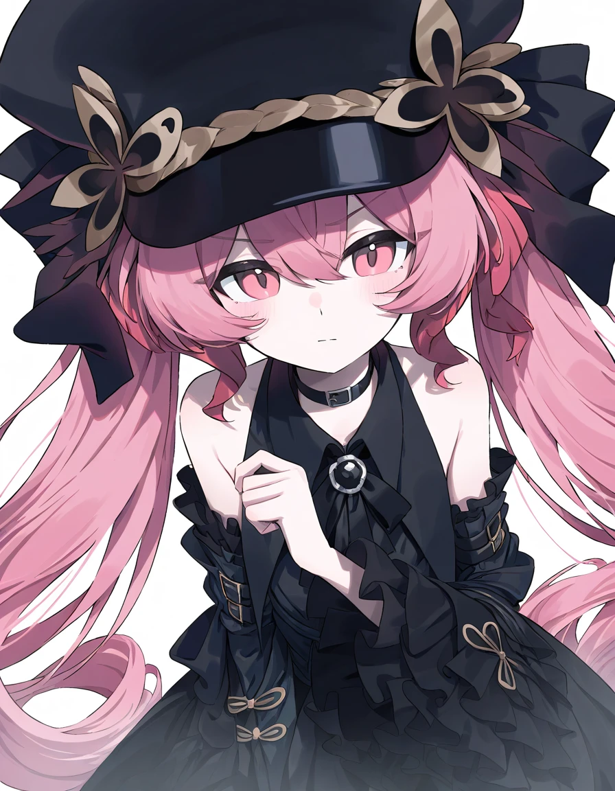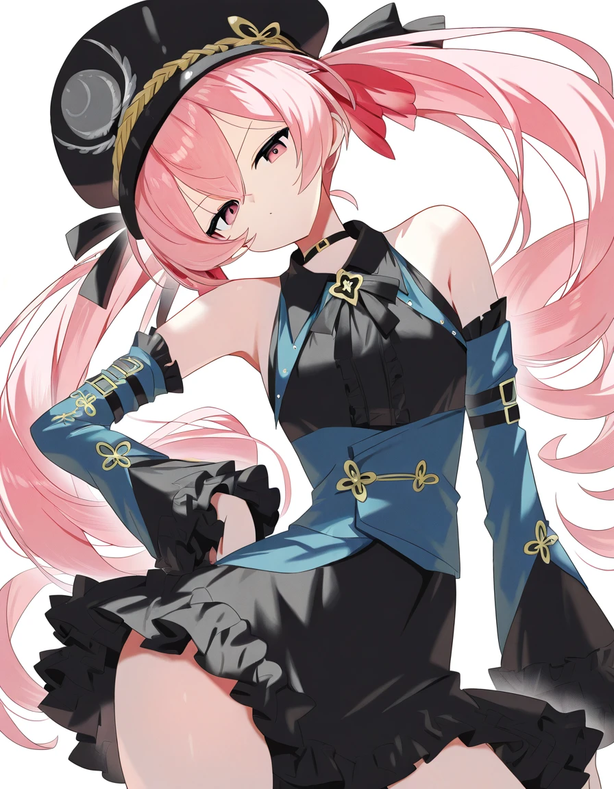 black headwear,bare shoulders,long sleeves,black choker,peaked cap,hair ribbon,frills,detached sleeves,black dress,twintails,