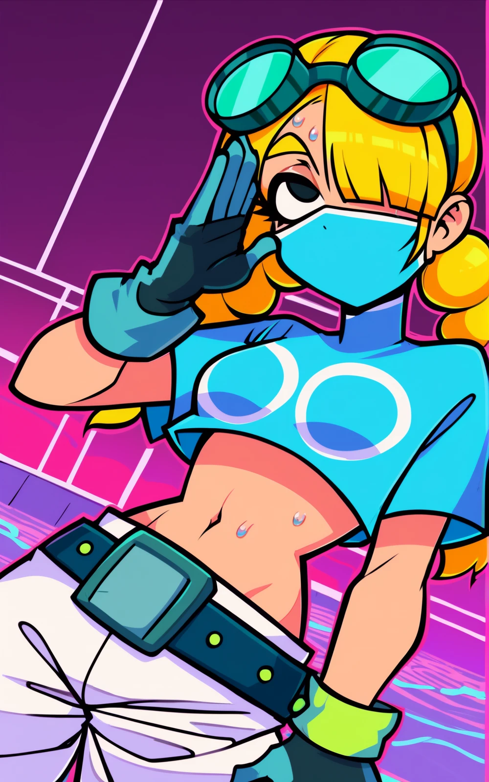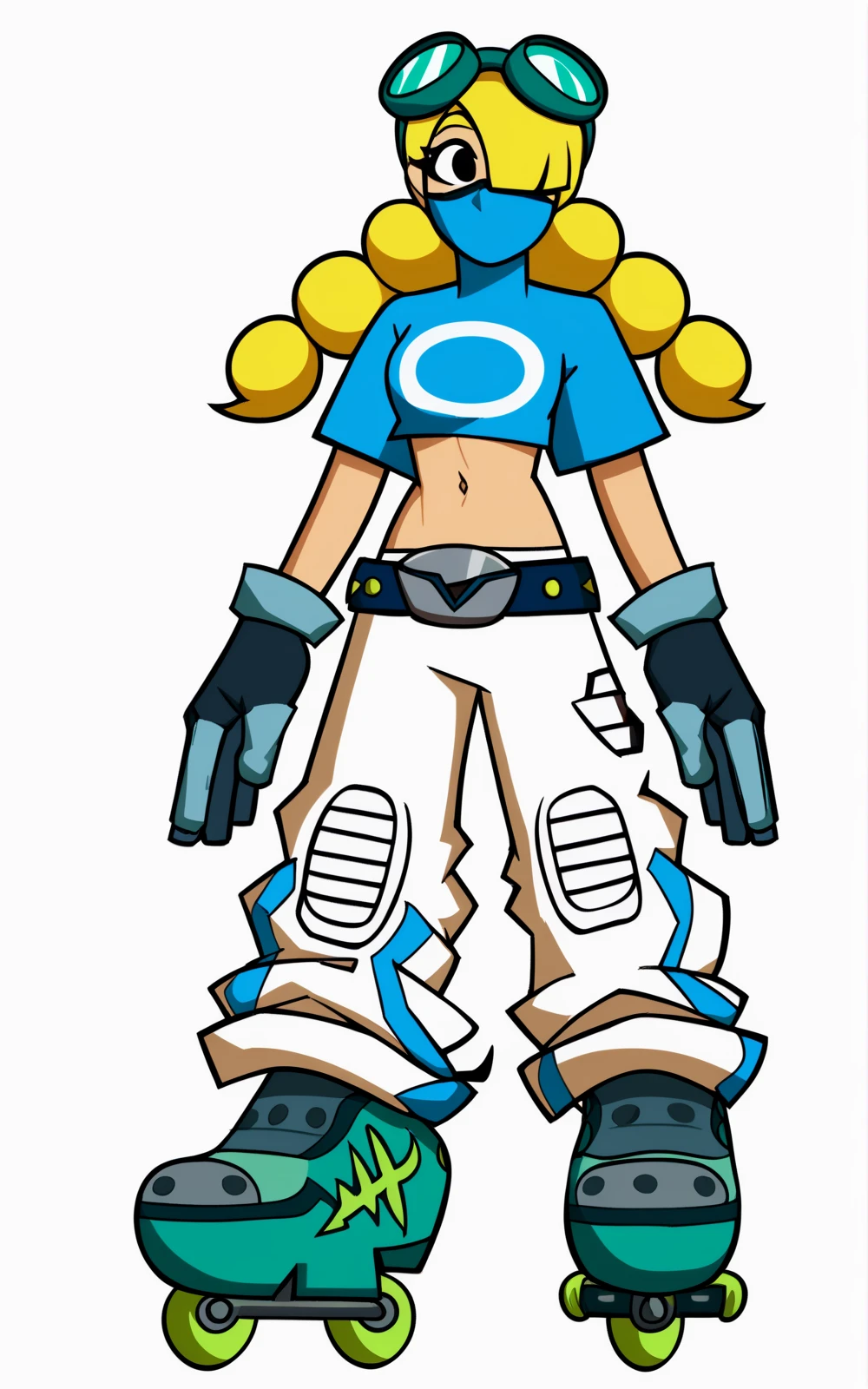 For her Outfit: roller skates, skates, inline skates, belt, gloves, short sleeves, pants, white pants, baggy pants, crop top, blue crop top, mouth mask, goggles, goggles on head