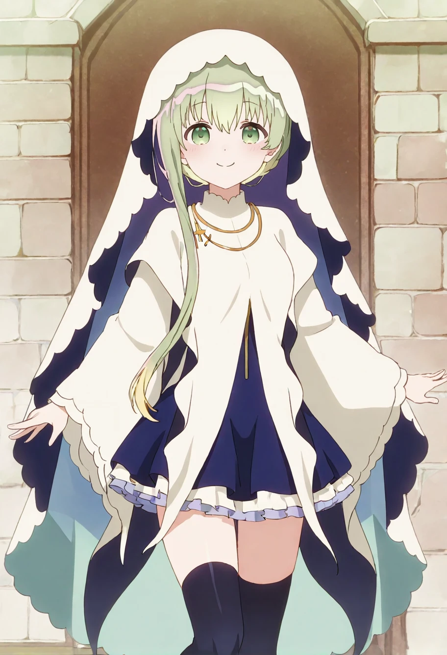 cecilia-default, cecilia \(shiro seijo to kuro bokushi\),green eyes,green hair,single sidelock,white veil,white dress,wide sleeves,black skirt,black thighhighs