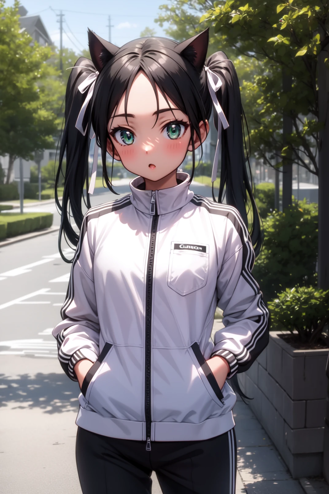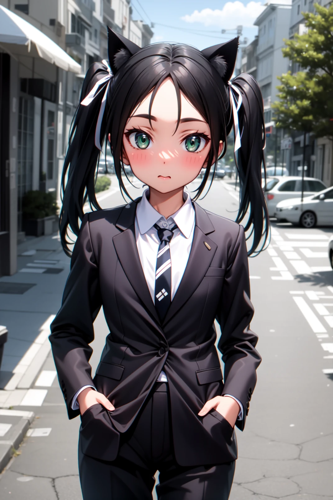 francesca, green eyes, black hair, long hair, parted bangs, twintails, cat ears, cat tail