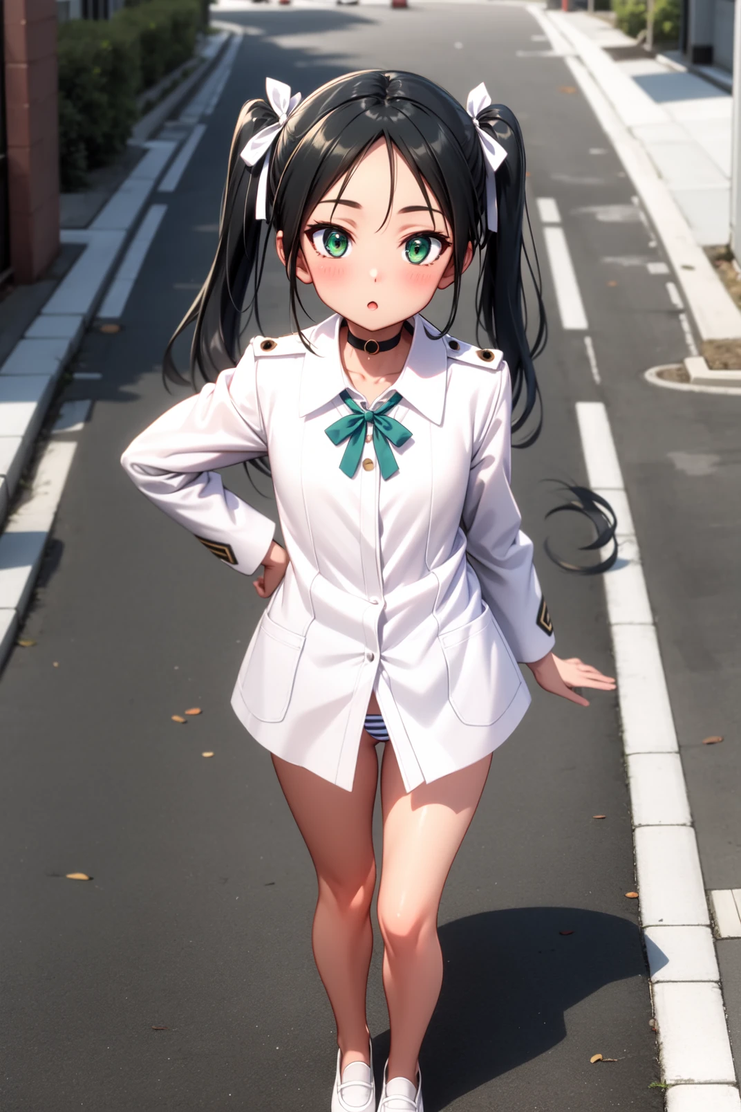 outfit: hair ribbon, white ribbon, choker, white shirt, militaty uniform, long sleeves, green neck ribbon, no pants, striped panties, white footwear