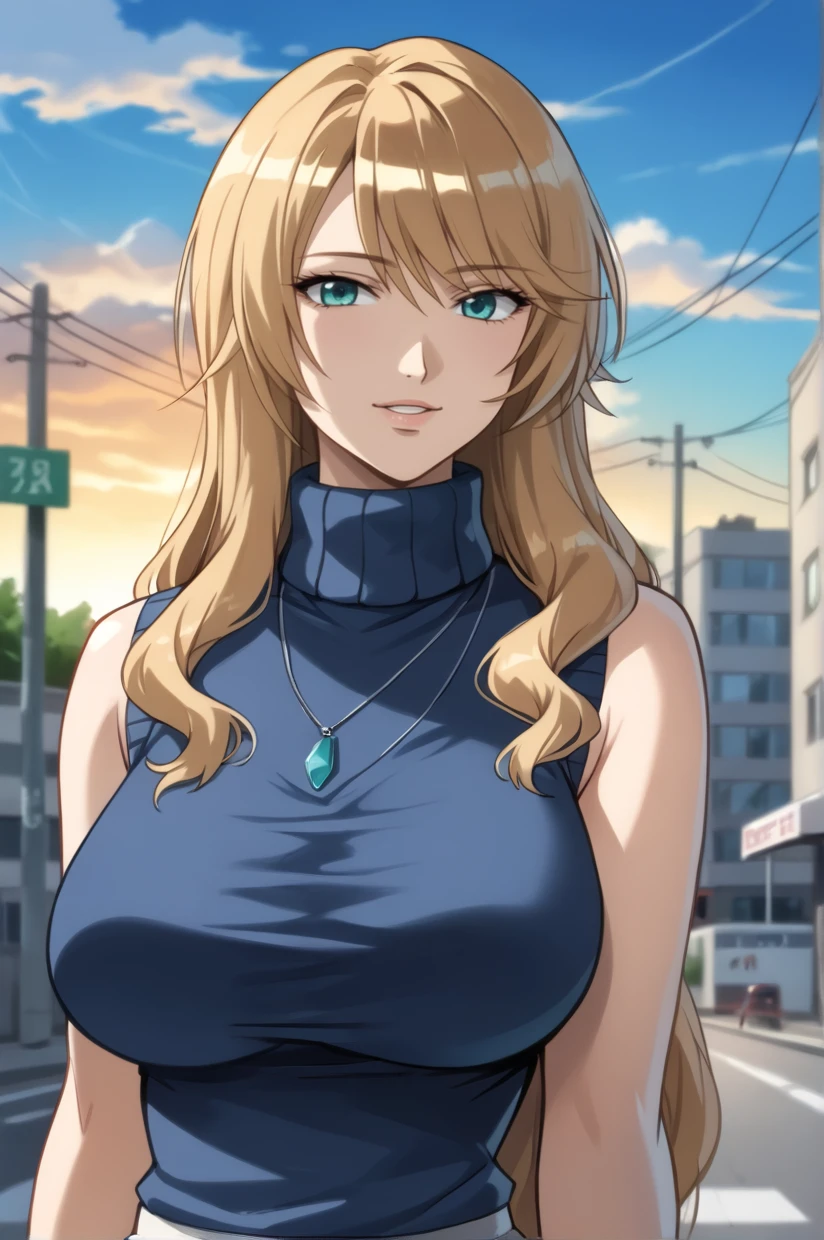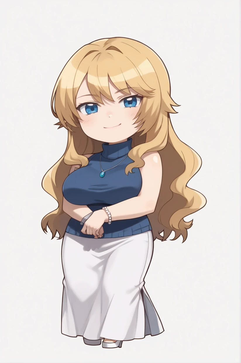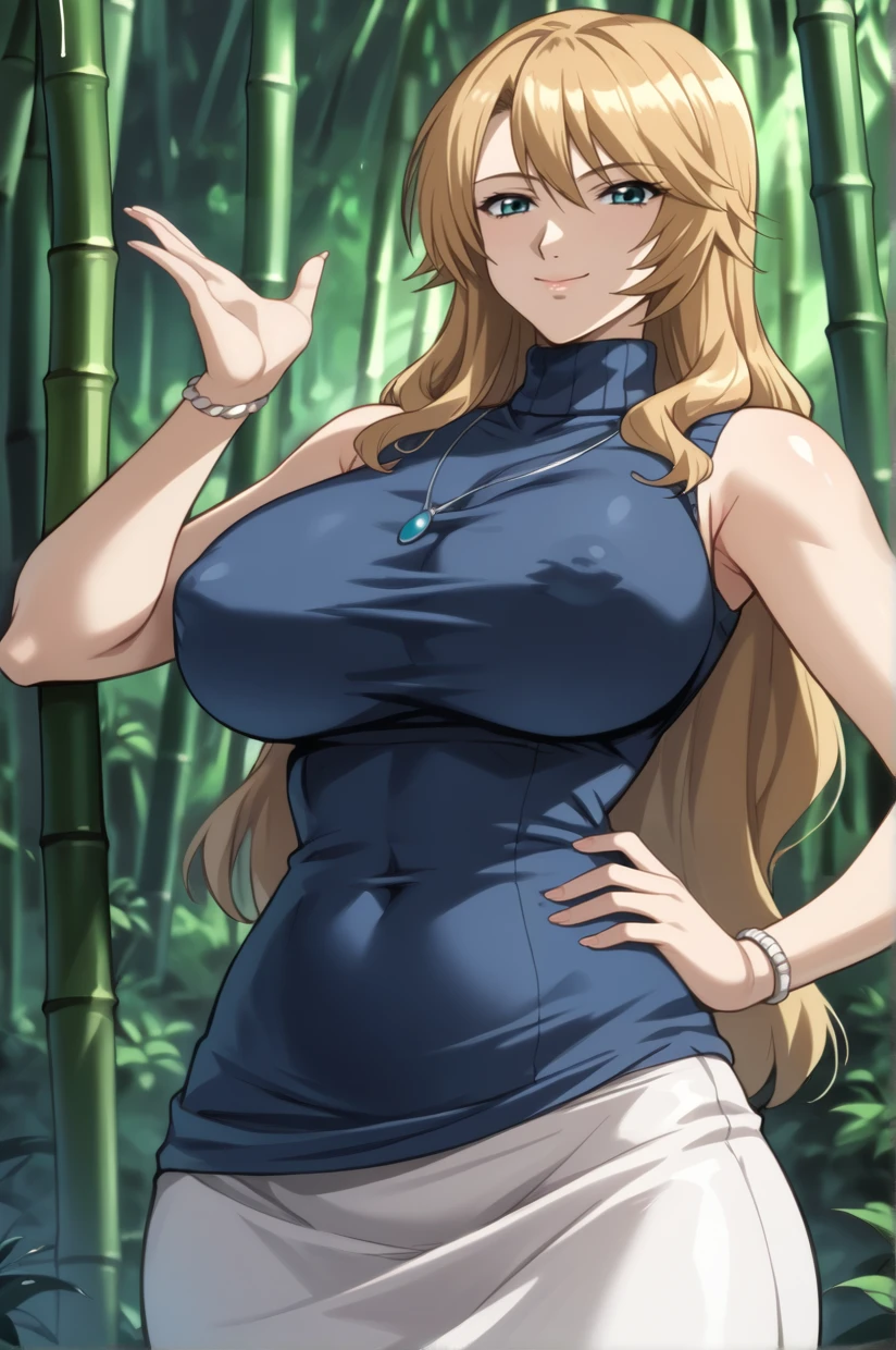 long skirt, sleeveless turtleneck, white skirt, sweater, bare shoulders, pendant, bracelet, sleeveless shirt, high heels, white footwear
