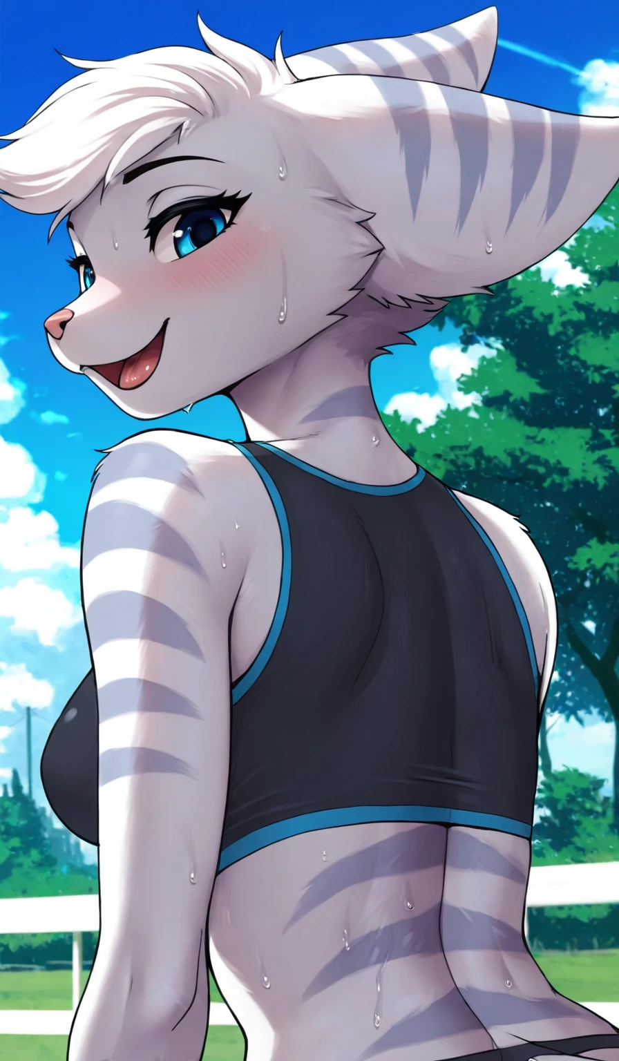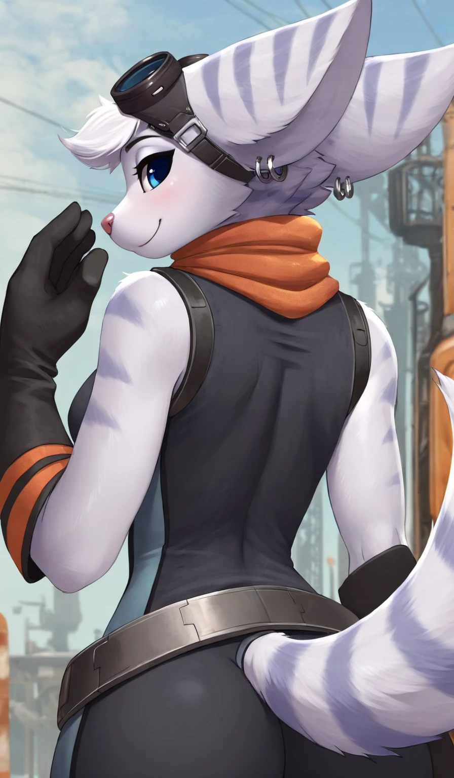 Rivet, anthro, female, lombax, blue eyes, white hair, striped fur, animal ears, long tail, fluffy tail