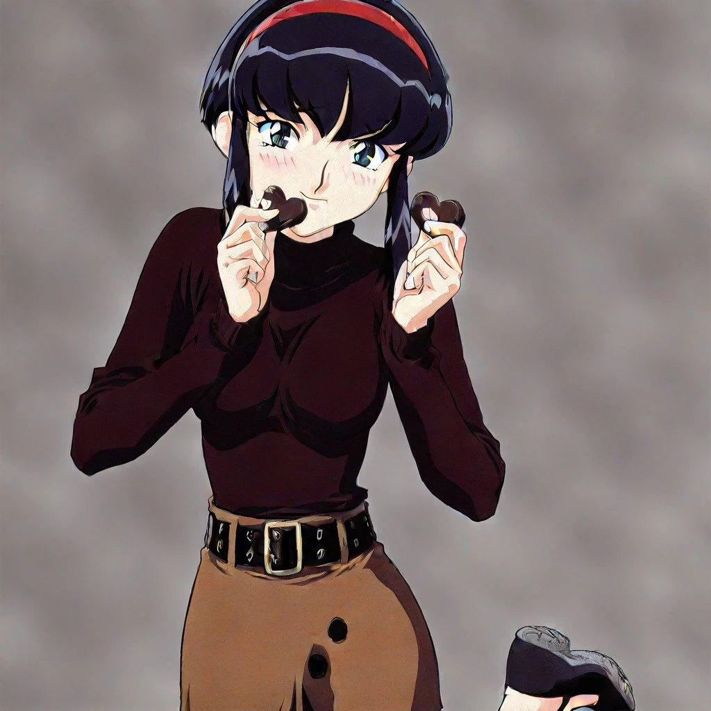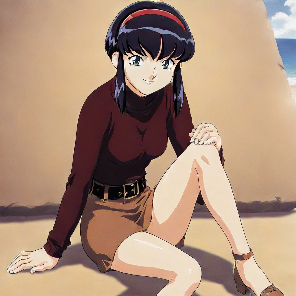 sakuya kumashiro \(tenchi muyo\), black hair, medium hair, bangs, sidelocks, green eyes, hairband, sweater, khaki skirt, belt, heels, large breasts, 1girl, solo