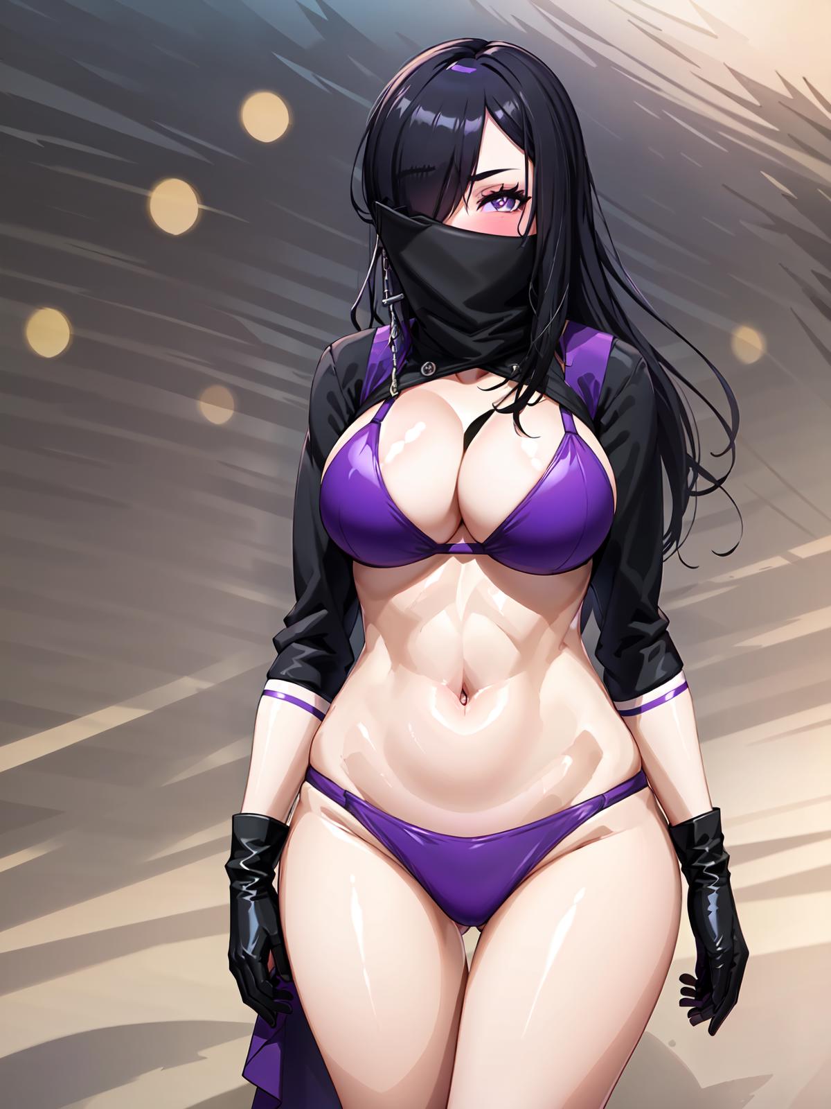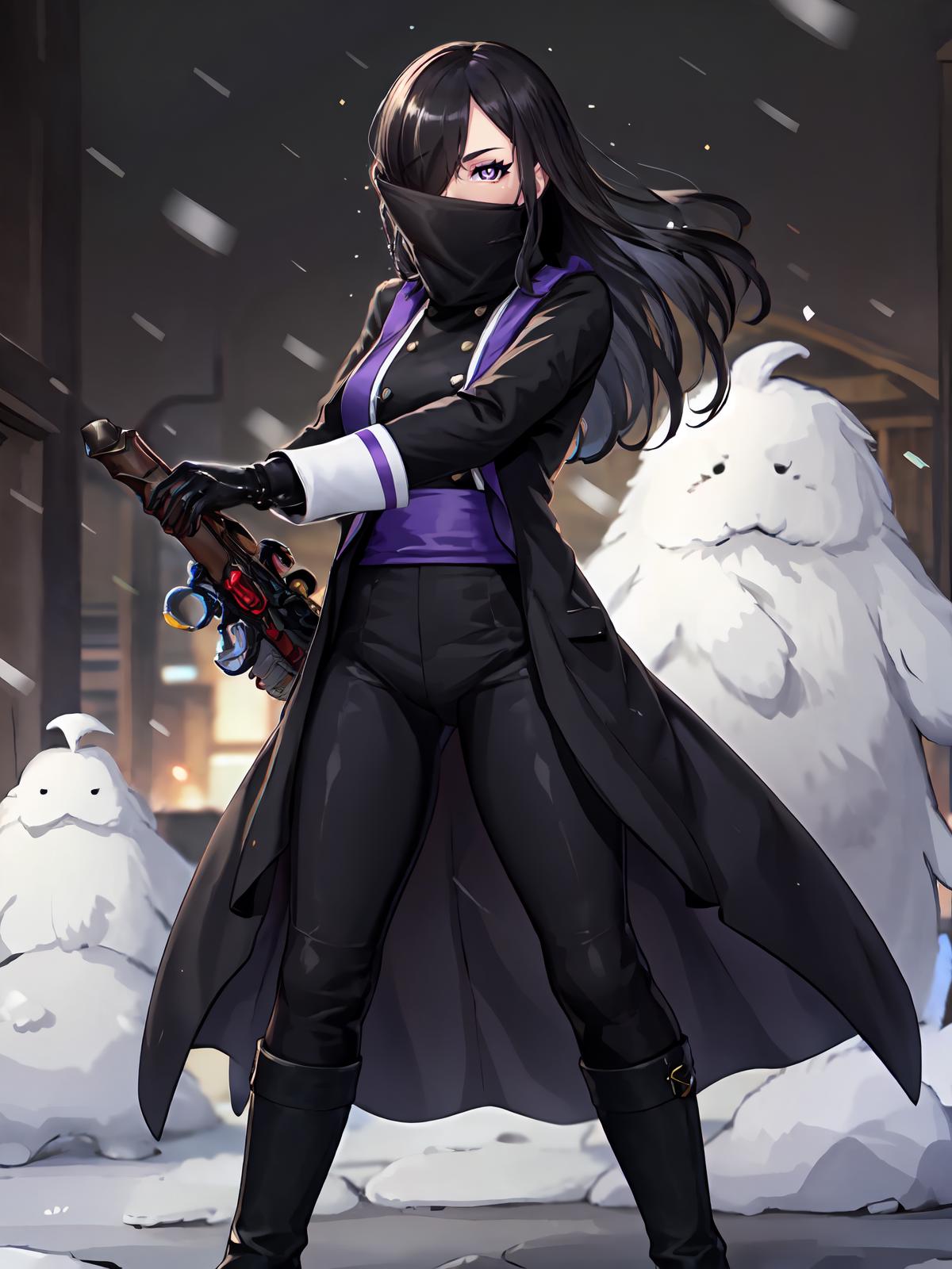 Prompts: black coat, one eye covered,boots,high collar,covered mouth ,mouth mask,mask,black gloves,hair over one eye,gloves,long hair,purple eyes,