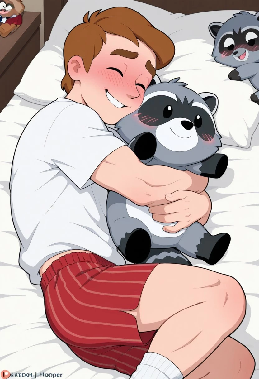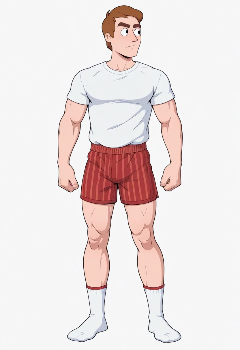 1man, solo, male focus, Agent Hooper, brown hair, short hair, thick eyebrows, muscular, athletic, red boxers, vertical striped boxers, white tshirt, white socks
