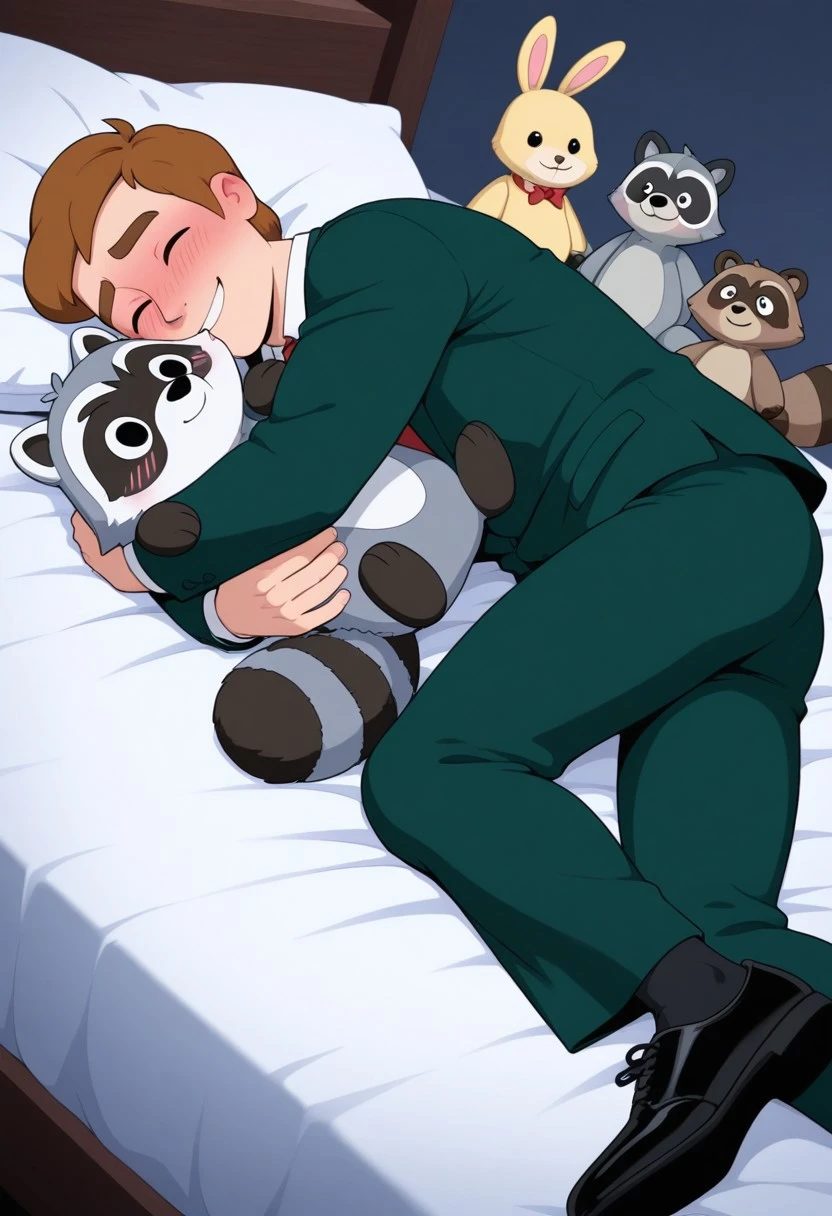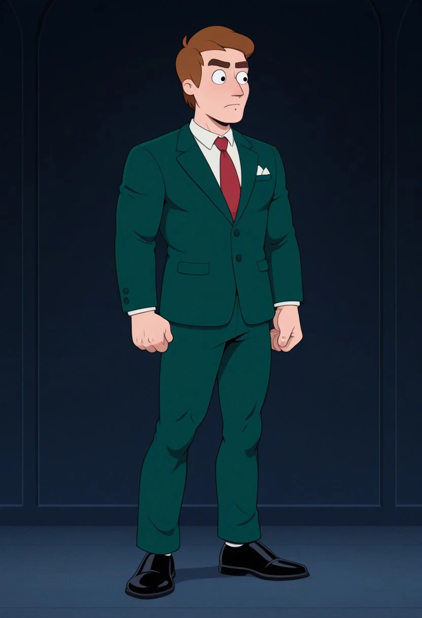 1man, solo, male focus, Agent Hooper, brown hair, short hair, thick eyebrows, muscular, athletic, dark green suit jacket, dark green suit pants, white collared shirt, red necktie, black shoes