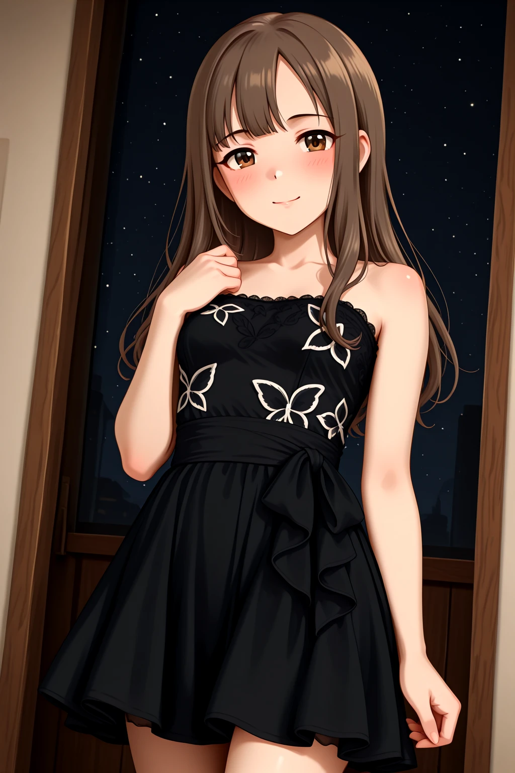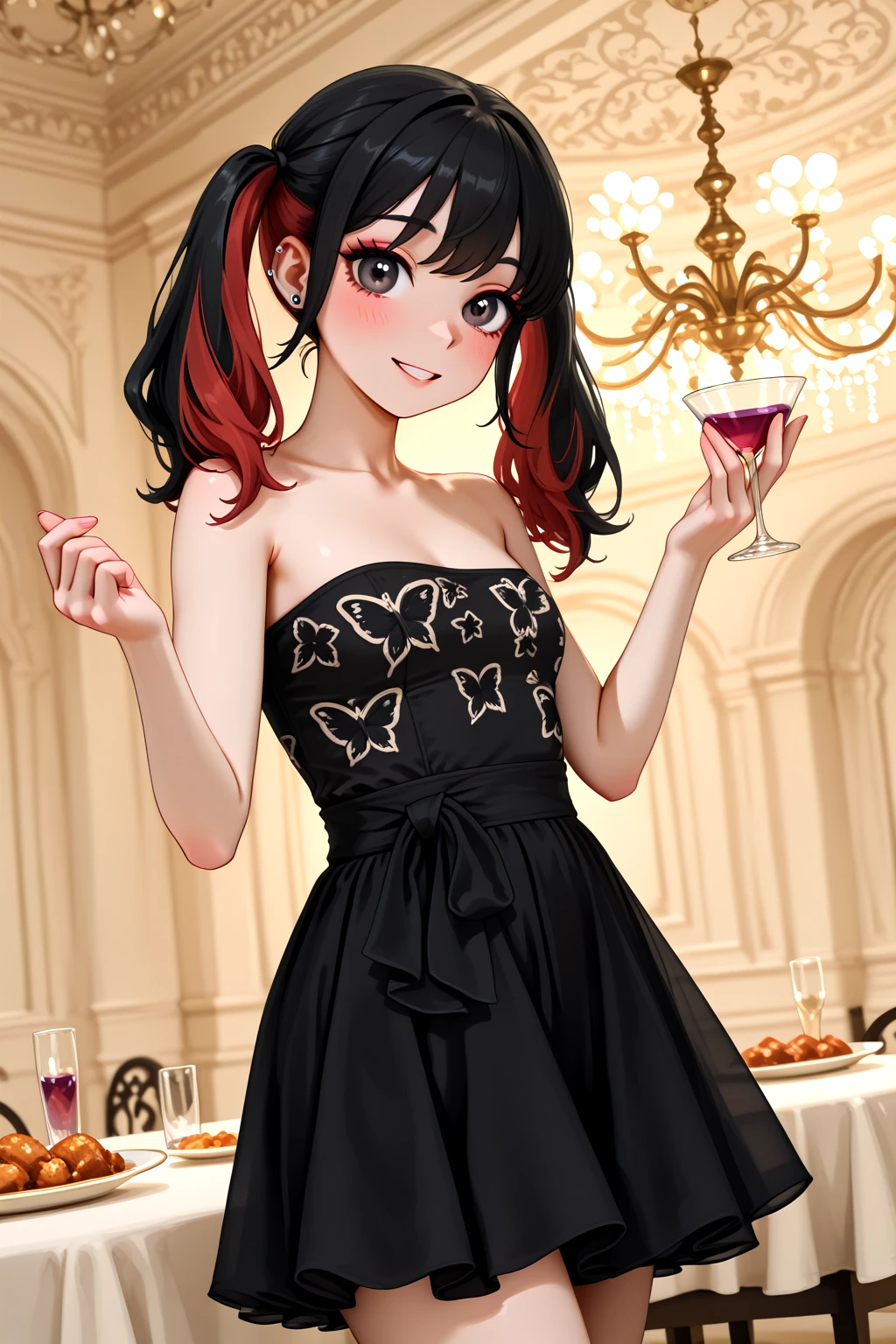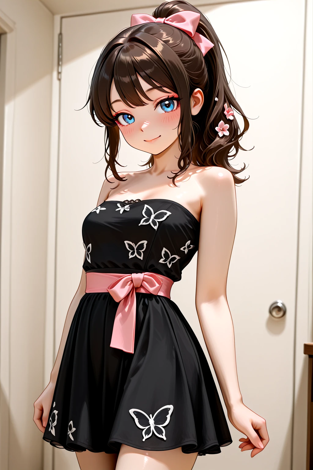 Butterfly_Appliqué_Black_Silk_Chiffon_Party_Dress, bare shoulders, bare arms, black dress, short dress, strapless, sleeveless, butterfly print, lace, sash, bow recommended weight: 1.0