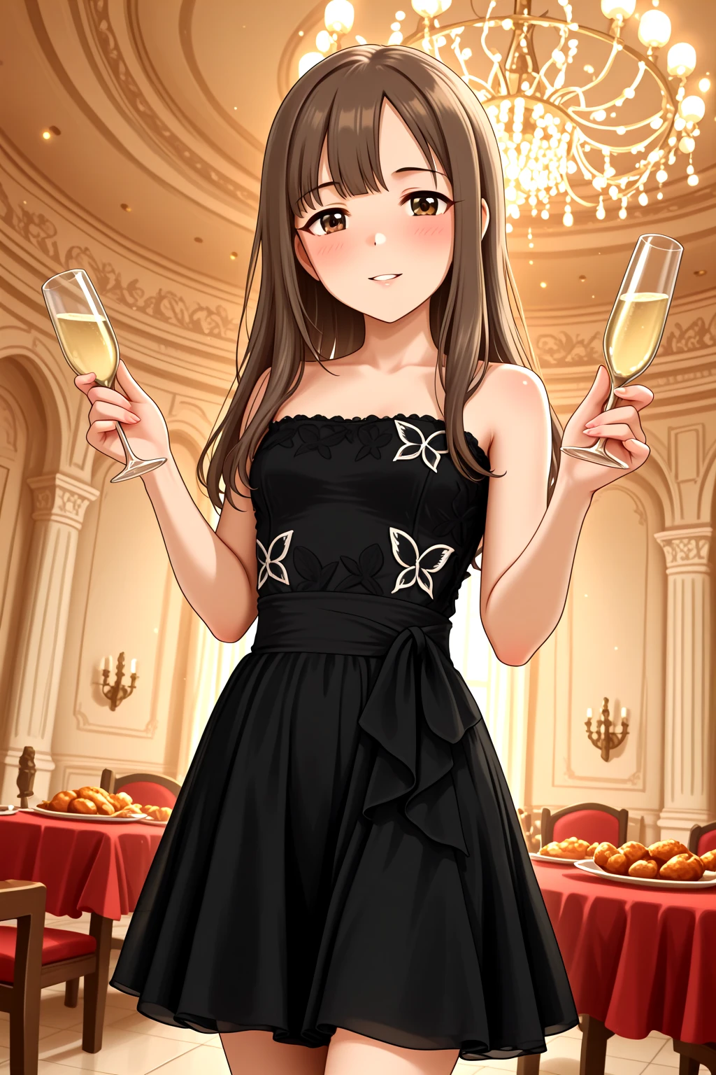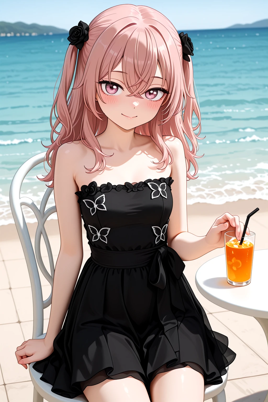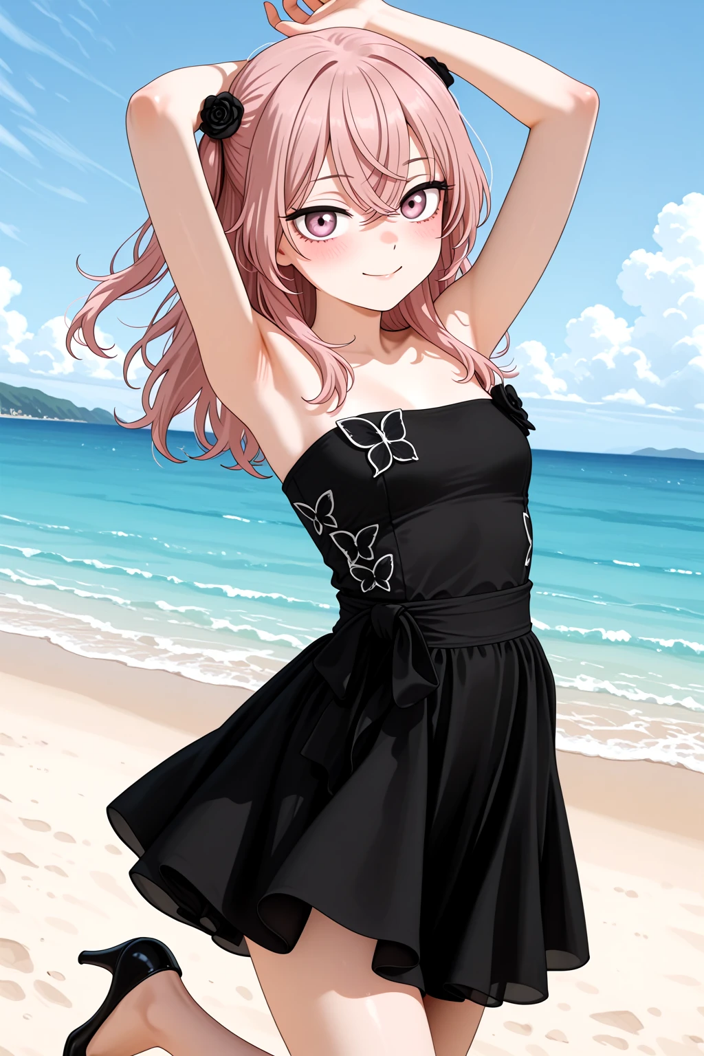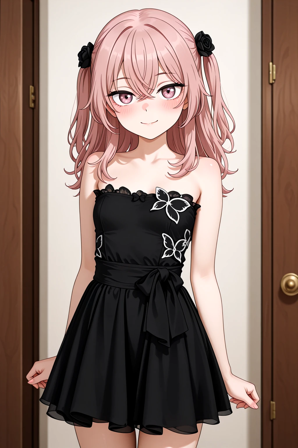 Butterfly_Appliqué_Black_Silk_Chiffon_Party_Dress, bare shoulders, bare arms, black dress, short dress, strapless, sleeveless, butterfly print, lace, sash, bow recommended weight: 1.0