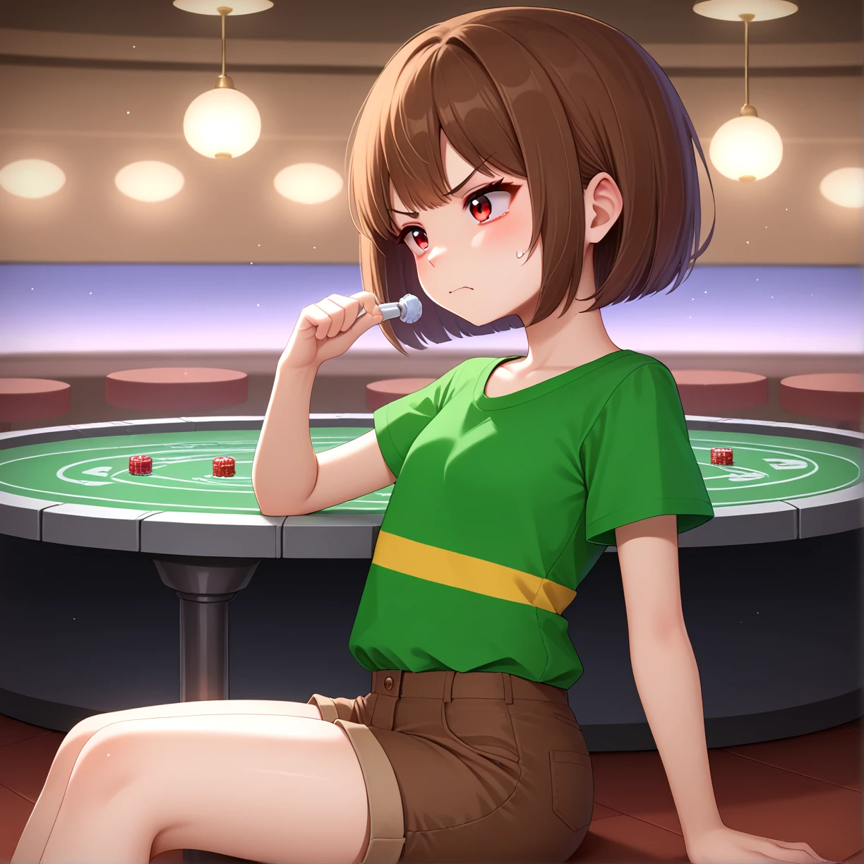green shirt, yellow striped, brown hair, red eyes,