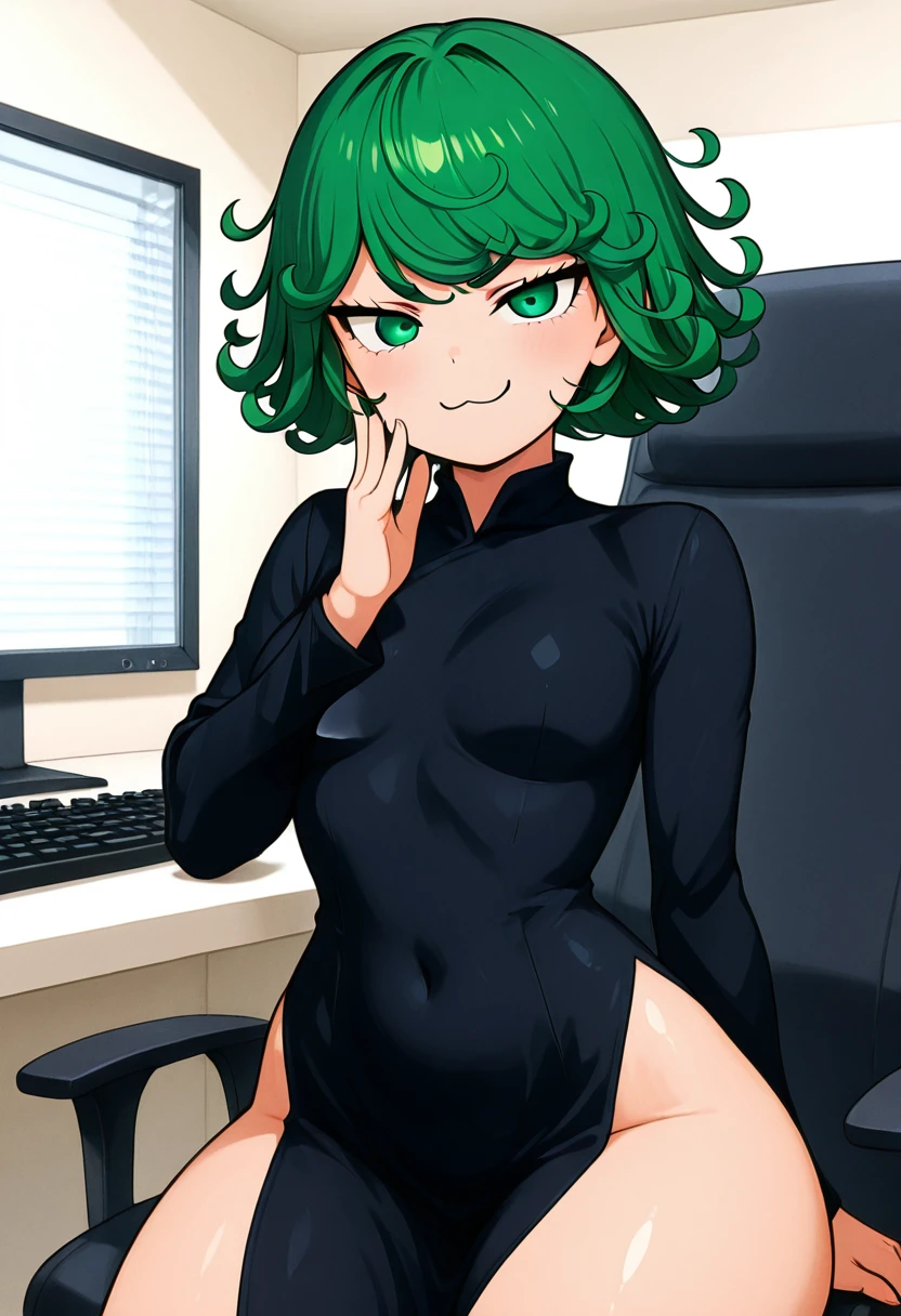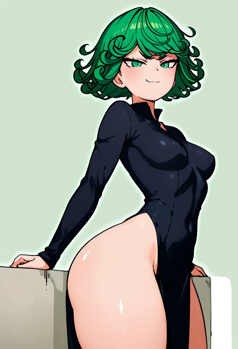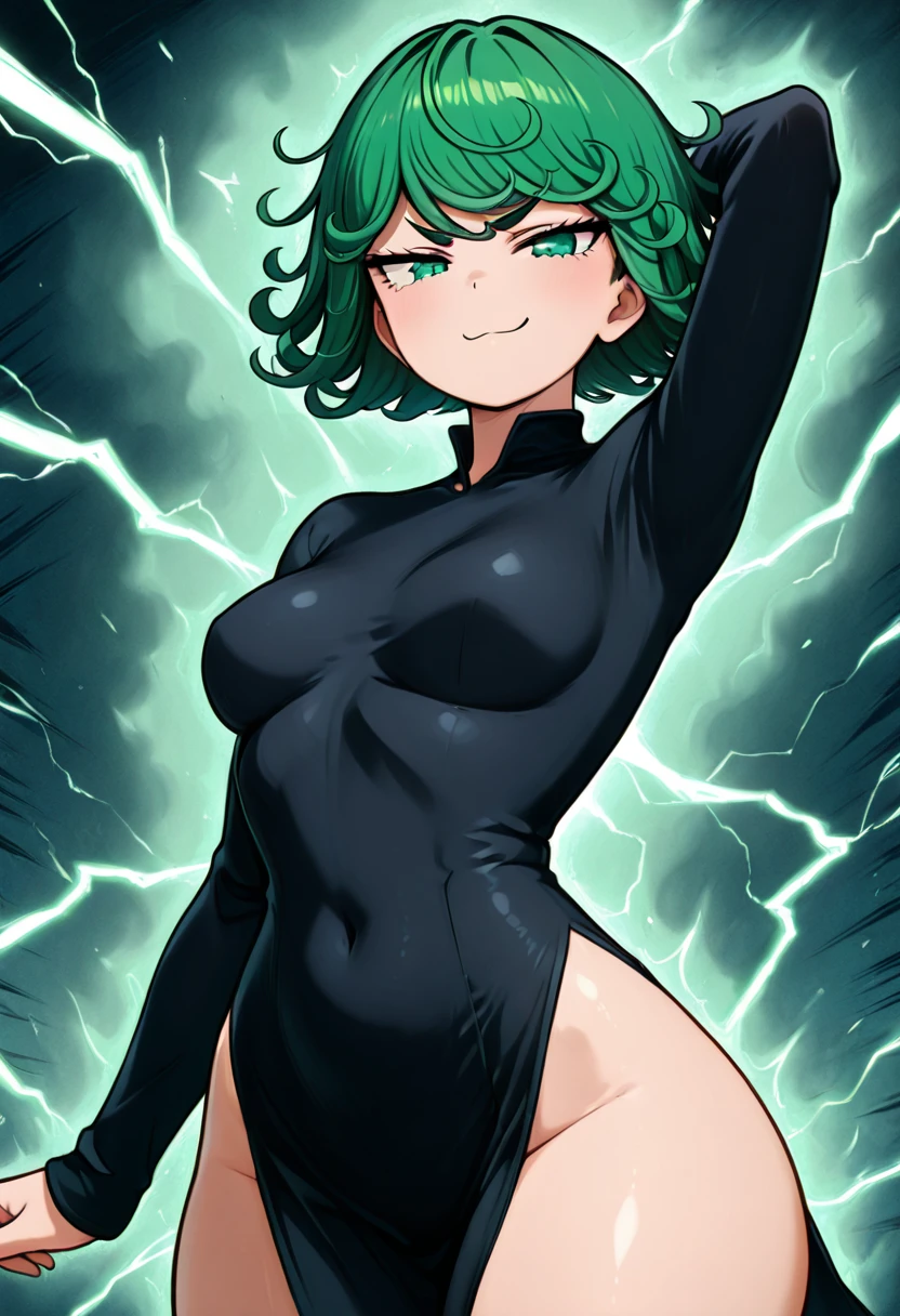 zzTatsumaki, green eyes, green hair, short hair, curly hair, flipped hair, black dress, side slit, thighs, wide hips, curvy, smug,