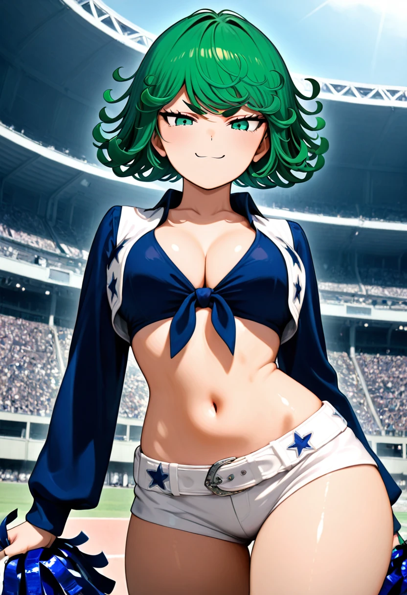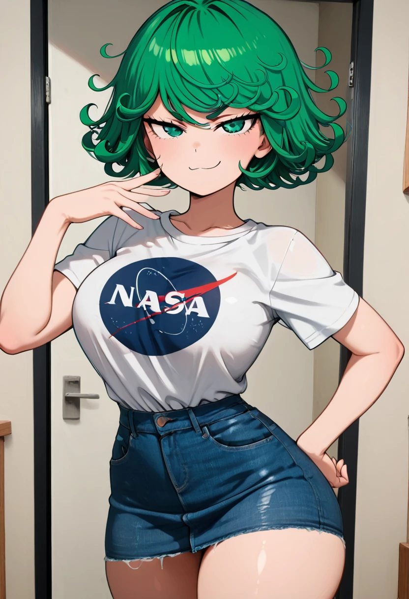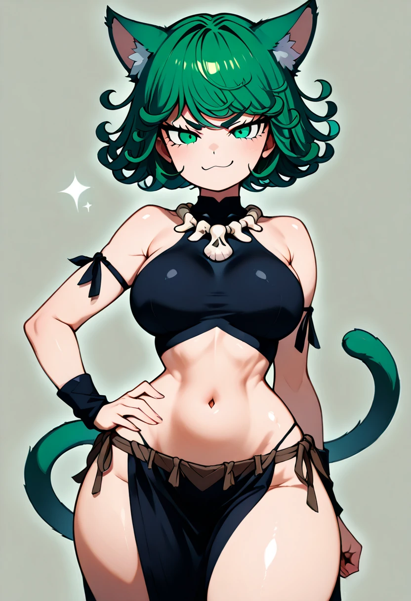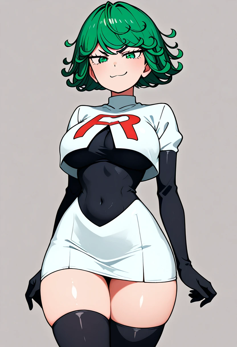 zzTatsumaki, green eyes, green hair, short hair, curly hair, flipped hair, black dress, side slit, thighs, wide hips, curvy, smug,