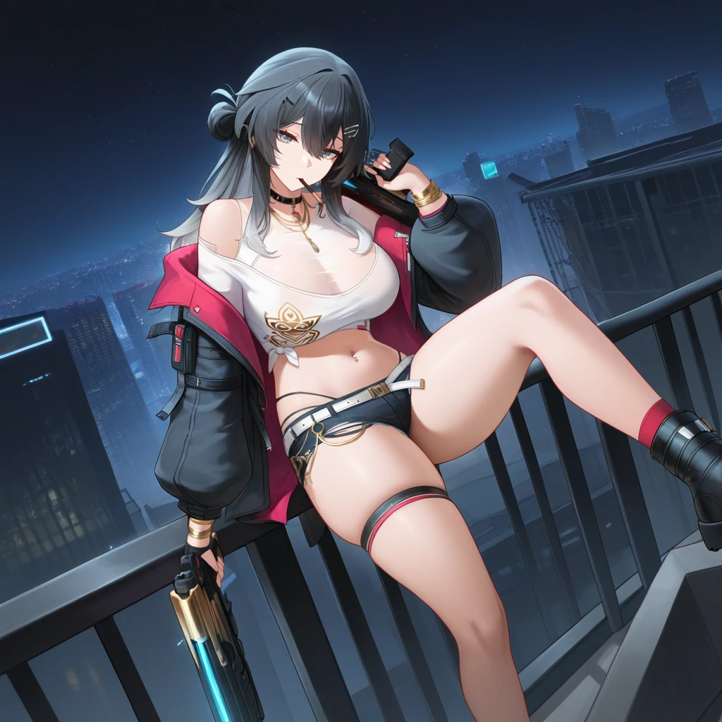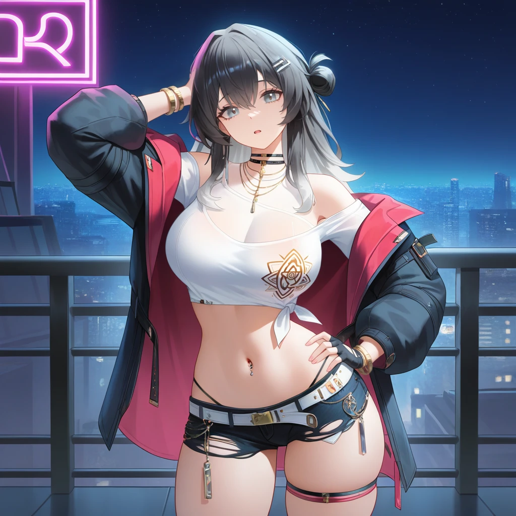 ParvatiAG, Prv_Def, grey eyes, grey hair, gradient hair, see-through cleavage, crop top, white shirt, off-shoulder shirt, tied shirt, print shirt, multiple necklaces, belt choker, black choker, hairclip, off shoulder, open jacket, midriff, navel piercing, single fingerless glove, black gloves, navel, black jacket, two-sided jacket, puffy long sleeves, uneven sleeves, black sleeves, gold bracelets, micro shorts, black shorts, denim shorts, torn shorts, white belt, buckle, ????? straps, thigh strap, black footwear, ankle boots, red socks, belt boots,Optional: For uncensored version remove "see-through cleavage," and add "cleavage".