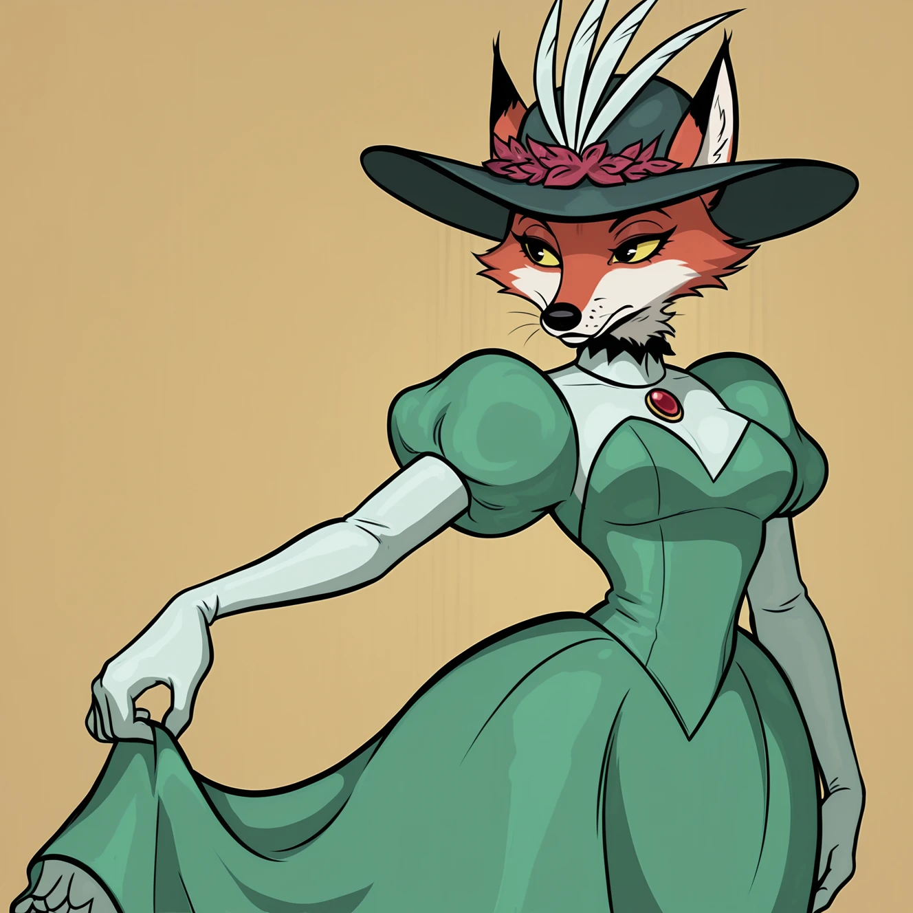 green clothing, fancy hat, classy, hat flower, hat feather, puffy sleeves, long sleeves, elbow gloves, petticoat, chest gem, ruby, white gloves, fully clothed