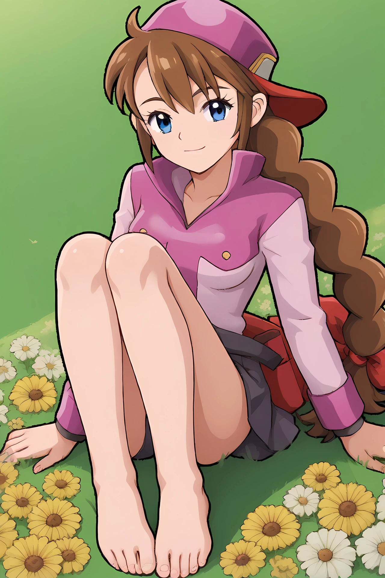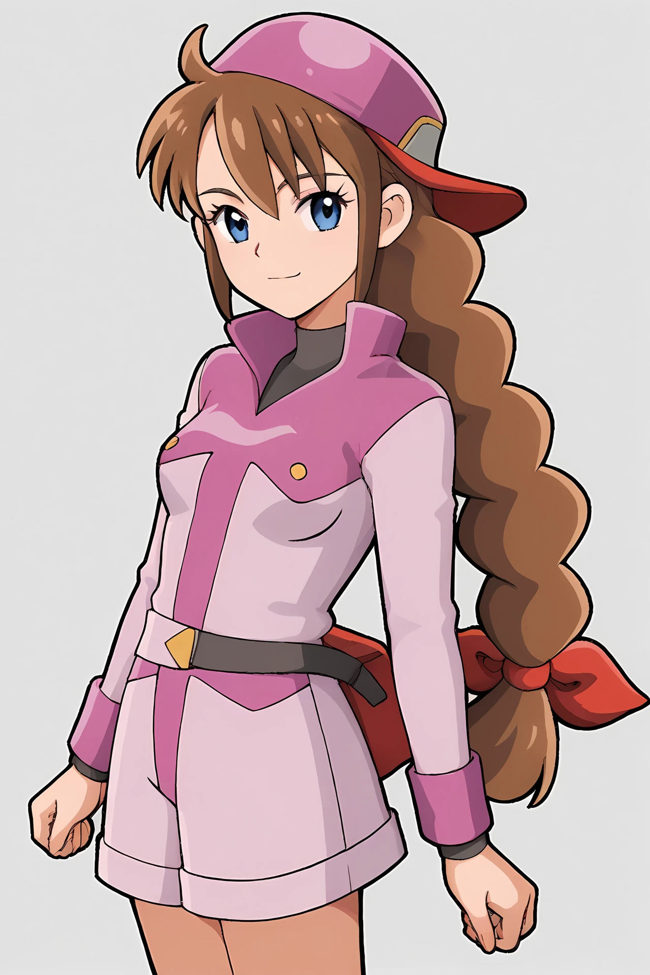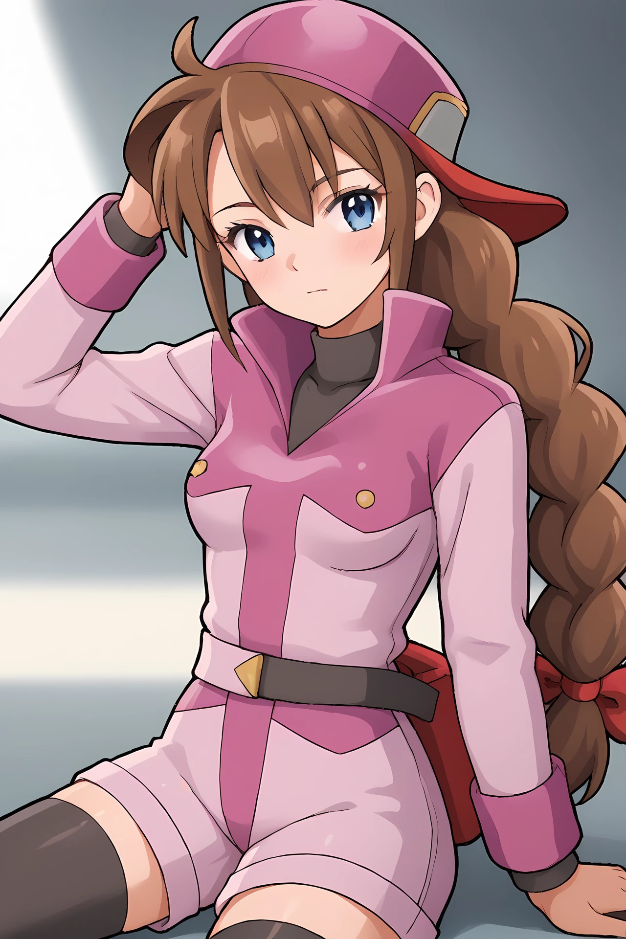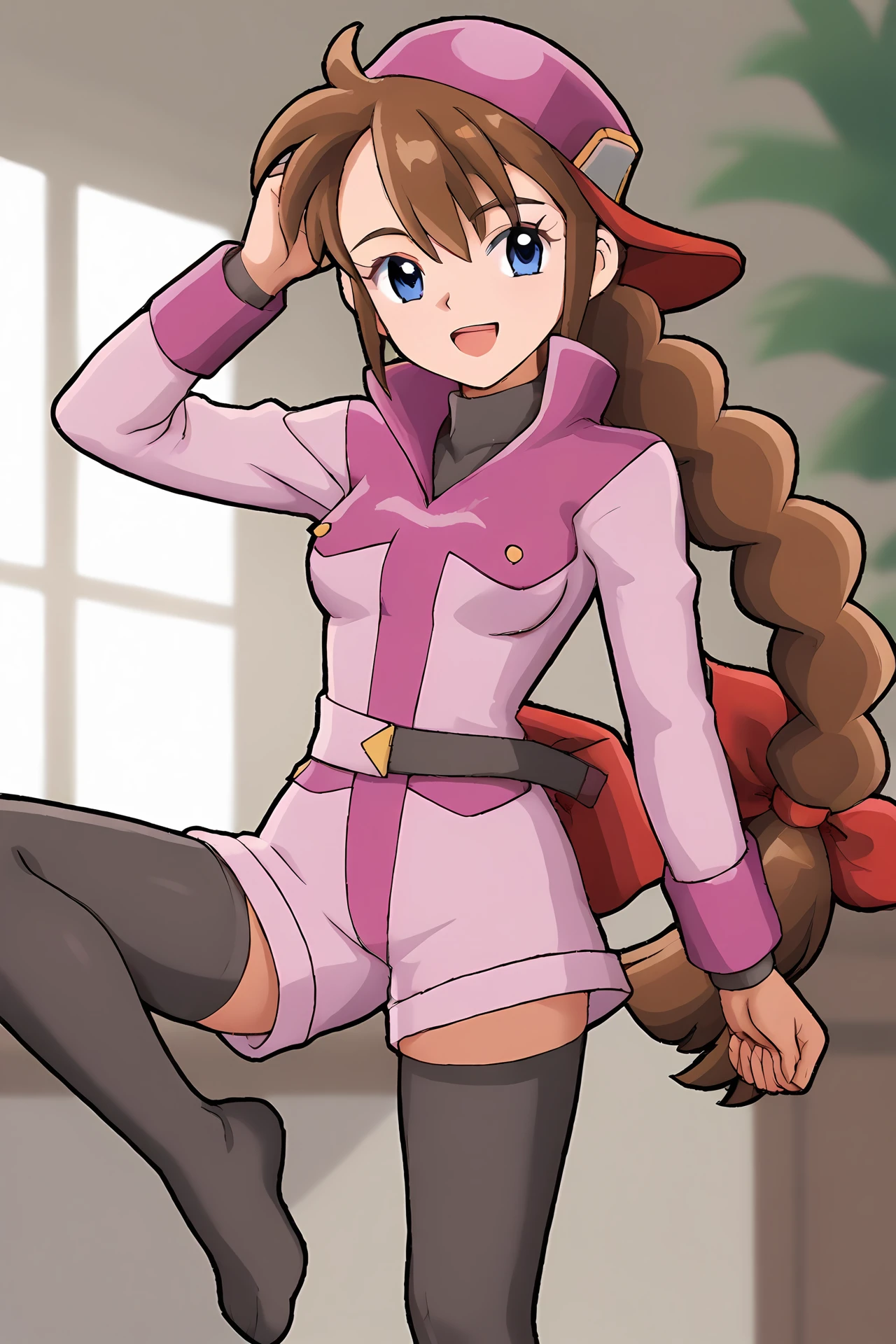 pink jacket, black turtleneck, pink shorts, belt, black thighhighs, brown boots