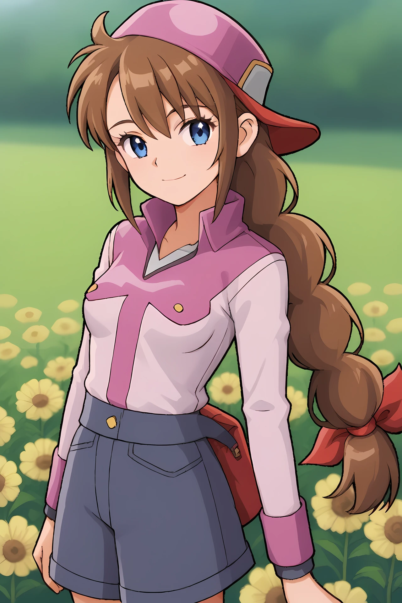 blue eyes, brown hair, single braid, bangs, red hair ribbon