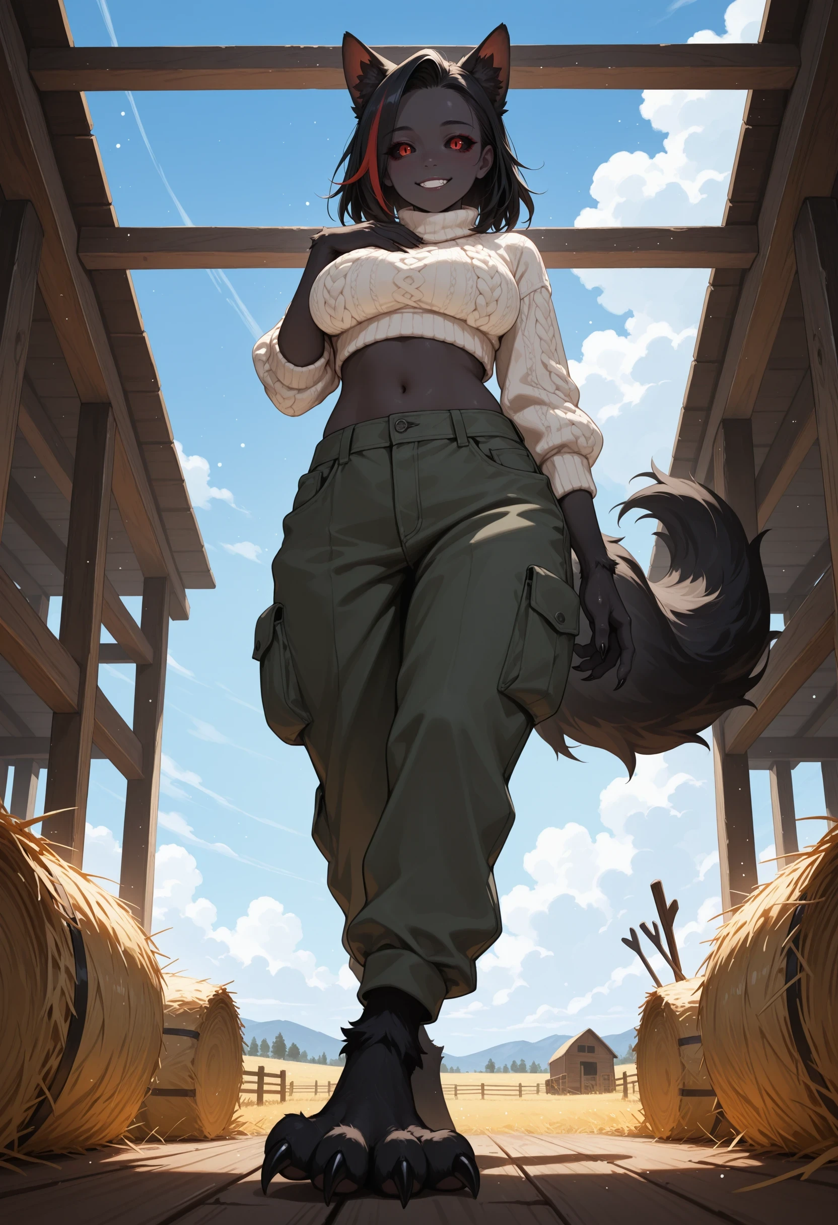 (Positive Prompts) lynhhound, monster girl, animal ears, animal ear fluff, animal feet, fur, fluffy tail, claws, colored skin, dark skin, black skin, colored sclera, black sclera,