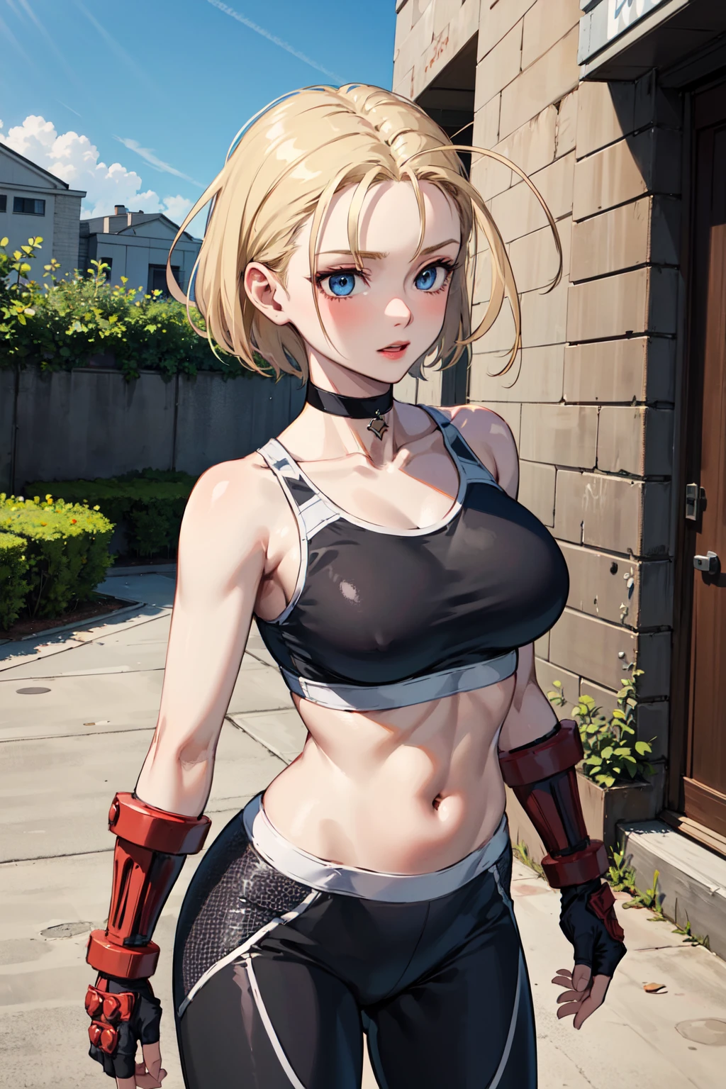 outfit3 (no jacket)cammy white, short hair, antenna hair, blue eyes, scar on cheek, large breasts, black choker, collarbone, sports bra, midriff, fingerless gloves, black gloves, black pants