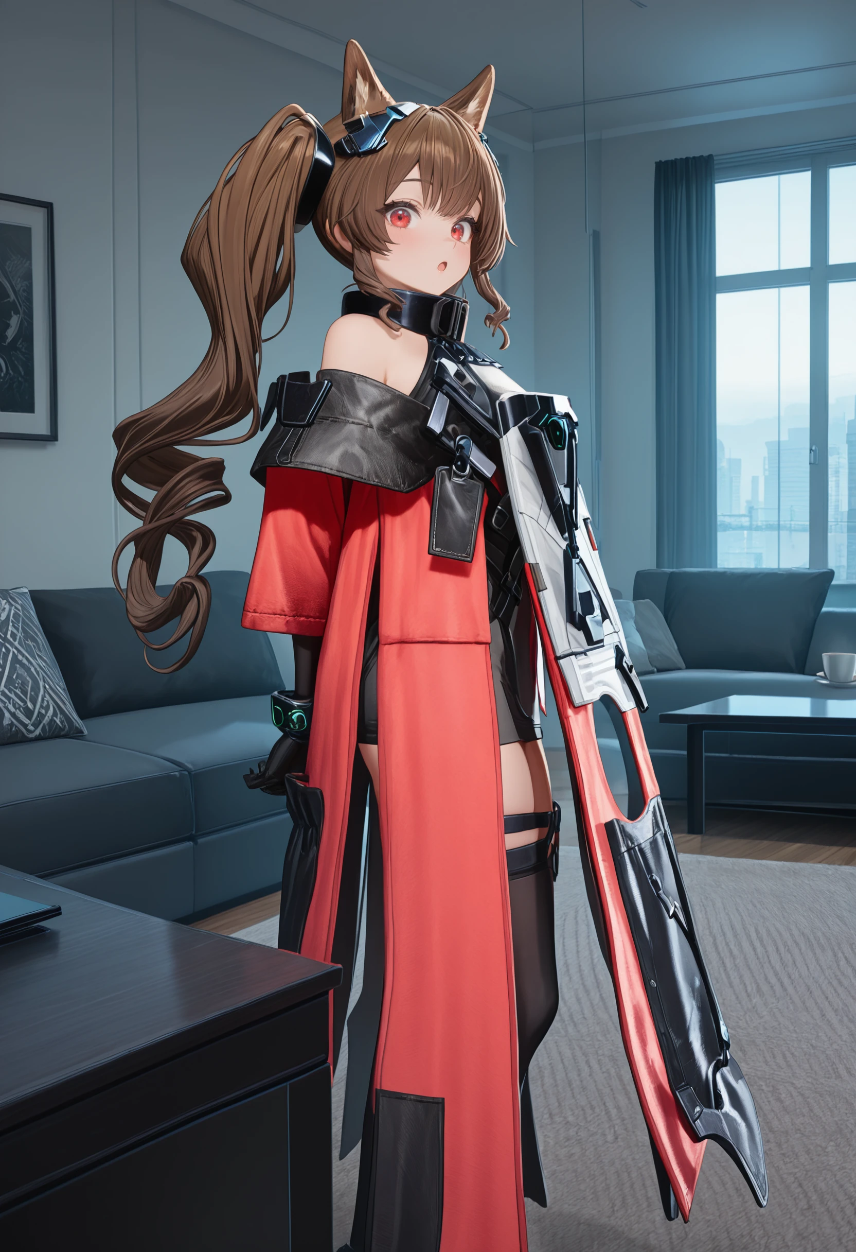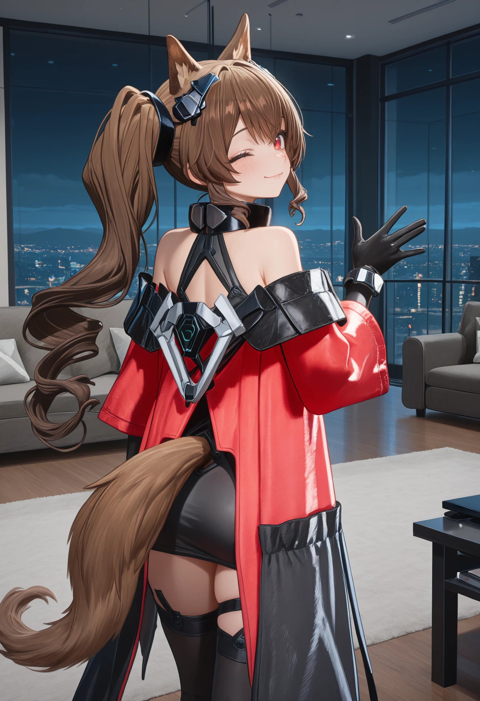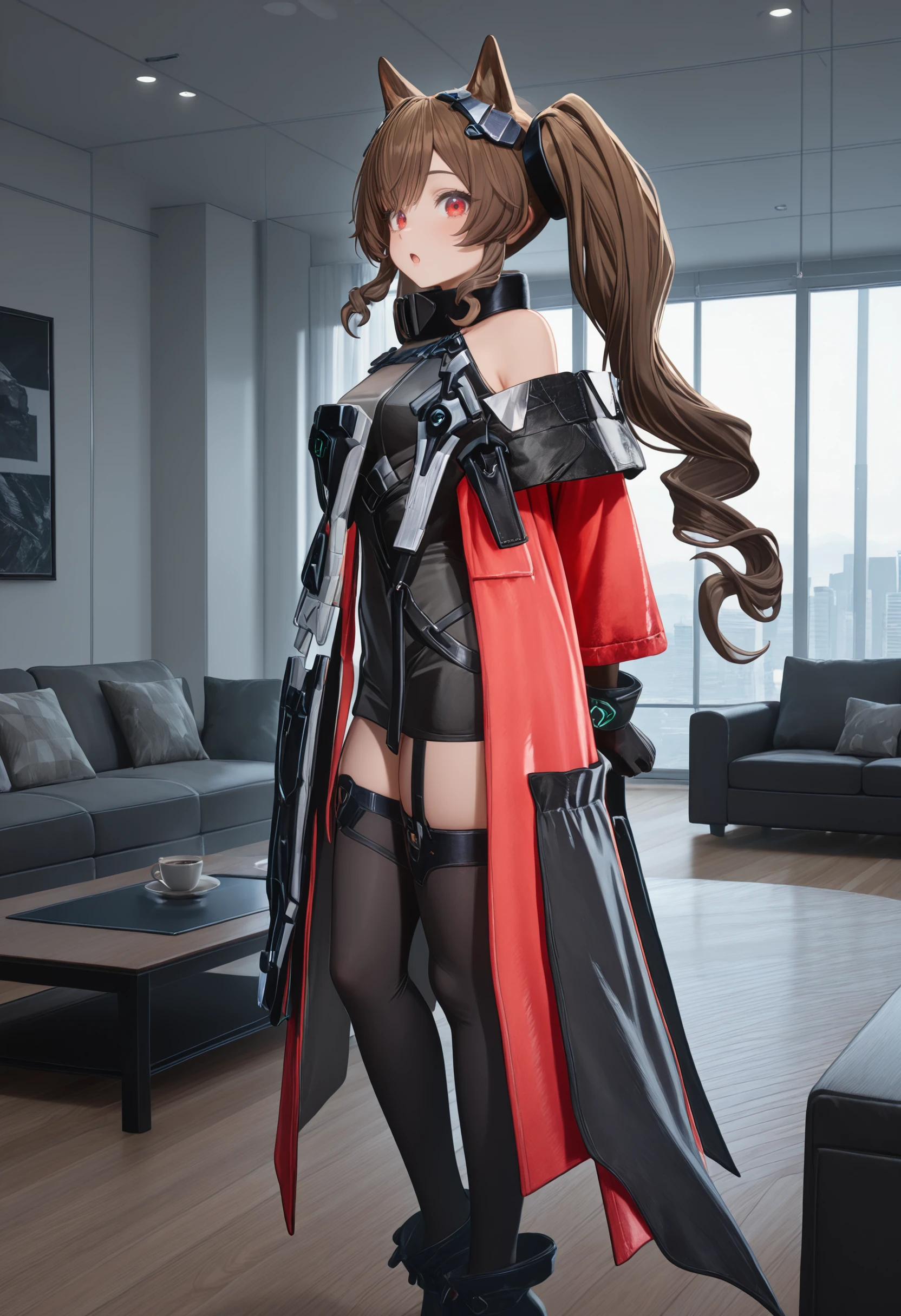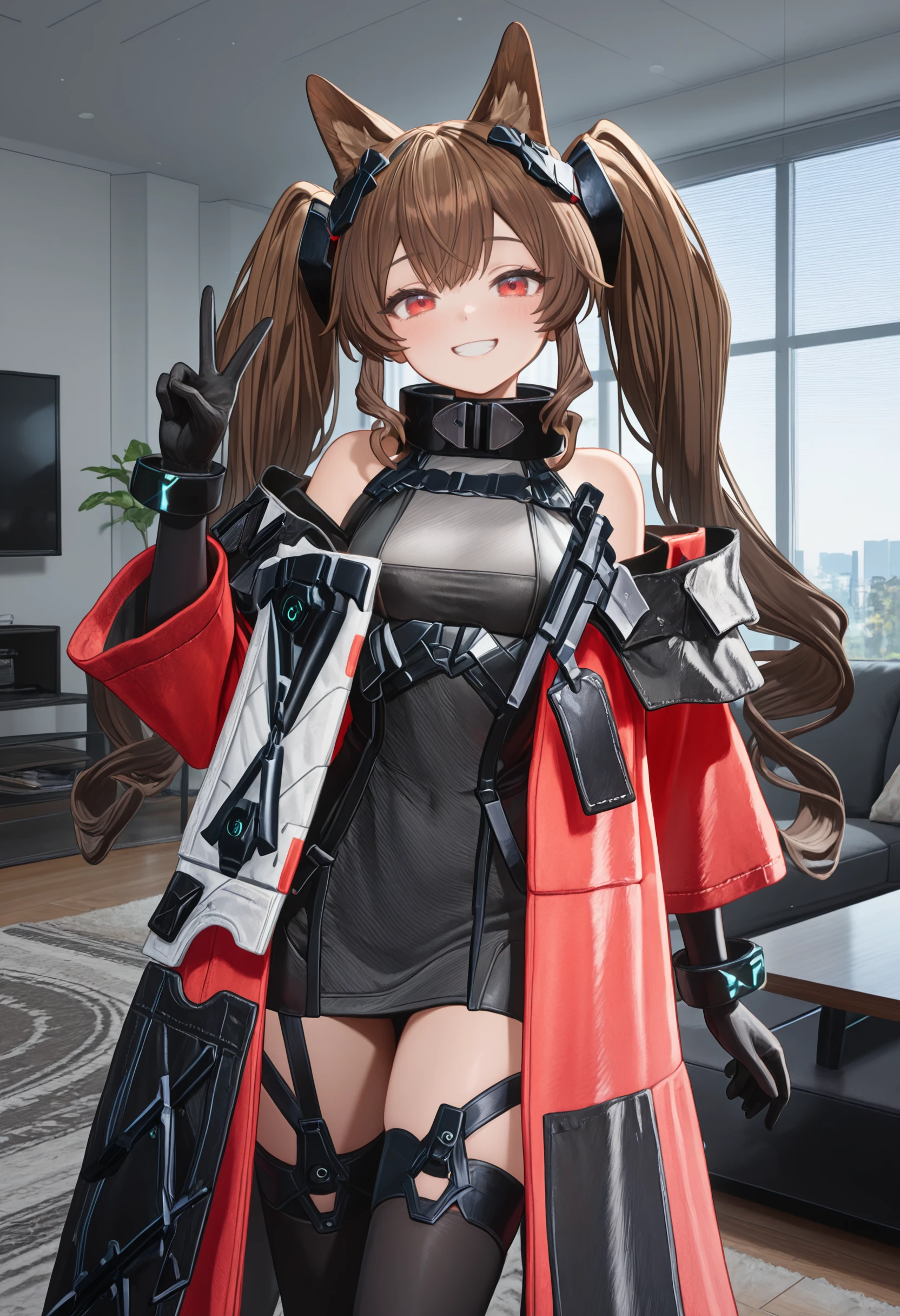 black collar, black mini dress, dress straps, long red jacket, side chest module, long chest module, white and black tabard, metal chest module, shoulder cut, free shoulder, black jacket fold, black gloves, metal wristbands, thigh straps, thighhighs, black shoes, high heels, brown dog tail,