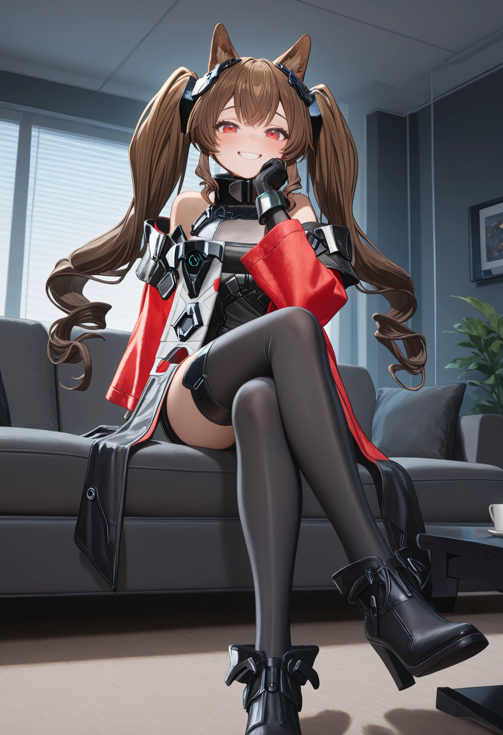 endfield style, 1girl, Gilberta, solo, brown hair, bangs, sideburns, twin ponytails, hair ringlets, dog ears, metal ponytail holders, red eyes,