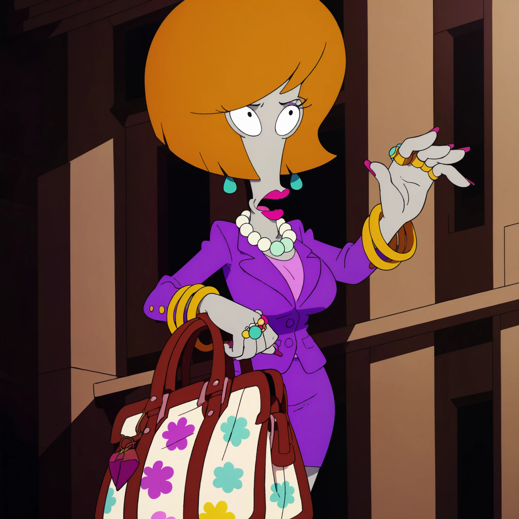 Jeannie Gold, brown hair, 1girl, solo, short hair, black bars, purple jacket, grey skin, lipstick, jewelry, breasts, skirt, pearl neckless, high heels, large breasts