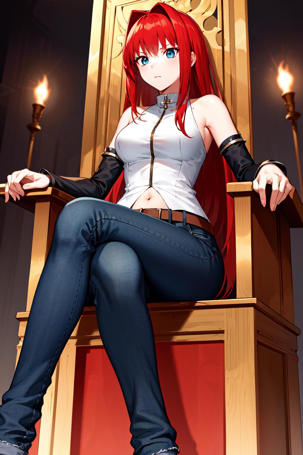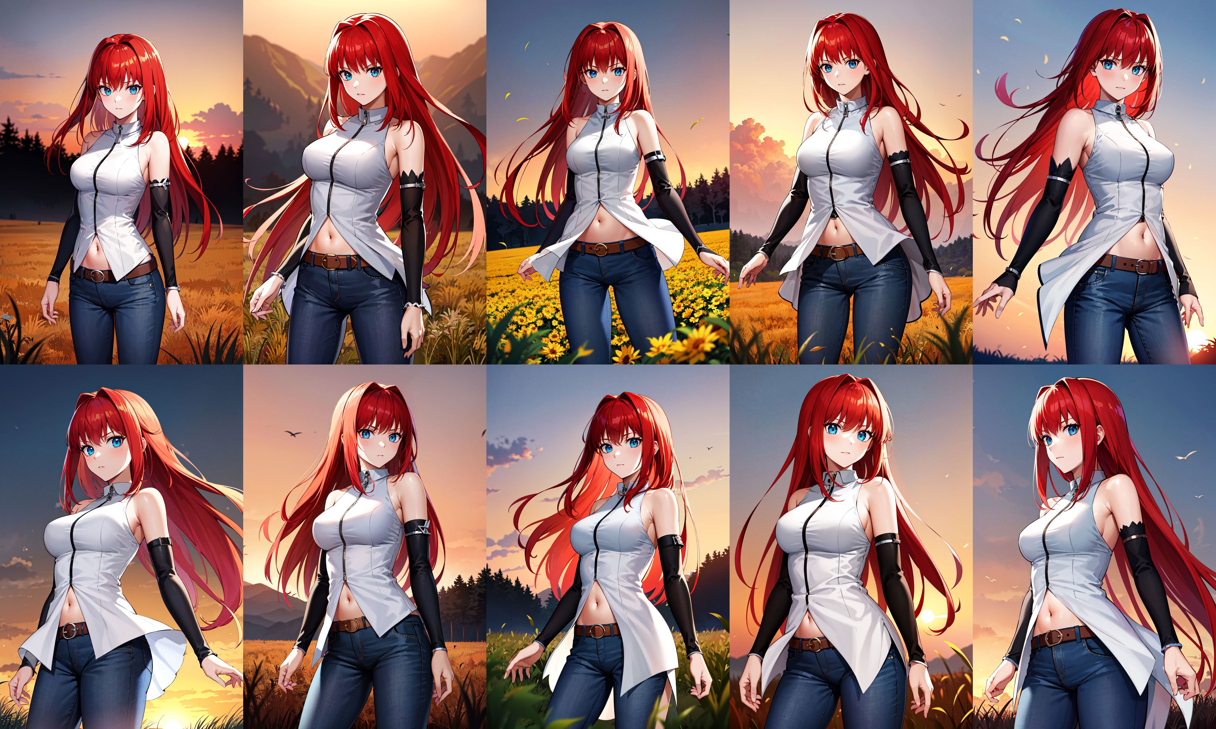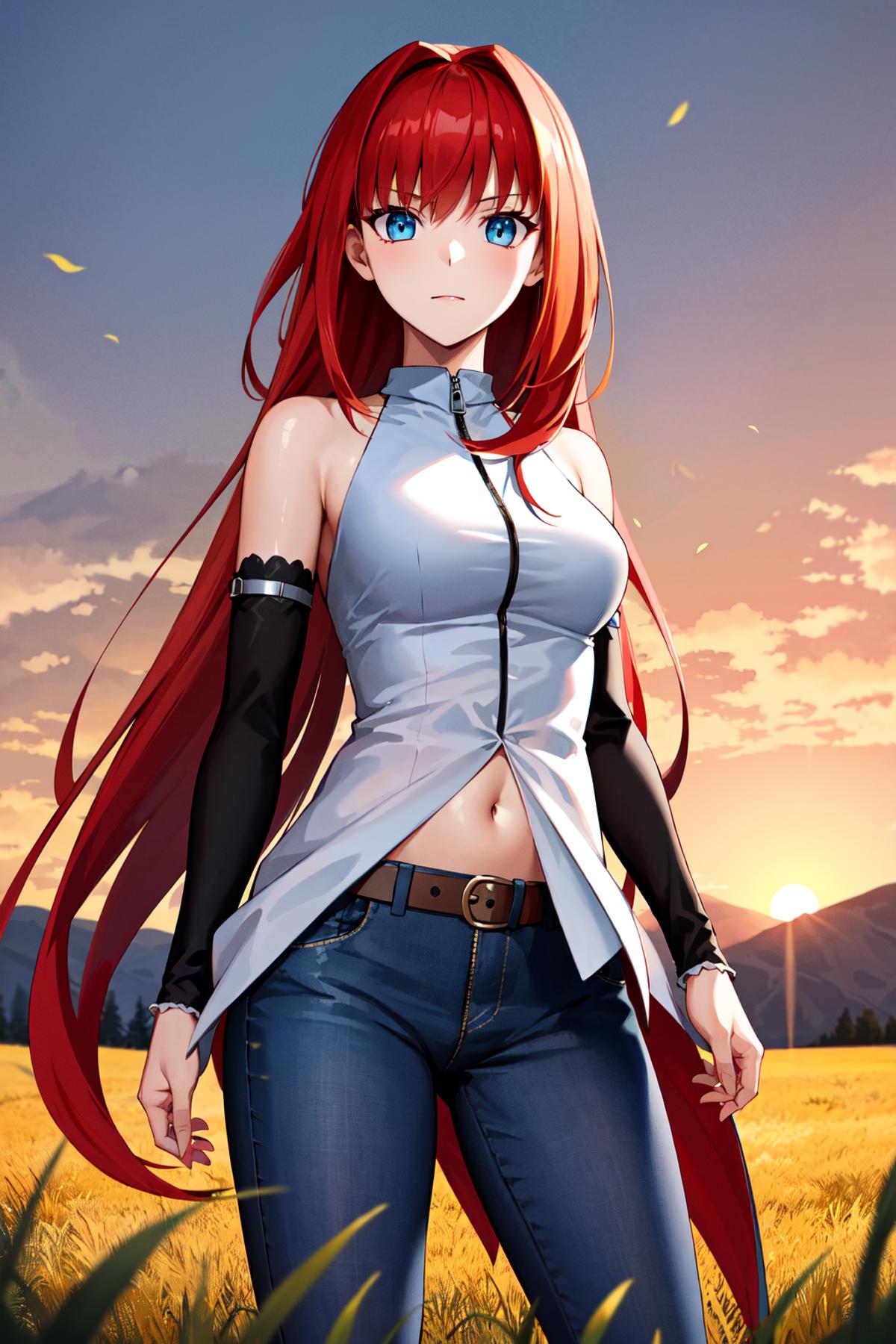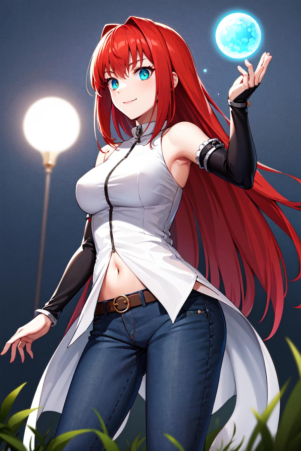 eeaoko, long hair, red hair, bare shoulders, sleeveless shirt, dress shirt, detached sleeves, black sleeves, zipper, navel, belt, jeans