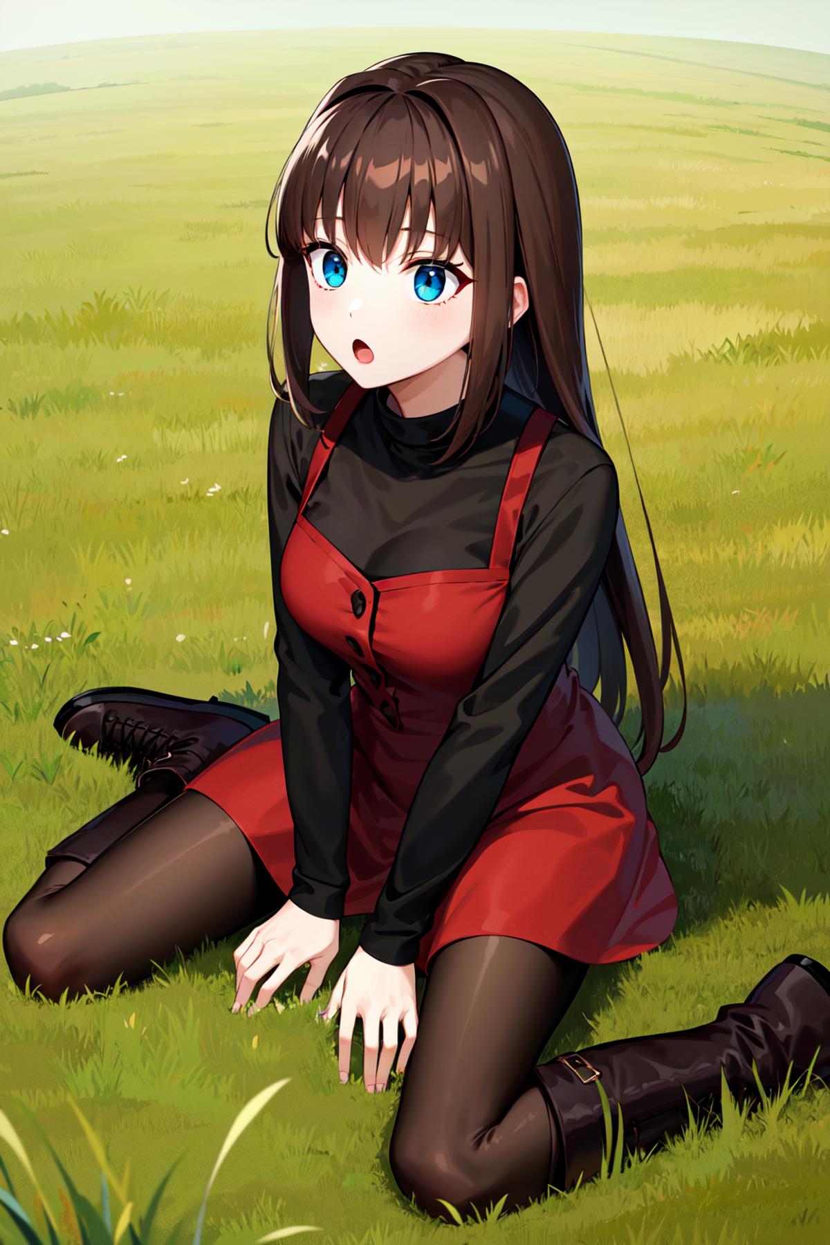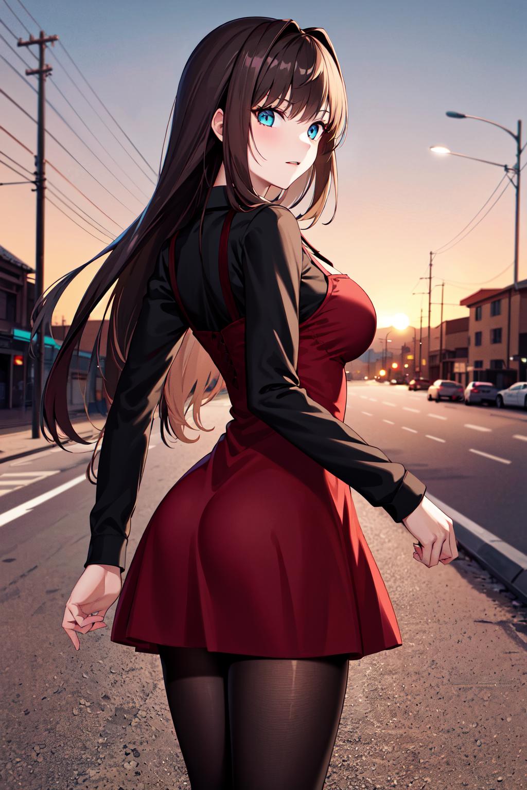 aaaoko, long hair, brown hair, black shirt, red dress, long sleeves, black pantyhose