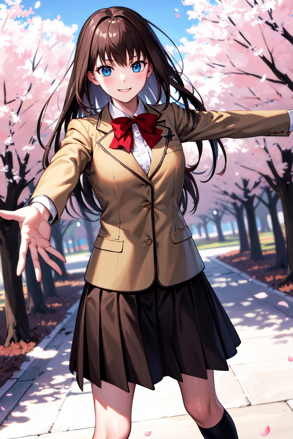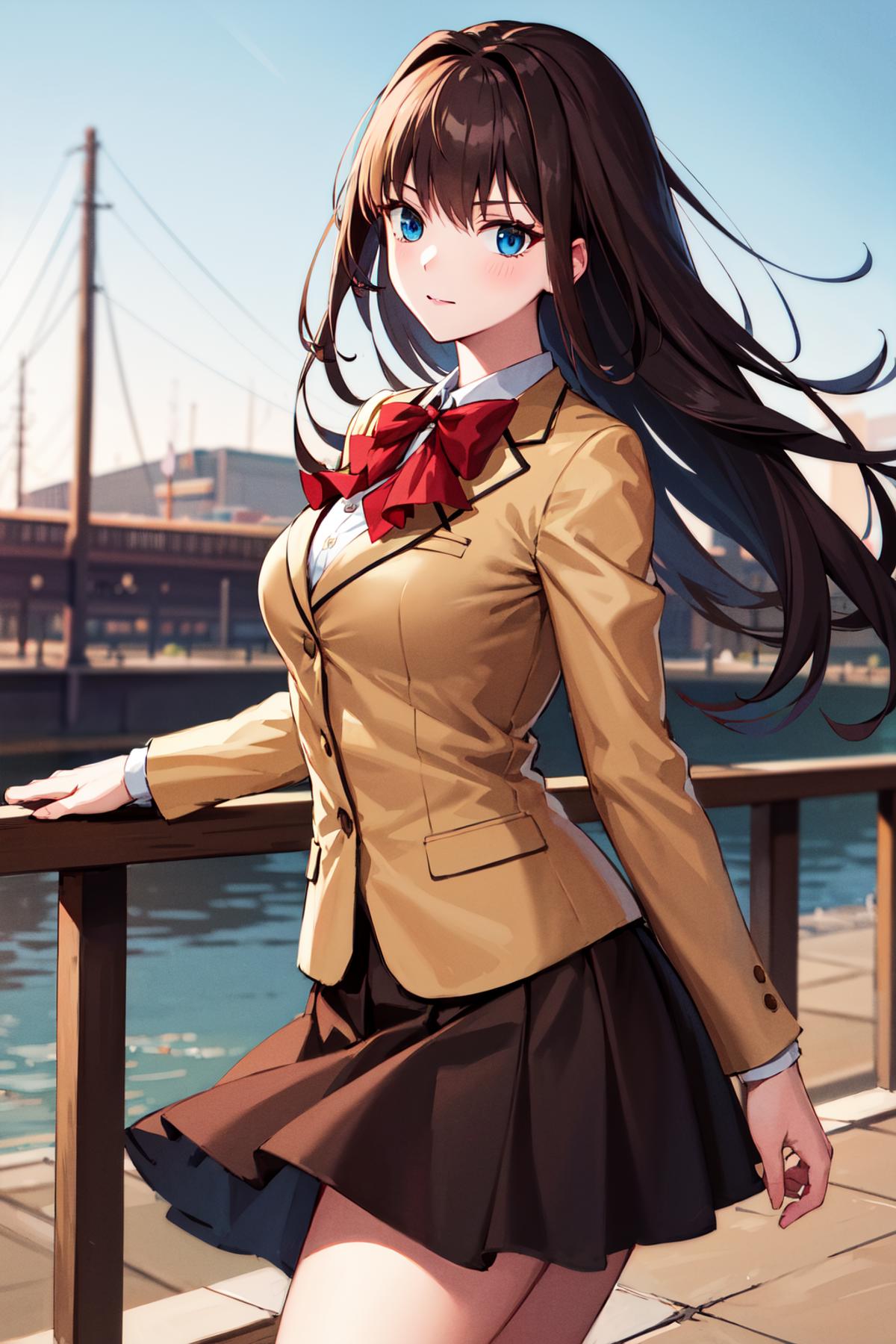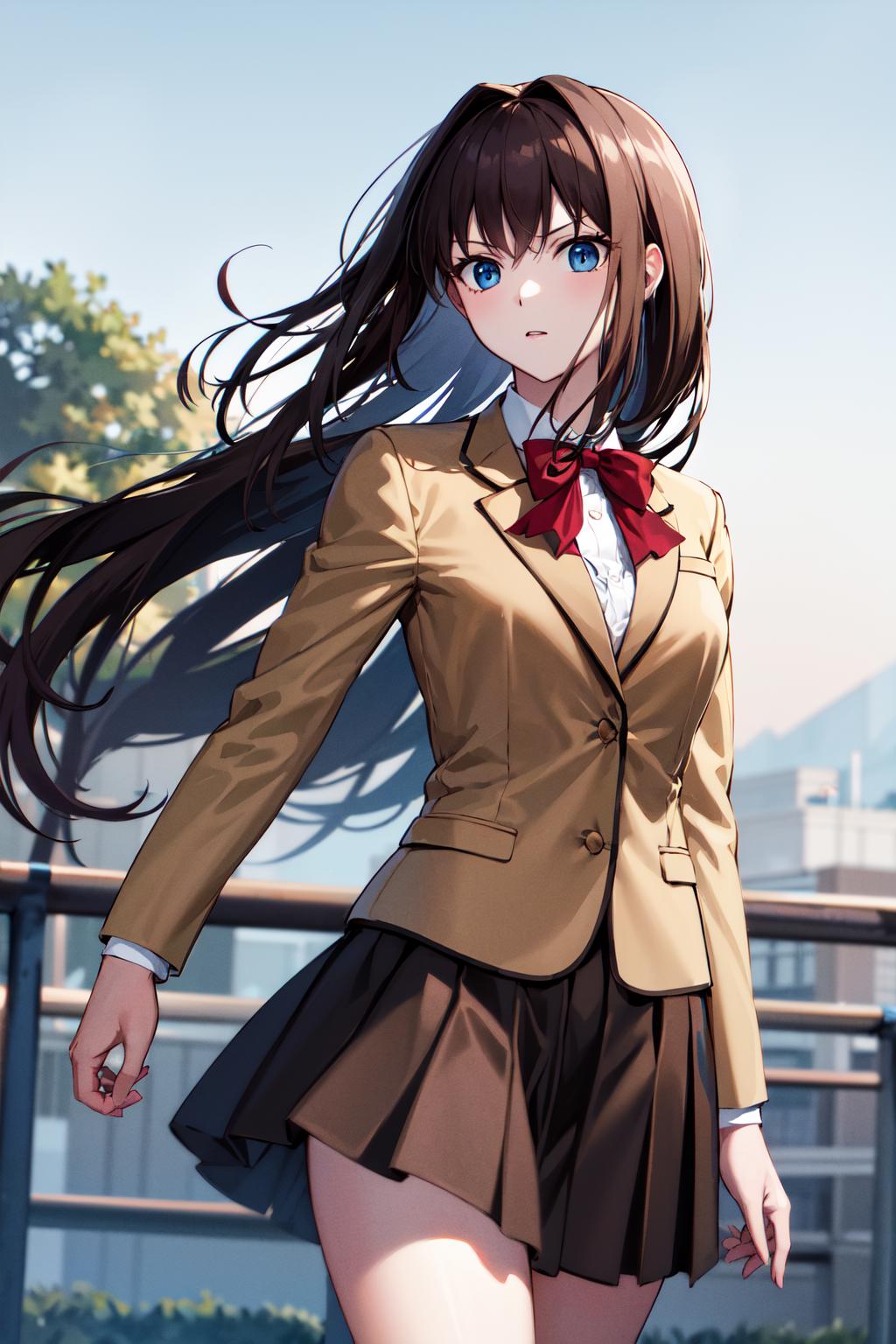 bbaoko, long hair, brown hair, school uniform, red bow, blazer, brown jacket, black skirt, black socks