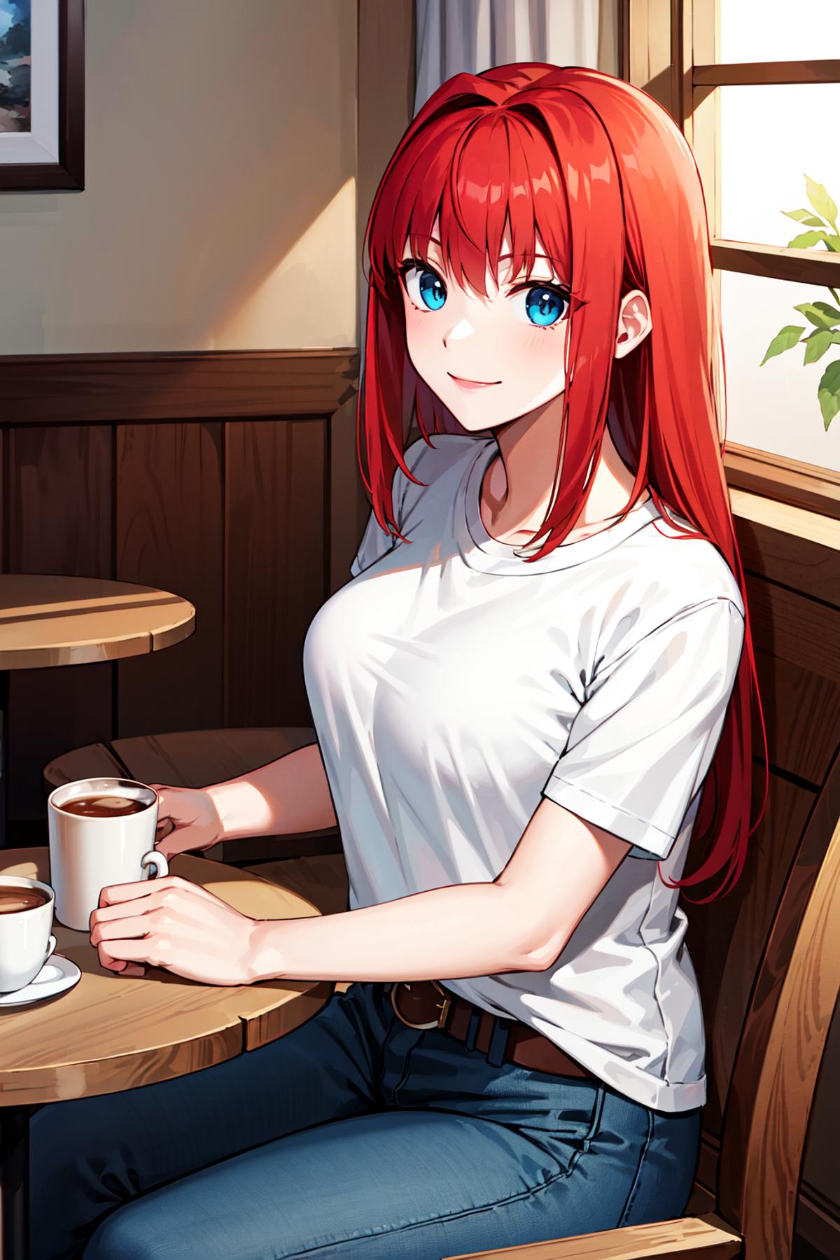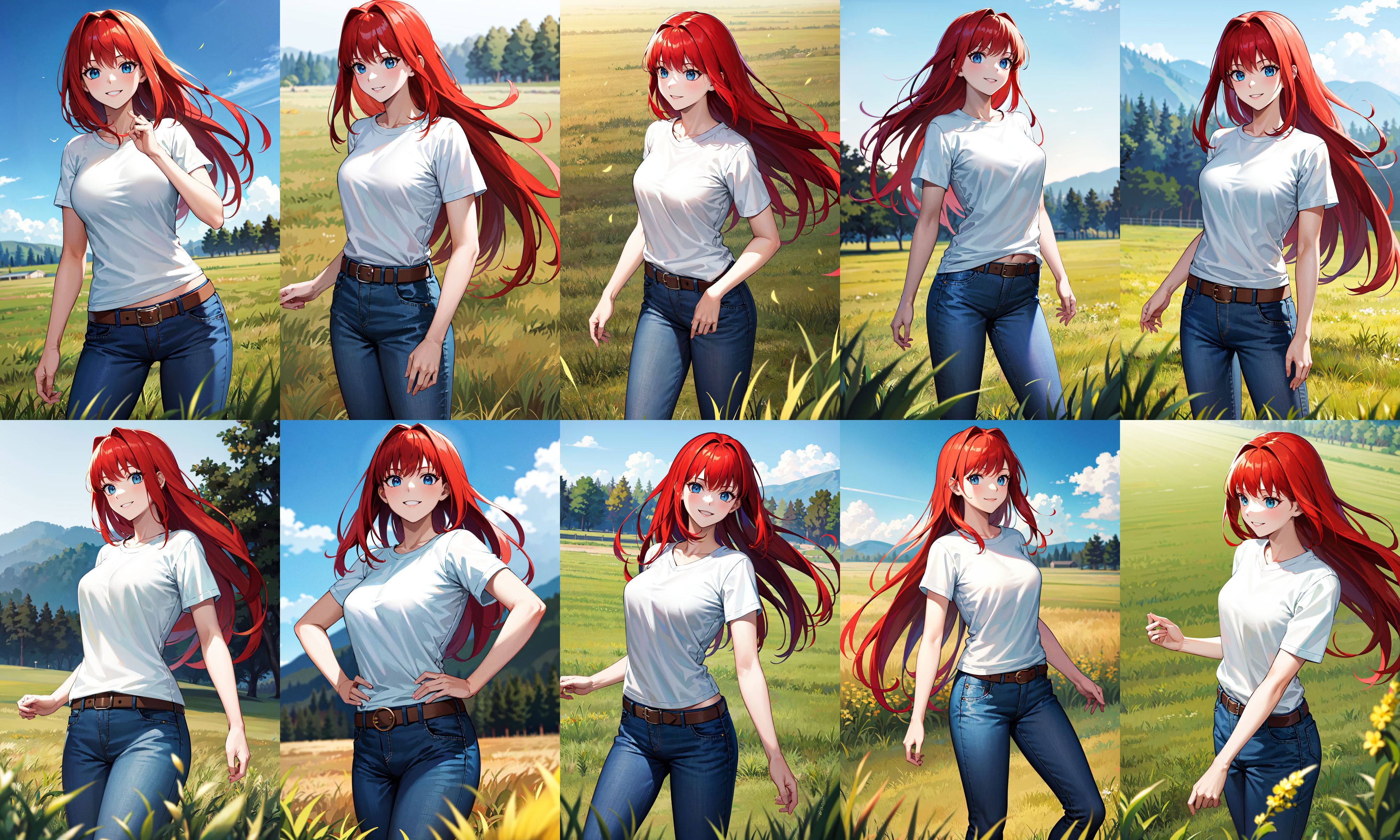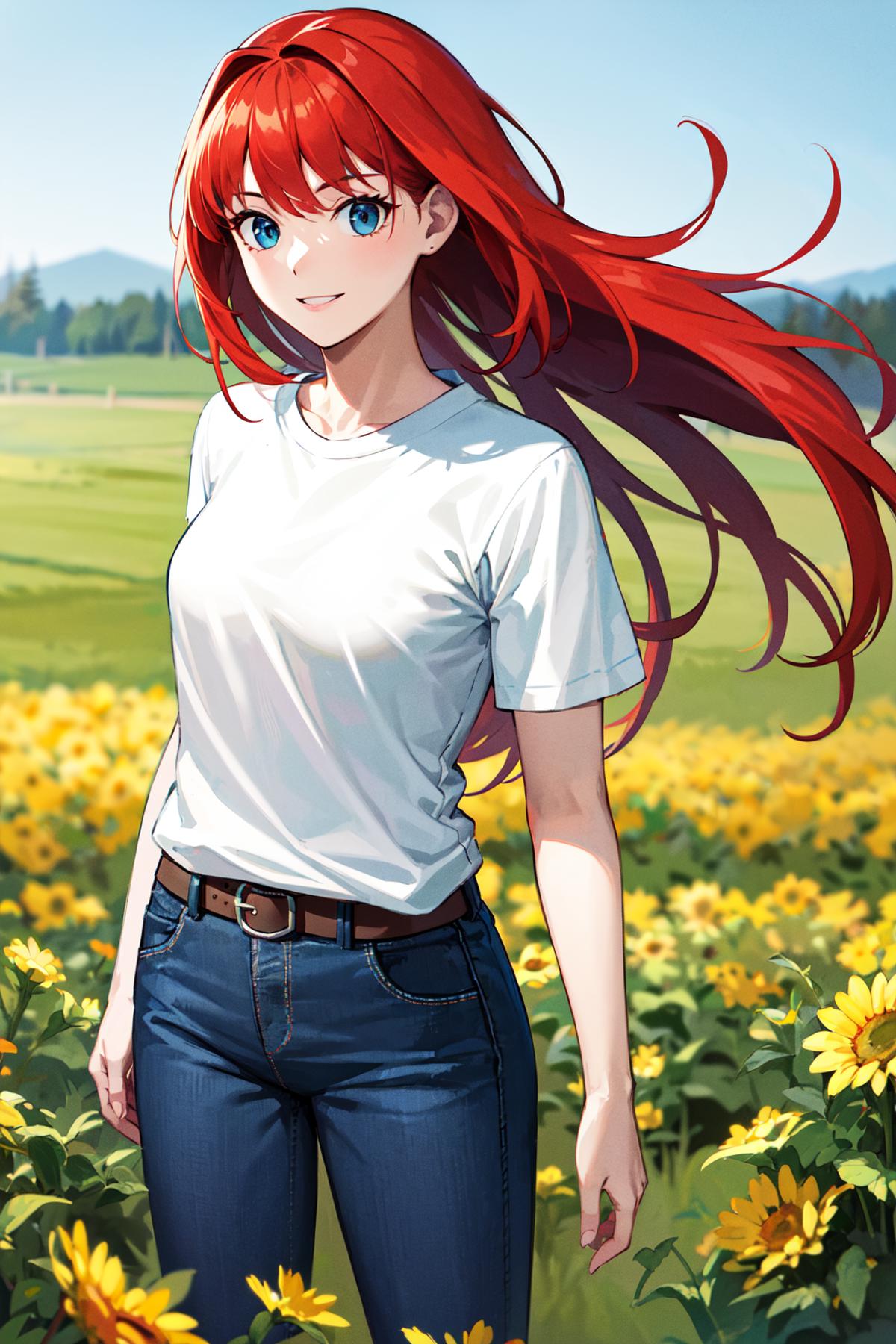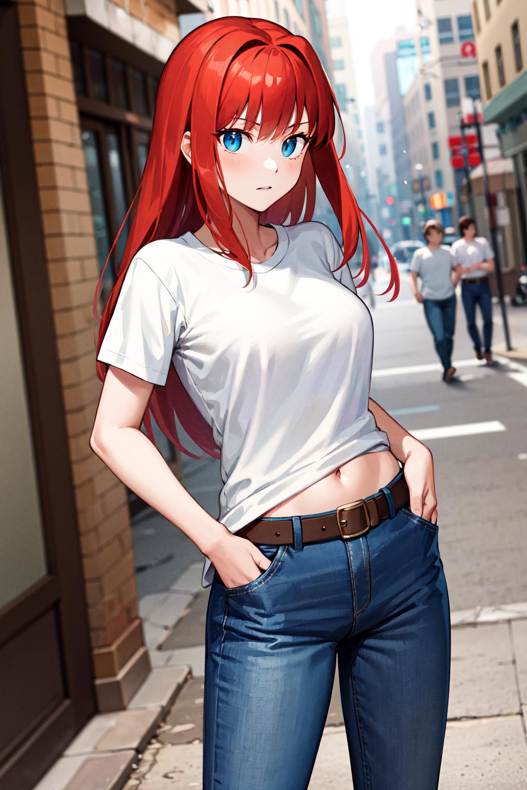 ffaoko, long hair, red hair, t-shirt, white shirt, belt, blue pants