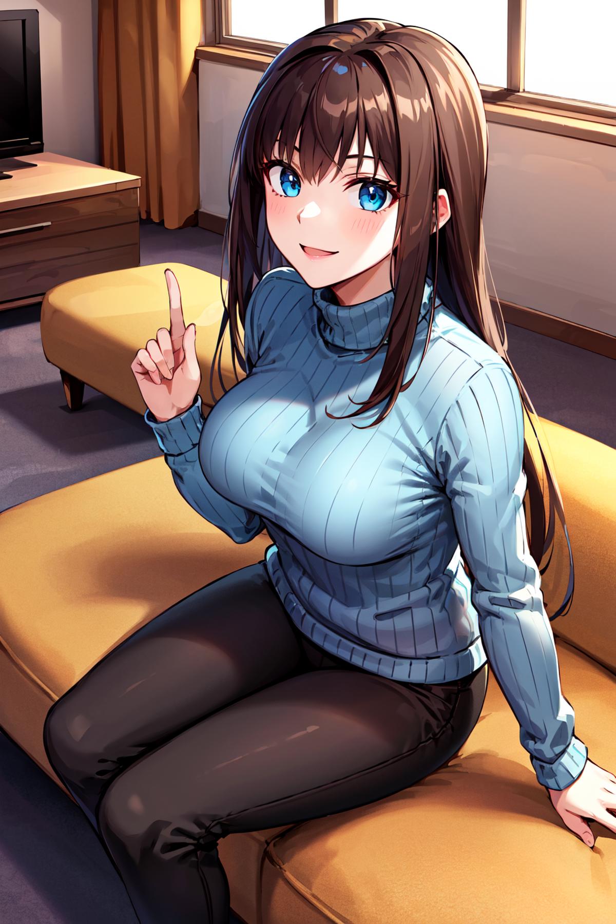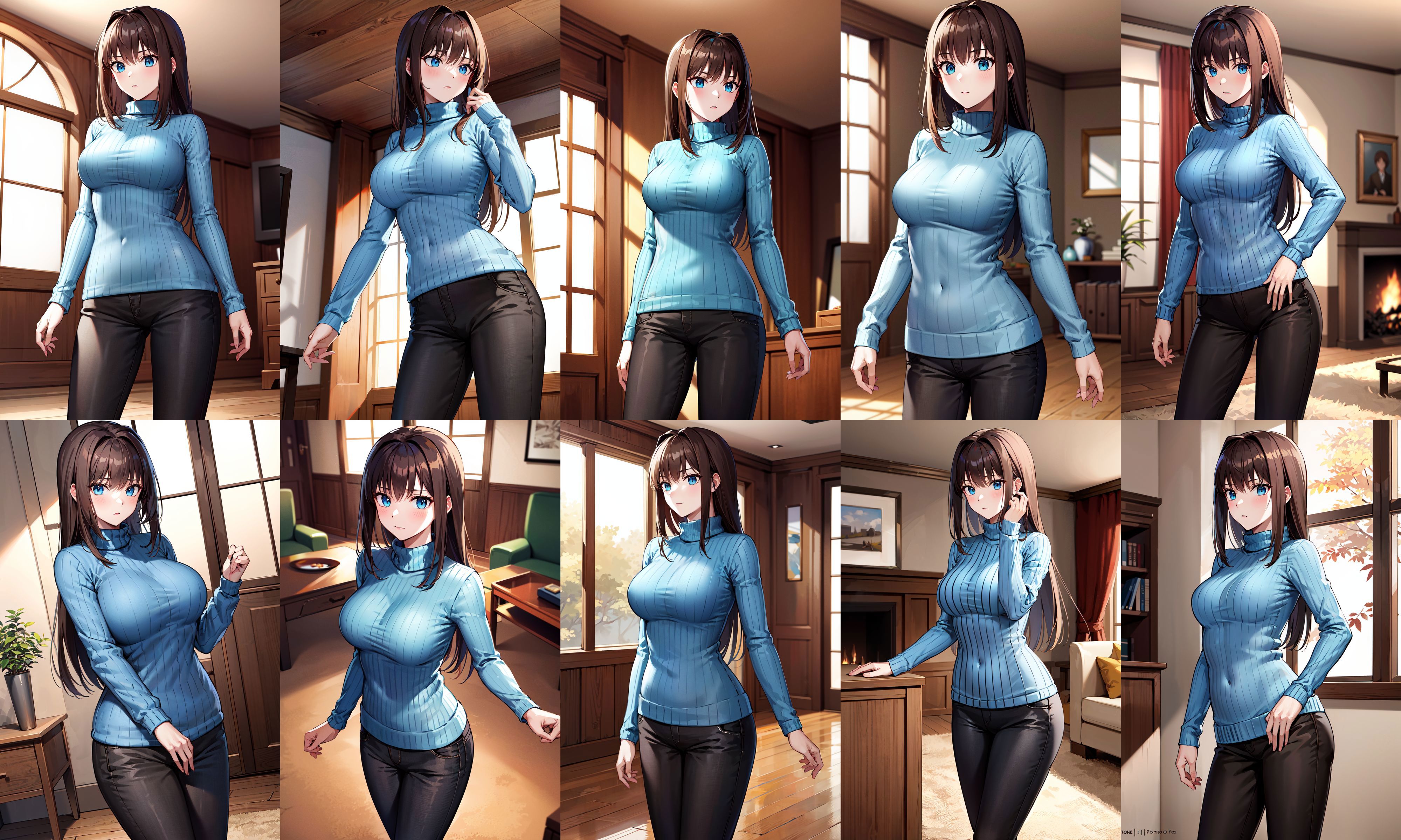 ccaoko, long hair, brown hair, turtleneck, blue sweater, ribbed sweater, long sleeves, black pants