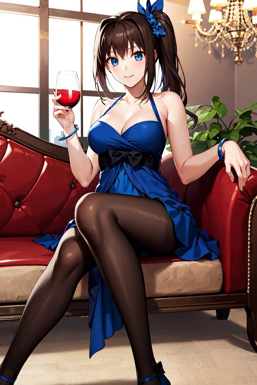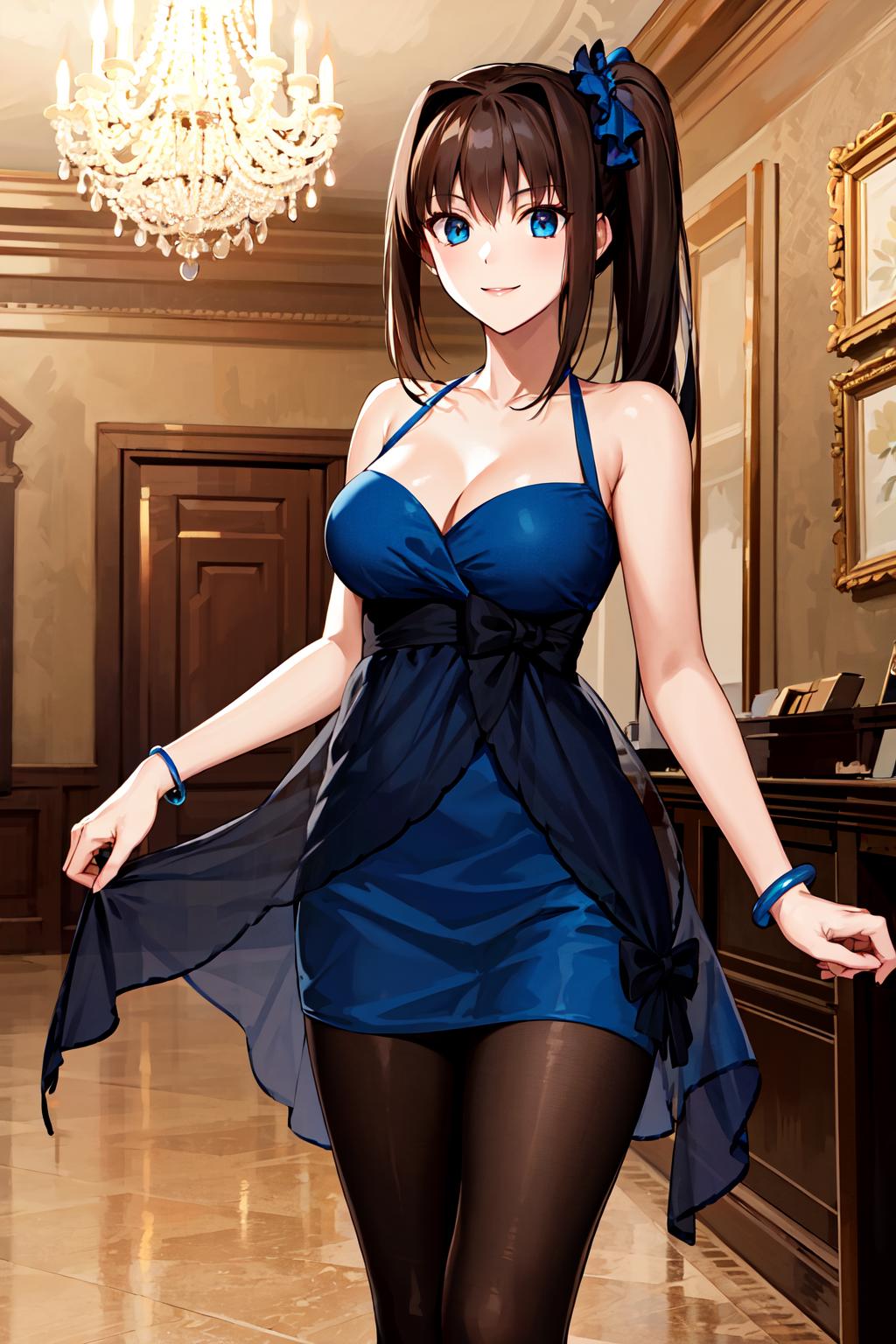 ddaoko, long hair, brown hair, side ponytail, hair ornament, bare shoulders, blue dress, black bow, bracelet, black pantyhose