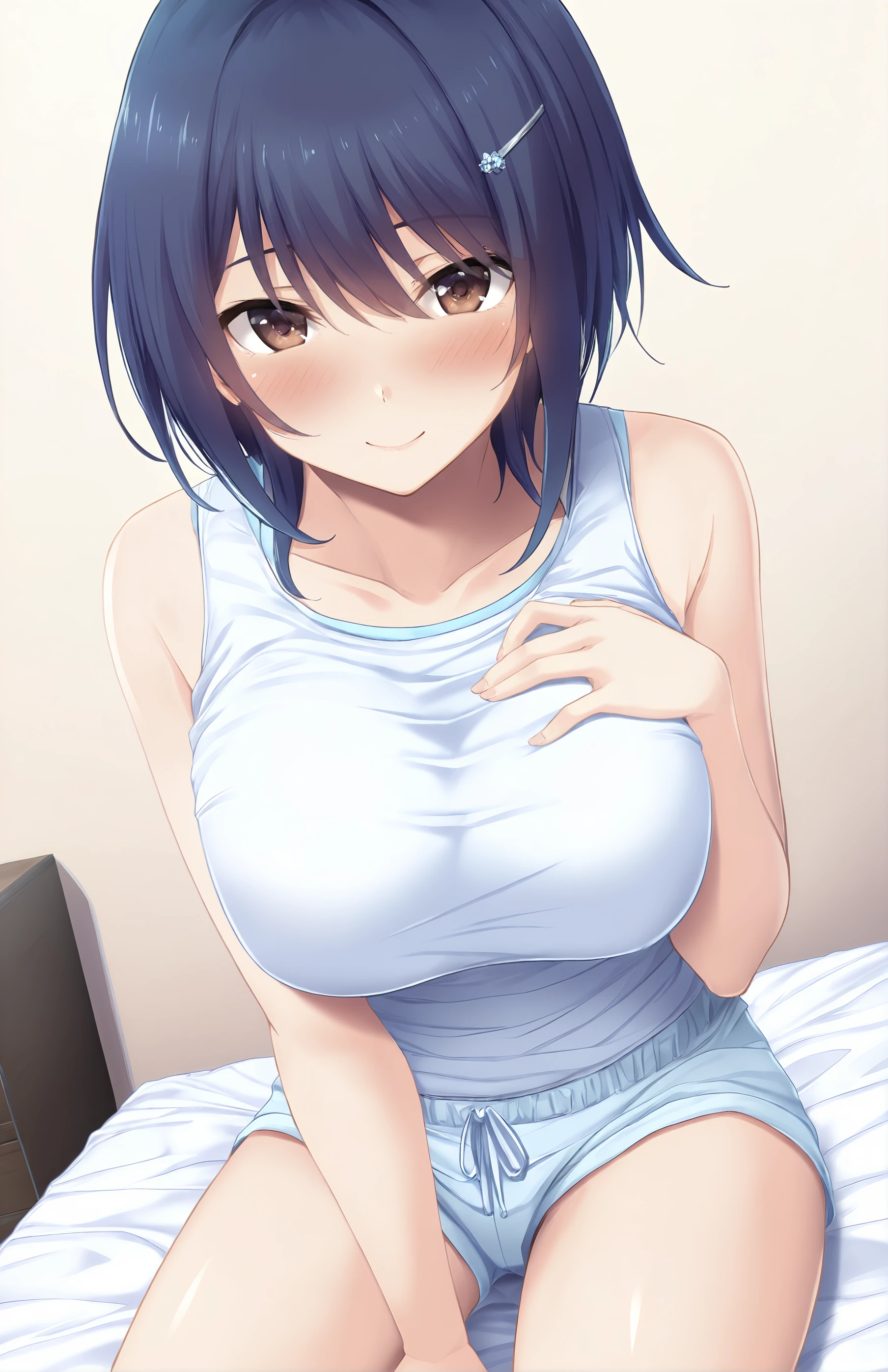 IkomaYui, breasts, short hair, large breasts, hair ornament, bare shoulders, brown eyes, dark blue hair, collarbone, shorts, white top, light blue undershirt, hairclip, short shorts, light blue shorts, tank top