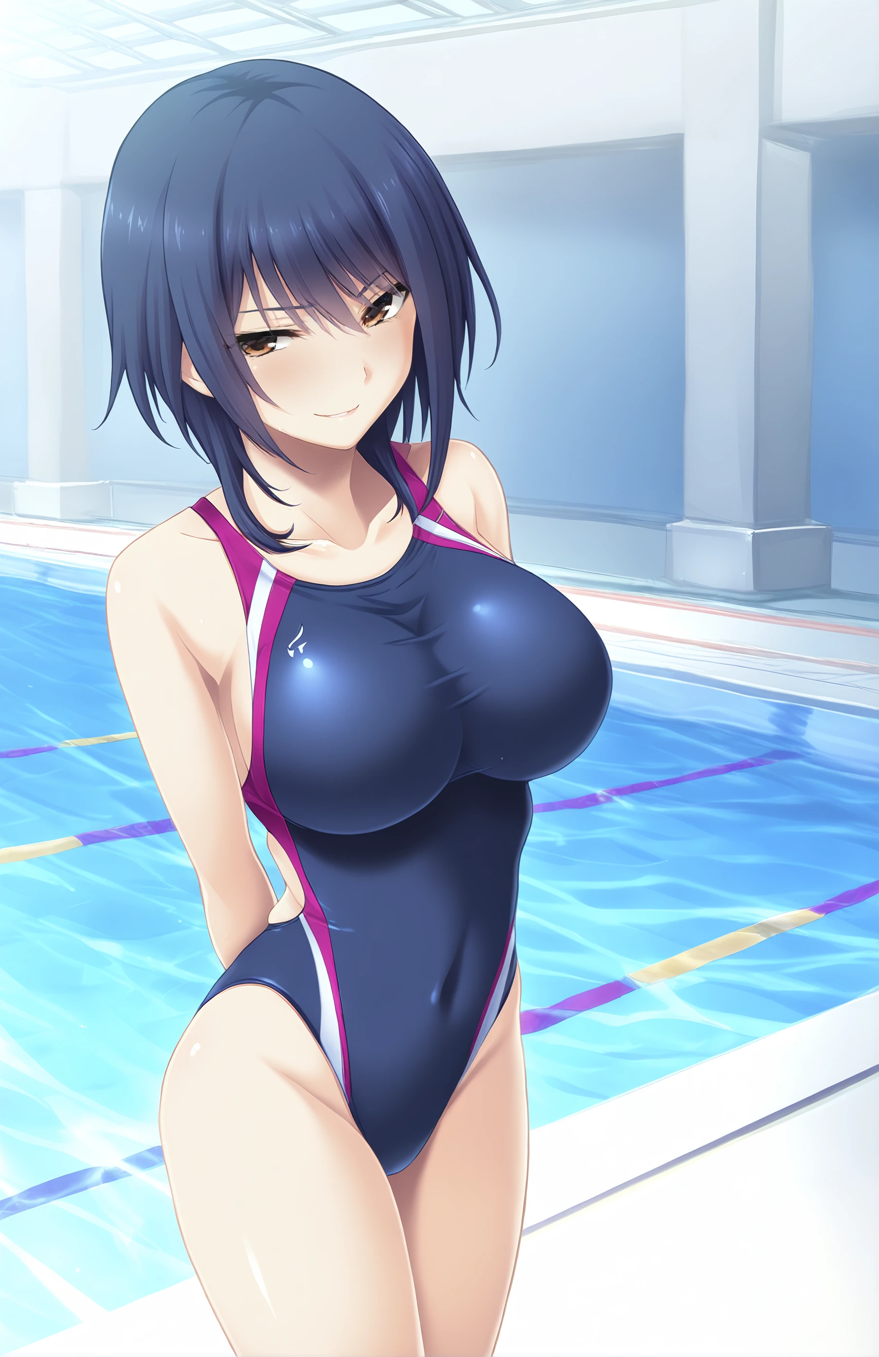 IkomaYui, breasts, short hair, large breasts, dark blue hair, brown eyes, swimsuit, one-piece swimsuit, competition swimsuit