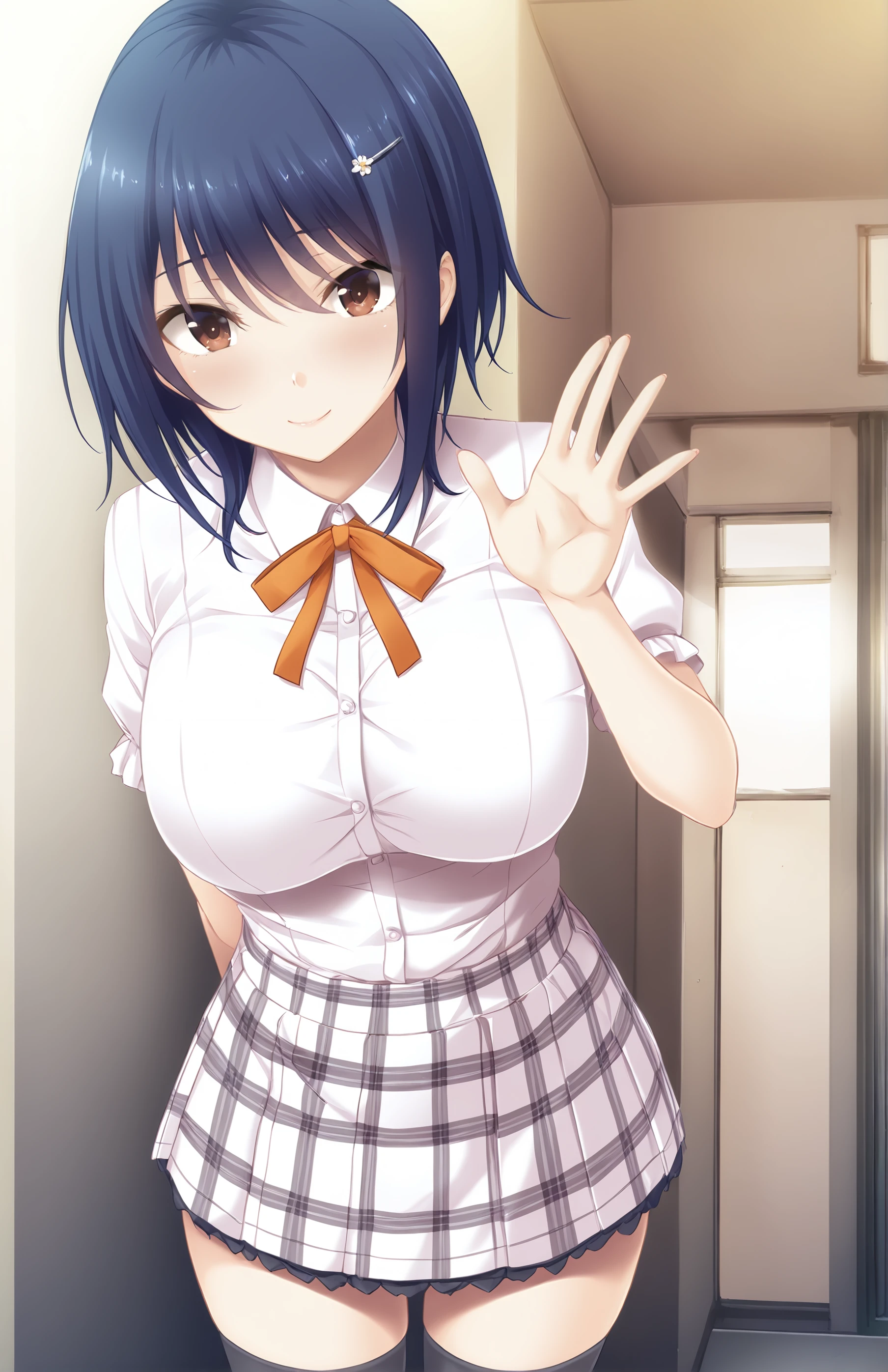 IkomaYui, breasts, short hair, skirt, large breasts, hair ornament, thighhighs, brown eyes, school uniform, orange ribbon, white shirt, collared shirt, buttons shirt, frill sleeves, dark blue hair, hairclip, black thighhighs, zettai ryouiki, white skirt, plaid skirt