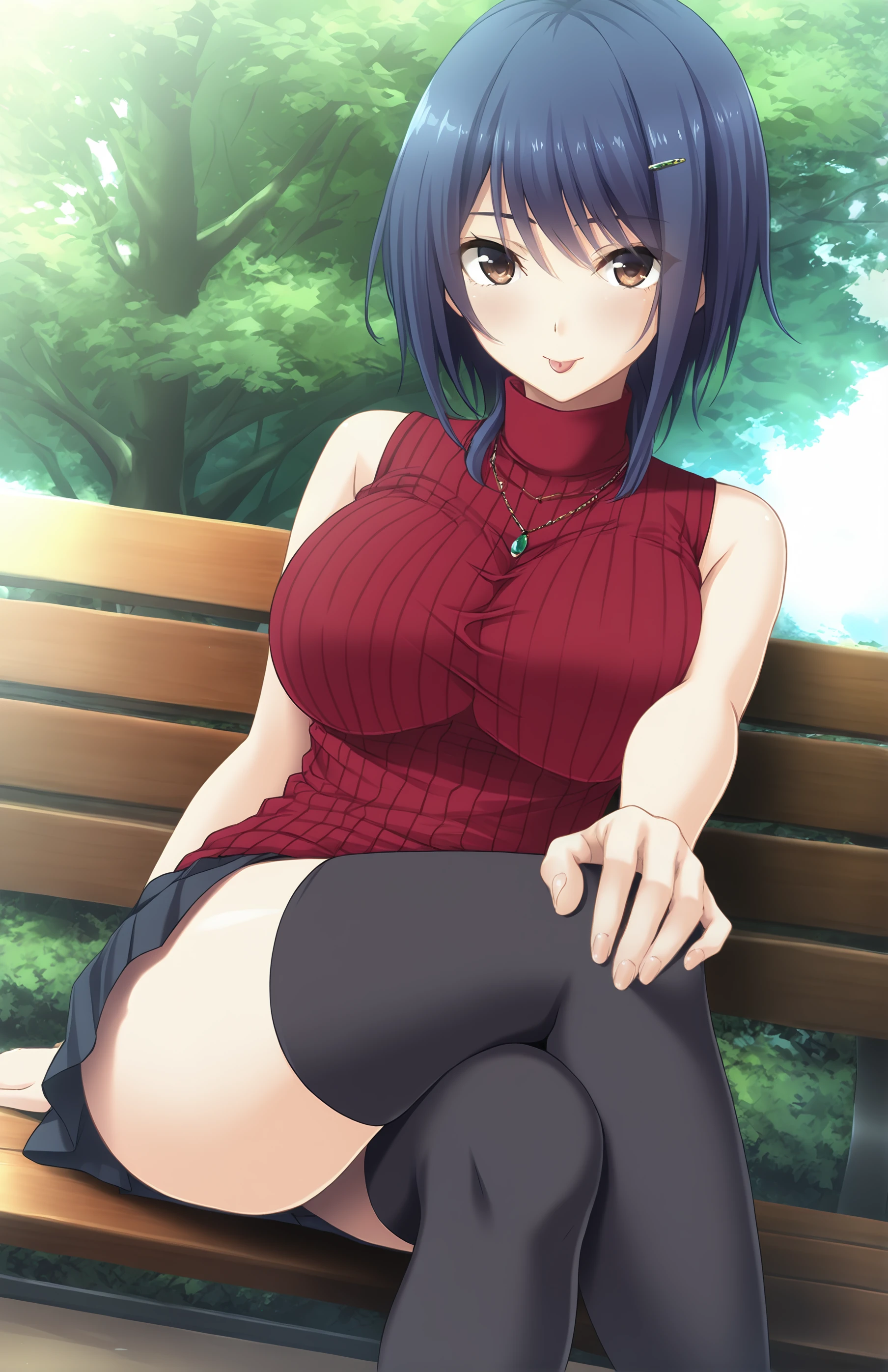 IkomaYui, breasts, short hair, bangs, skirt, large breasts, hair ornament, thighhighs, bare shoulders, brown eyes, jewelry, dark blue hair, pleated skirt, sleeveless, hairclip, black thighhighs, miniskirt, black skirt, necklace, sweater, zettai ryouiki, turtleneck, ribbed sweater, sleeveless turtleneck, red sweater