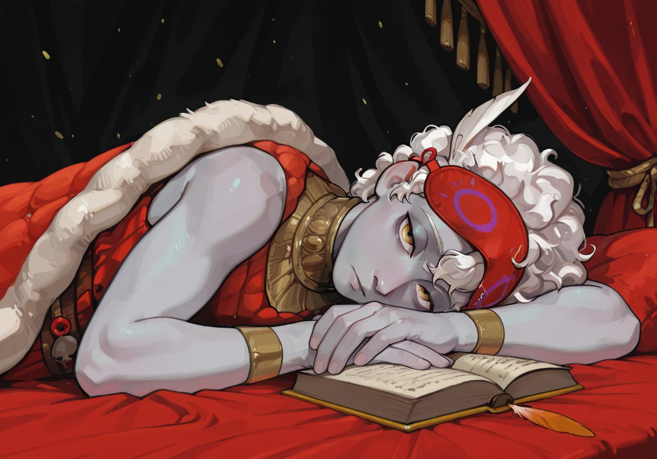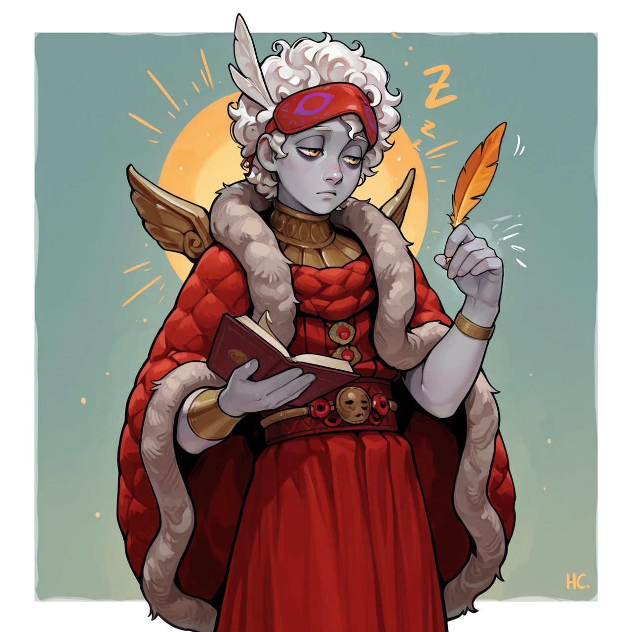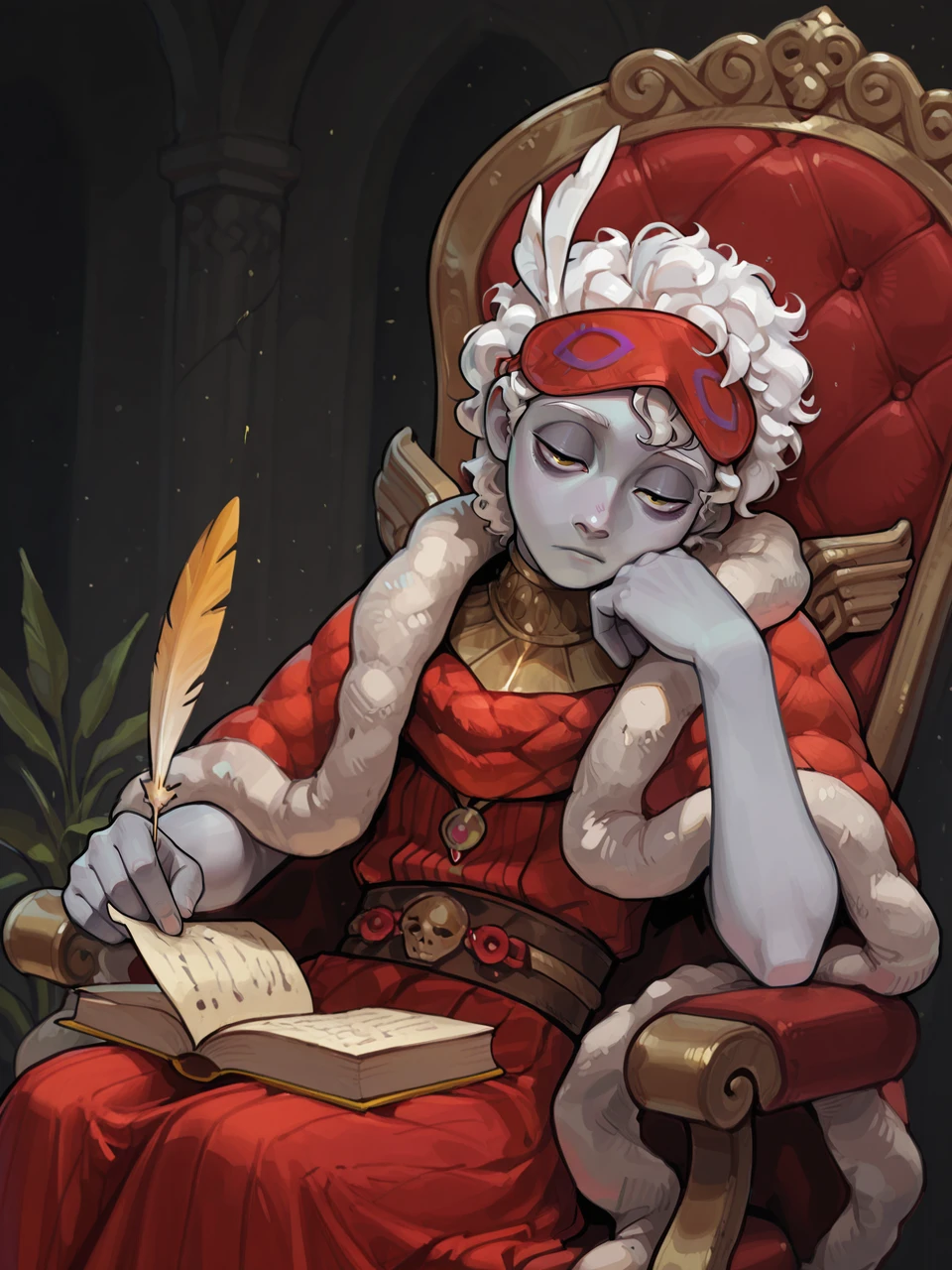The base trigger prompts is: hypnos, yellow eyes, bags under eyes, sleeping mask headband, grey skin, white hair, curly hair.