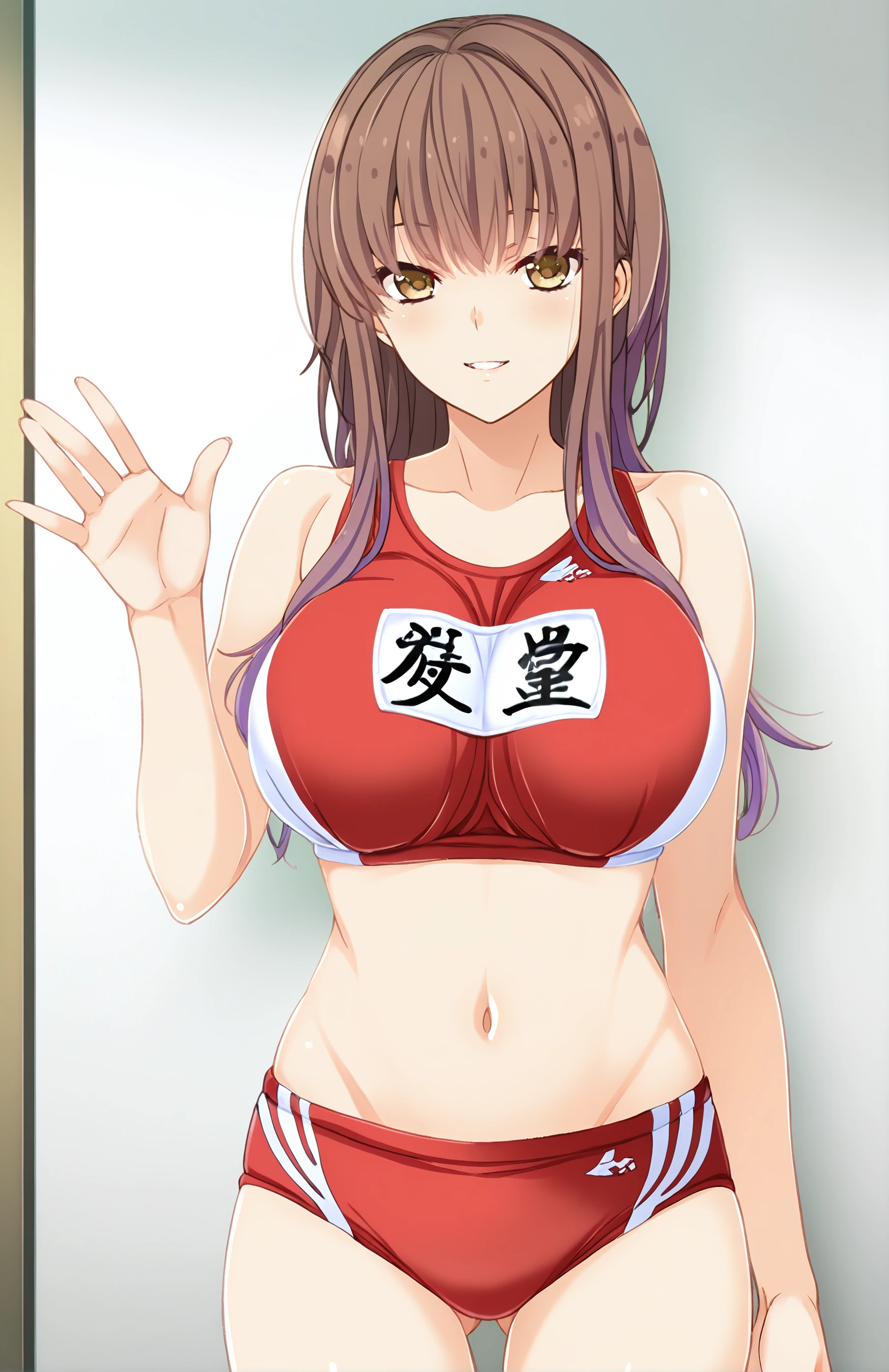 TakanezawaHonami, long hair, breasts, bangs, large breasts, brown hair, navel, bare shoulders, brown eyes, collarbone, midriff, ass visible through thighs, red buruma, red top